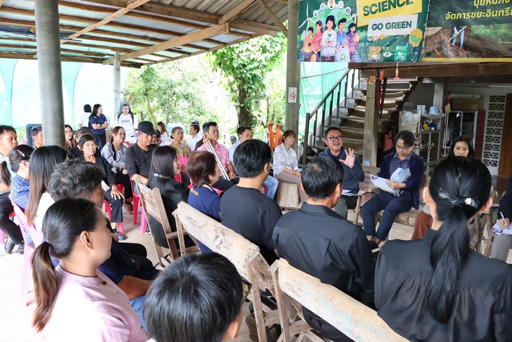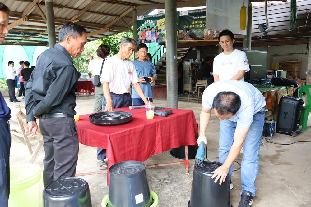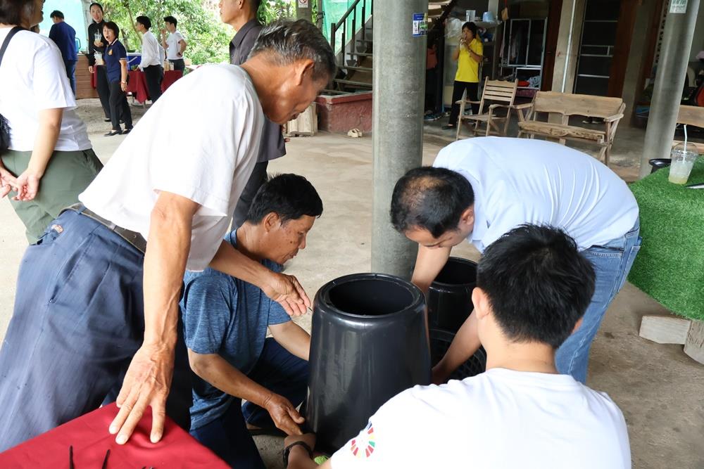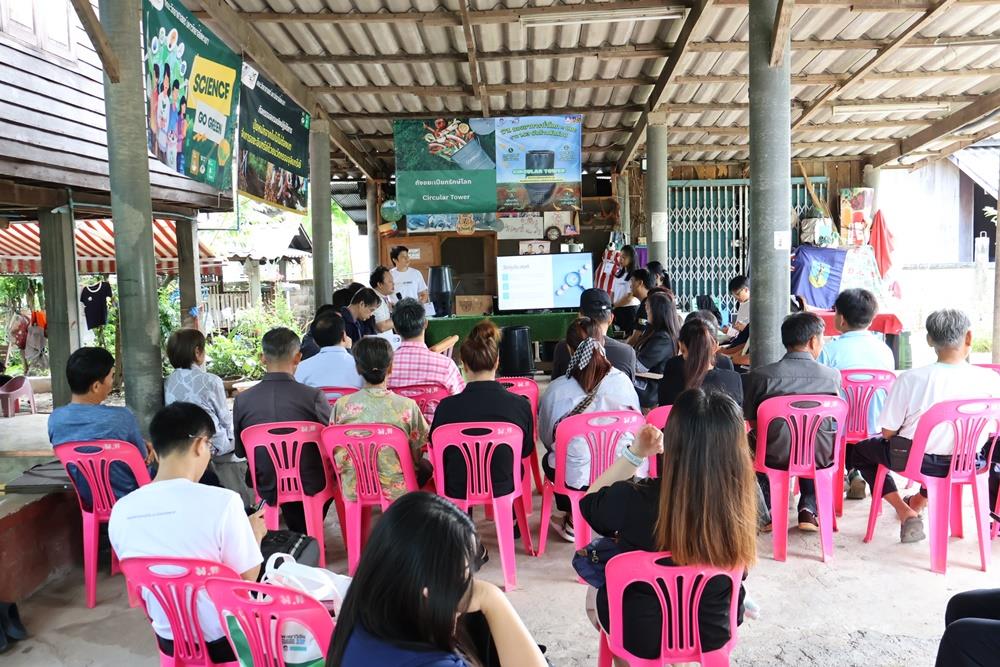 Assistant Professor Dr. Reungruthai Sirirak, Project Head, and Dr. Patcharin Tangchaisuriya, Researcher, presented an in-depth look at the project's progress and results achieved within the community. Furthermore, Dr. Niyom Hongsit demonstrated and lectured on the construction of the "Circular Tower" (eco-friendly wet waste bin), a simple innovation that concretely helps reduce greenhouse gas emissions.
