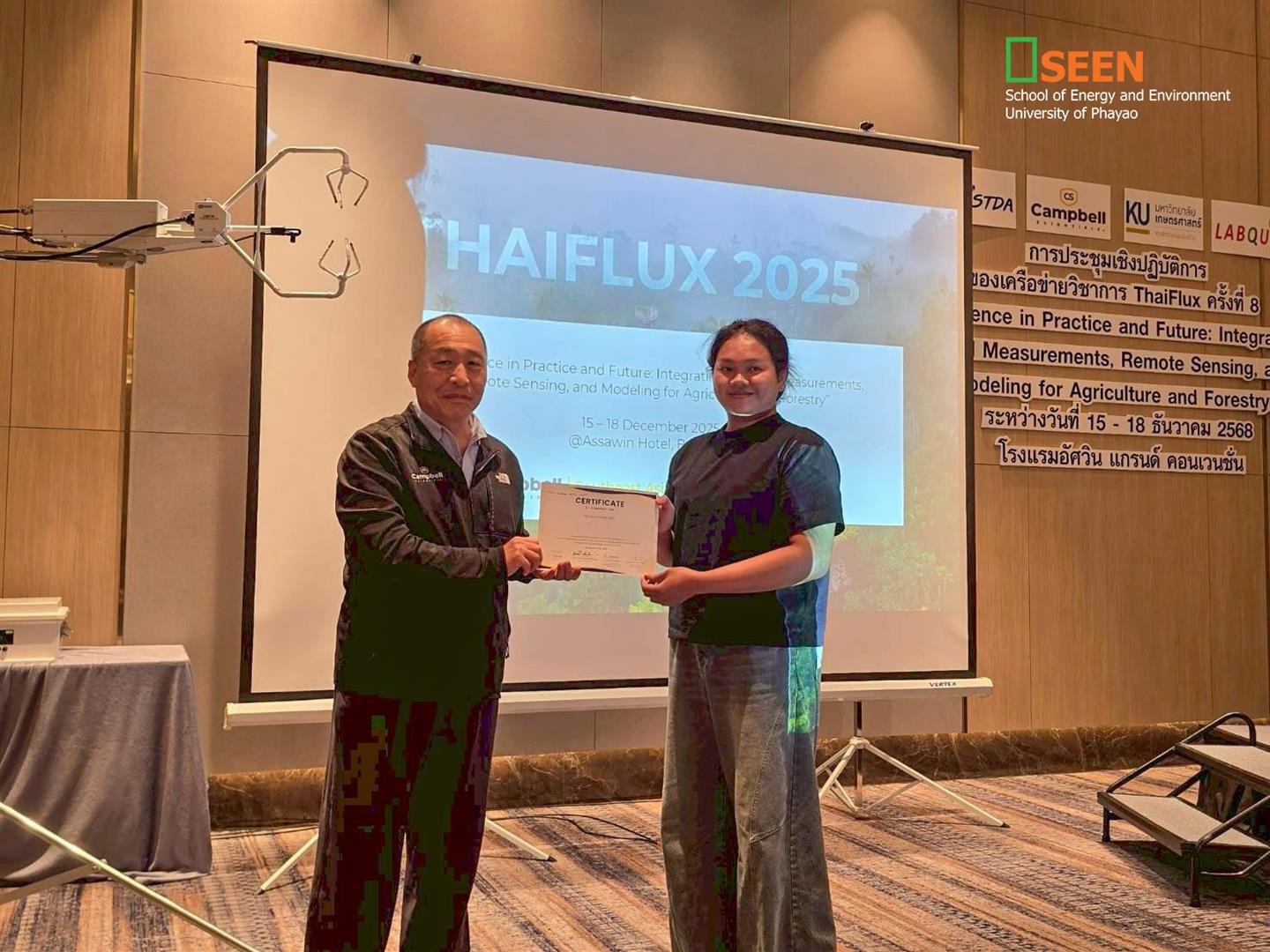 From December 15–18, 2025, Miss Pimsiri Suwannapat, Lecturer and students from the School of Energy and Environment participated the 8th Thaiflux Academic Network Workshop, entitled “Flux Science in Practice and Future: Integrating AI, Field Measurement, Remote Sensing, and Modeling for Agriculture and Forestry.” The workshop was held in collaboration with senior researchers from GISTDA, Campbell Scientific, and Kasetsart University, with the objective of exchanging knowledge on air quality measurement using the eddy covariance technique. On this occasion, three students presented their research in poster format, as follows: