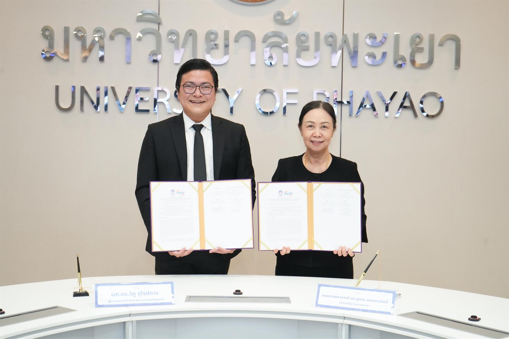 The Memorandum of Understanding (MOU) aims to promote and strengthen academic cooperation, as well as facilitate the exchange of knowledge and expertise in the fields of astronomy, science, technology, and related areas. During the signing ceremony, Associate Professor Dr. Supakorn Phongbangpho, on behalf of the University of Phayao, delivered a welcome address and co-signed the agreement. Dr. Wiphu Rujopakarn, Director of the National Astronomical Research Institute of Thailand (NARIT), represented NARIT and signed the MOU.