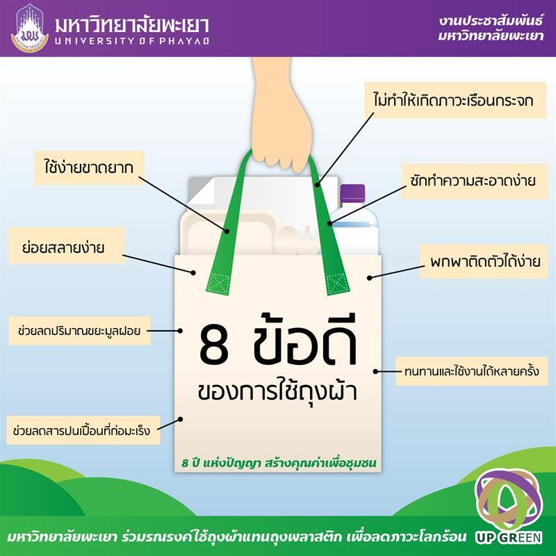 การรณรงค์งดใช้ถุงพลาสติกเริ่มต้นเมื่อวันที่ 1 มกราคม 2563 กระทรวงทรัพยากรธรรมชาติและสิ่งแวดล้อม (ทส.) สร้างความร่วมมือกับกับภาคธุรกิจ เอกชน ห้างสรรพสินค้า ร้านสะดวกซื้อ และตลาดสดทั่วประเทศ ภายใต้โครงการทำความดีด้วยหัวใจ ลดภัยสิ่งแวดล้อม โดยการแนะนำให้ลูกค้านำถุงผ้ามาจากบ้านมาใส่สินค้าที่ตนเองซื้อด้วย เพื่อเป็นการลดการใช้ถุงพลาสติกแบบหูหิ้วได้มากกว่า 2,000 ล้านใบ หรือประมาณ 5.7 ล้านกิโลกรัม คิดเป็นมูลค่ากว่า 400 ล้านบาท โดยก่อนหน้านี้ทางมหาวิทยาลัยได้จัดกิจกรรม “มหาวิทยาลัยพะเยา ร่วมใจงดรับถุงพลาสติก” เมื่อวันที่ 4 ธันวาคม 2562 ที่ผ่านมา เริ่มงดรับถุงพลาสติกแบบใช้ครั้งเดียวทิ้งตามร้านค้าในโรงอาหารและร้านสะดวกซื้อ เป็นกิจกรรมที่กระตุ้นและสร้างจิตสำนึกให้บุคลากรและนิสิตมหาวิทยาลัยพะเยา ได้ตระหนักถึงปัญหาที่เป็นผลกระทบจากขยะพลาสติก ซึ่งปี 2563 นี้ถือเป็นก้าวแรกที่สำคัญในการอนุรักษ์สิ่งแวดล้อม ลดมลพิษจากพลาสติก เพื่อสิ่งแวดล้อมที่ดีของบุคลากรและนิสิตของมหาวิทยาลัยพะเยา