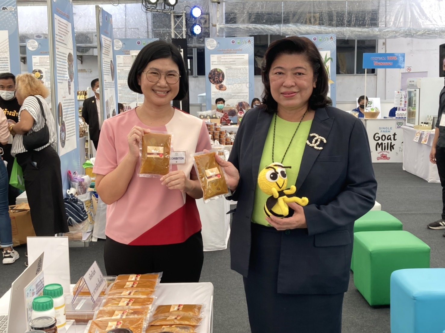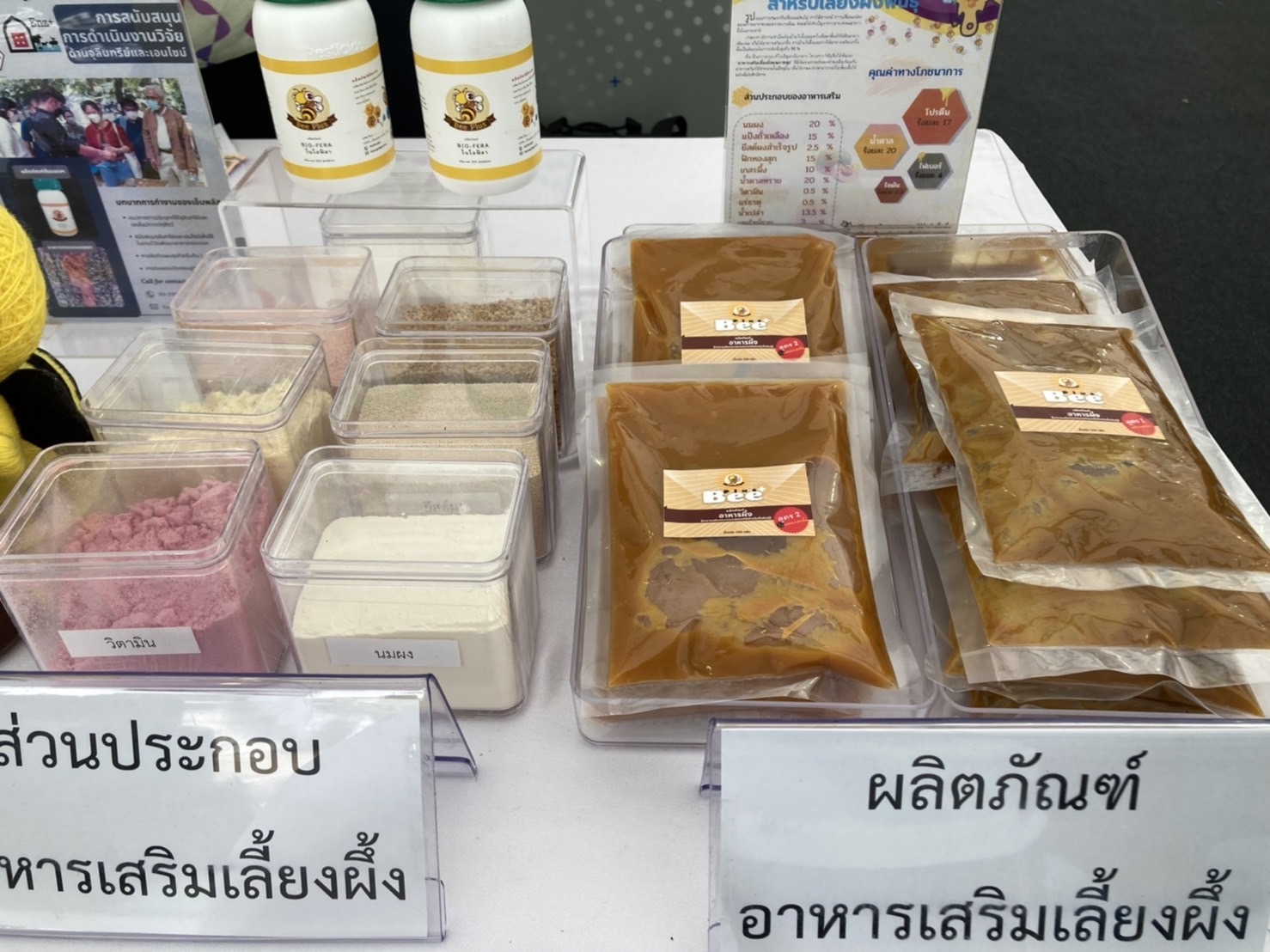 นำเสนอผลงานวิจัยและผลิตภัณฑ์อาหารเสริมทดแทนเกสรดอกไม้สำหรับผึ้งพันธุ์ ผลงานวิจัยจากนักวิจัยคณะเกษตรศาสตร์ฯ มหาวิทยาลัยพะเยา โดยผลงานนี้มีนักวิจัยร่วมโครงการ คือ รศ.ดร.โชค โสรัจกุล, ดร.รวิสรา รื่นไวย์ และ ดร.ขรรค์ชัย ดั้นเมฆ ร่วมกับมหาวิทยาลัยเชียงใหม่ สำนักพัฒนาอาหารสัตว์ กรมปศุสัตว์ และ การผลิตผลงานวิจัยเชิงพาณิชย์ภายใต้ความร่วมมือกับ บริษัทเอ็นพลัส อะโกร จำกัด