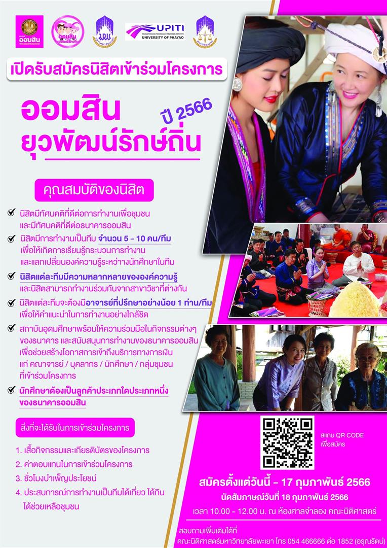 ขอเชิญชวน นิสิต สมัครเข้าร่วมโครงการ “ออมสินยุวพัฒน์รักษ์ถิ่น” ประจำปีงบประมาณ พ.ศ.2566ใช้จิตอาสา พัฒนาชุมชน พร้อมทั้งเก็บเกี่ยวประสบการณ์ในการทำกิจกรรมดีๆเรียนสาขาไหนก็ได้ ไม่จำเป็นต้องอยู่คณะนิติศาสตร์- - สมัครตั้งแต่วันนี้ - วันที่ 17 กุมภาพันธ์ 2566