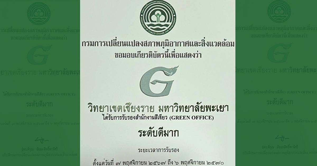 กรมการเปลี่ยนแปลงสภาพภูมิอากาศและสิ่งแวดล้อม มอบเกียรติบัตรให้กับ วิทยาเขตเชียงราย มหาวิทยาลัยพะเยา เพื่อแสดงว่าได้รับการรับรองสำนักงานสีเขียว (GREEN OFFICE) ระดับดีมาก โดยมีระยะเวลาการรับรองตั้งแต่ 7 พฤศจิกายน 2567 ถึง 6 พฤศจิกายน 2570 รางวัลสำนักงานสีเขียว (GREEN OFFICE) นี้ วิทยาเขตเชียงรายได้ดำเนินงานในปีงบประมาณ พ.ศ. 2567 ตามเกณฑ์การประเมิน 6 หมวด ผ่านการรณรงค์ทั่วทั้งองค์กร ตามหัวข้อ มีนโยบาย มีจิตสำนึก รู้จักประหยัด ลดของเสีย มีความน่าอยู่ และใช้สินค้าฉลากเขียว