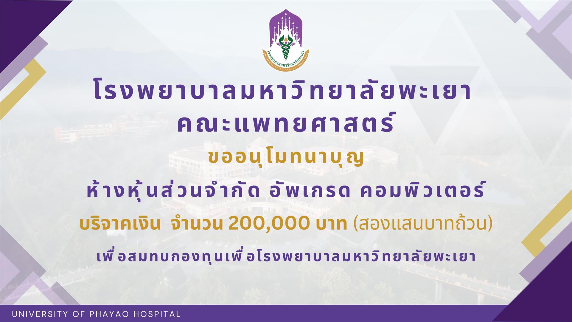 โรงพยาบาลมหาวิทยาลัยพะเยา คณะแพทยศาสตร์ ขออนุโมทนาบุญกับ ห้างหุ้นส่วนจำกัด อัพเกรด คอมพิวเตอร์ บริจาคเงินสมทบเข้า กองทุนเพื่อโรงพยาบาลฯ
