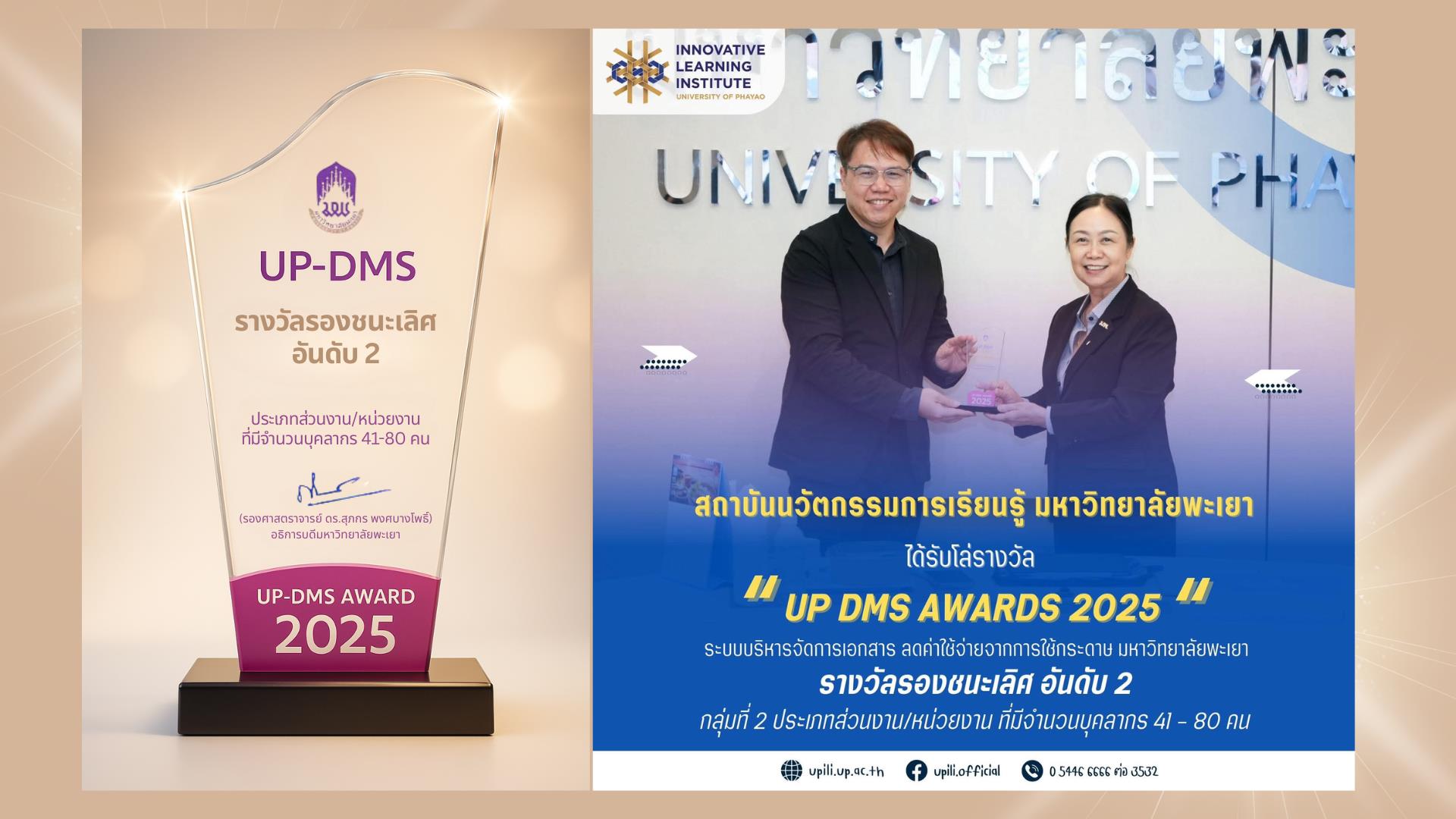 ในด้านการบริหารจัดการองค์กร สถาบันสถาบันนวัตกรรมการเรียนรู้ ได้รับ “รางวัลรองชนะเลิศอันดับ 2” จากโครงการ UP DMS Awards 2025 ประเภทหน่วยงานที่มีบุคลากร 41 – 80 คน ด้วยการพัฒนาระบบบริหารจัดการเอกสาร (Document Management System) ที่ช่วยลดการใช้กระดาษ เพิ่มประสิทธิภาพการทำงาน และส่งเสริมการใช้ทรัพยากรอย่างคุ้มค่า สอดคล้องกับ SDG 12: การผลิตและบริโภคที่ยั่งยืน และแนวคิด Circular Economy ภายใต้ BCG Model