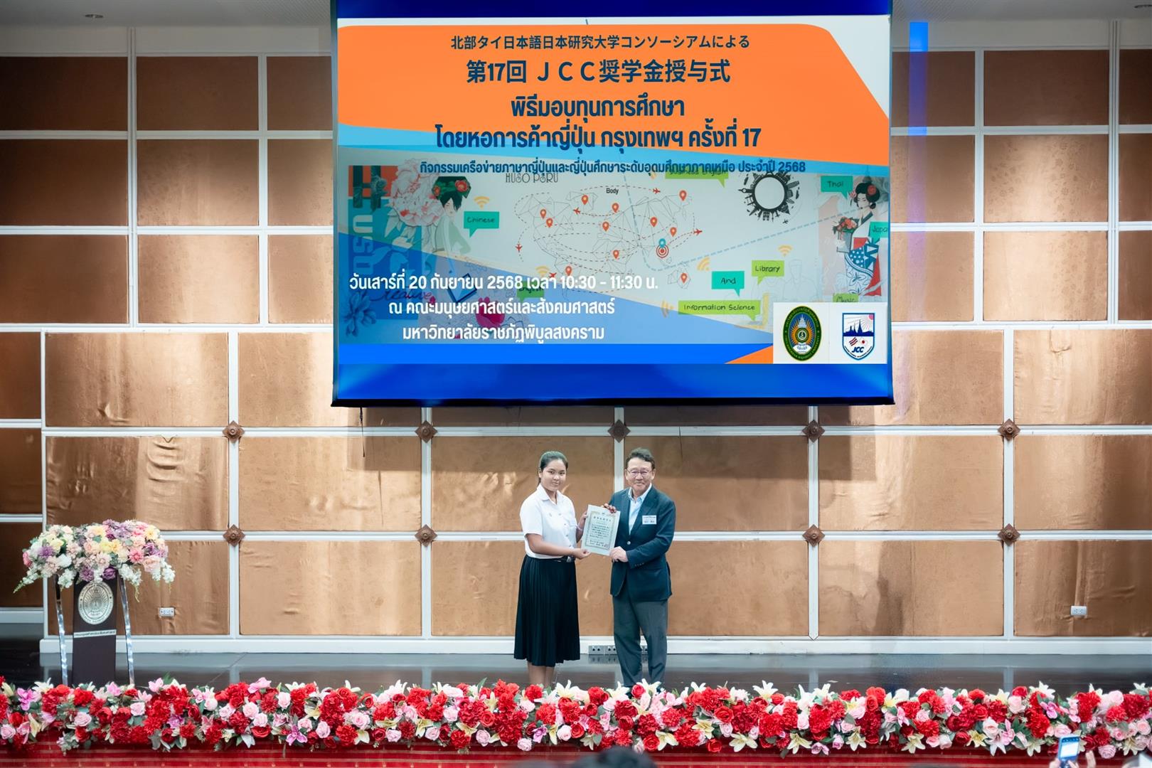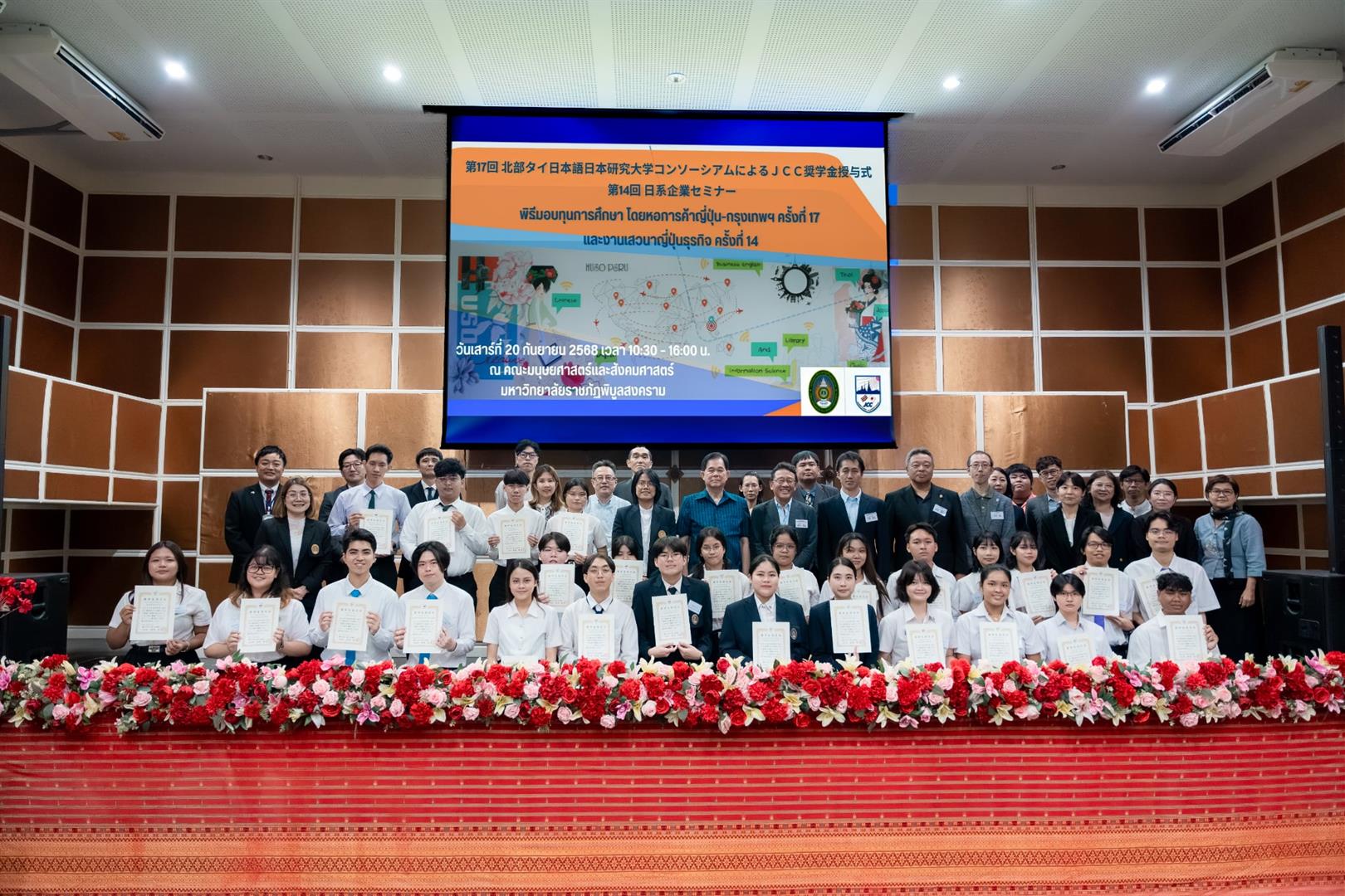 เมื่อวันเสาร์ที่ 20 กันยายน 2568 สาขาวิชาภาษาญี่ปุ่น คณะศิลปศาสตร์ มหาวิทยาลัยพะเยา ได้เข้าร่วม พิธีมอบทุนการศึกษา โดยหอการค้าญี่ปุ่น กรุงเทพฯ (JCC) ครั้งที่ 17 และ งานเสวนาญี่ปุ่นธุรกิจ ครั้งที่ 14 ซึ่งจัดขึ้นโดยเครือข่ายภาษาญี่ปุ่นและญี่ปุ่นศึกษา ระดับอุดมศึกษาภาคเหนือ (NTUCJ) ณ อาคารคณะมนุษยศาสตร์และสังคมศาสตร์ มหาวิทยาลัยราชภัฏพิบูลสงคราม (ส่วนทะเลแก้ว) จ.พิษณุโลก เพื่อเสริมสร้างเครือข่ายด้านการเรียนการสอนภาษาญี่ปุ่น ระดับอุดมศึกษาภาคเหนือ รวมถึงเพื่อเตรียมความพร้อมในการทำงานด้านธุรกิจญี่ปุ่นแก่นิสิต โดยมีนิสิตสาขาวิชาภาษาญี่ปุ่น ชั้นปีที่ 3 คณะศิลปศาสตร์ เข้ารับทุนการศึกษา จำนวน 4 ราย ประกอบด้วย 1) นางสาวชนาภา ทวีสัตย์ 2) นางสาวองค์อร สกุลแก้ว 3) นางสาวพรปวีณ์ ศรีเสริม และ 4) นายวชิรวิทย์ รักเวช