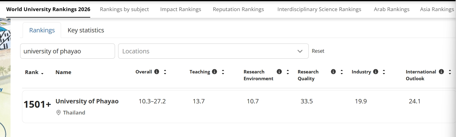 โดยการจัดอันดับ Times Higher Education ในปีนี้ มหาวิทยาลัยพะเยา มีภาพรวมของคะแนนที่เป็นตัวชี้วัด 5 ด้าน ดังนี้