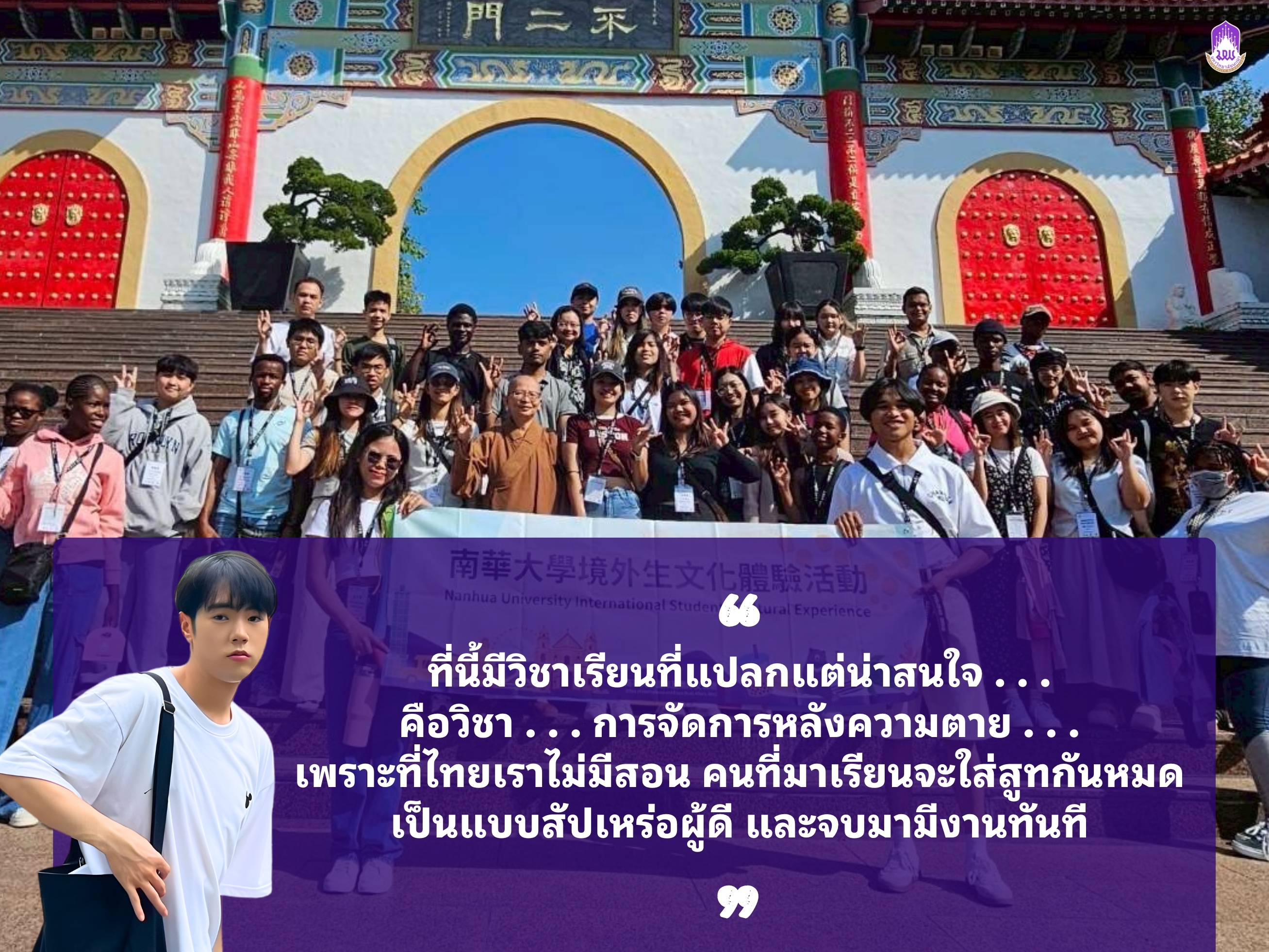 น้องแบงค์เล่าว่าได้เรียนวิชาหนึ่งที่น่าสนใจ คือการสอนผ่านการร้องเพลงภาษาอังกฤษเพื่อสอนเด็ก ให้เด็กทำกิจกรรมไปด้วยแล้วได้ความรู้ไปในตัว ซึ่งที่มหาวิทยาลัยพะเยาหรือในไทยไม่น่าจะมี และน้องหมิวเสริมว่าวิชาที่นั่นน่าสนใจเยอะมาก แต่แปลกที่สุดคือ “วิชาการจัดการหลังความตาย” เพราะมหาวิทยาลัยหนานฮัว ได้รับทุนจากวัดฝอกวงซาน จึงมีวิชาเกี่ยวพุทธศาสนาเฉพาะทาง นักศึกษาเรียนรู้การจัดการเมื่อมีคนเสียชีวิต ทำพิธียังไง สวดมนต์ยังไง พูดคุยกับครอบครัวผู้เสียชีวิตให้เหมาะสม จัดงานให้สมเกียรติ