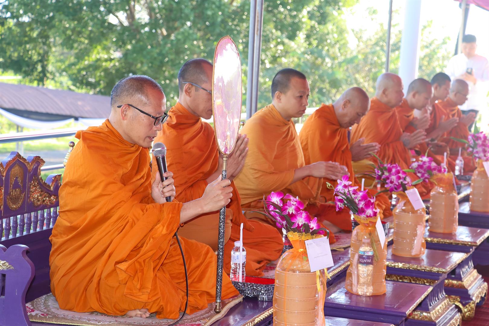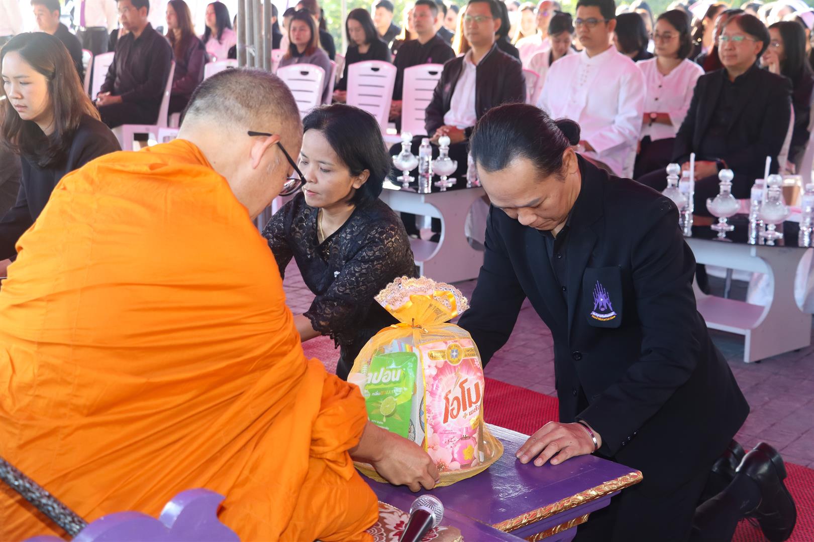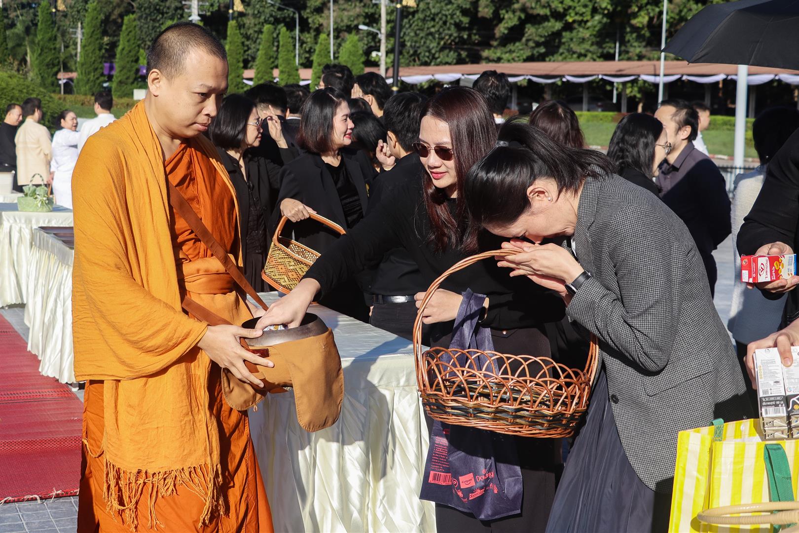 The ceremony was presided over by Dr. Wuttichai Chairinrum, Vice President for Student Quality. University executives, deans, assistant presidents, division heads, staff, students, alumni, and local community members joined together in offering dry food to eight monks from Wisuddhimagga Meditation Center and Ban So Temple, expressing deep gratitude and remembrance for the royal benevolence.