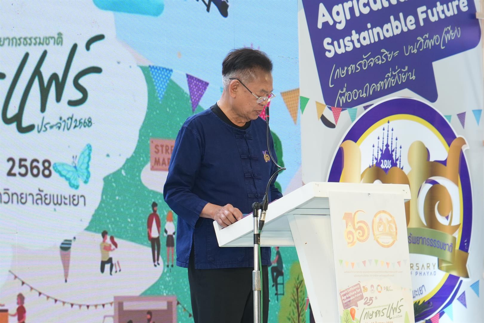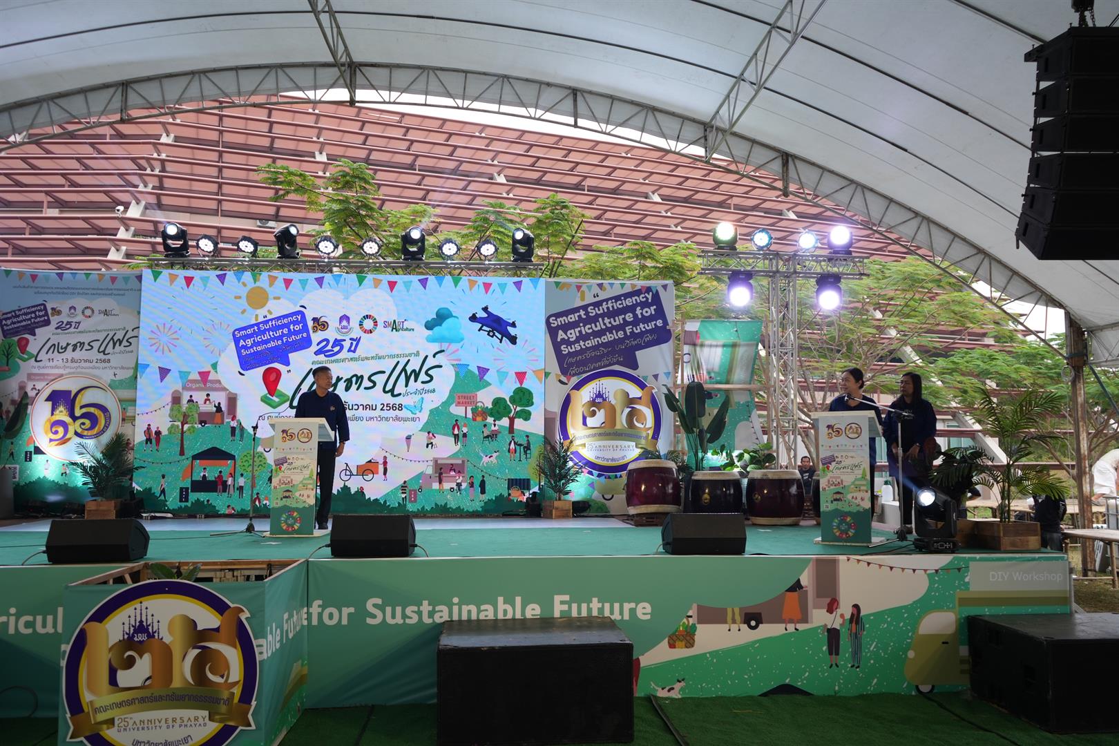 วันศุกร์ที่ 12 ธันวาคม 2568 ณ ศูนย์การเรียนรู้เศรษฐกิจพอเพียง มหาวิทยาลัยพะเยา จัดพิธีเปิดงาน “Smart Sufficiency Agriculture for Sustainable Future” และโครงการ “เกษตรแฟร์ 25 ปี คณะเกษตรศาสตร์และทรัพยากรธรรมชาติ” นำโดย ศาสตราจารย์พิเศษอรรถพล ใหญ่สว่าง นายกสภามหาวิทยาลัยพะเยา ประธานในพิธี พร้อมด้วย รองศาสตราจารย์ ดร.สุภกร พงศบางโพธิ์ อธิการบดีมหาวิทยาลัยพะเยา คณะกรรมการสภามหาวิทยาลัย และคณะผู้บริหารมหาวิทยาลัยพะเยา จากนั้น ผู้ช่วยศาสตราจารย์ ดร.วิพรพรรณ์ เนื่องเม็ก คณบดีคณะเกษตรศาสตร์และทรัพยากรธรรมชาติ ได้นำเสนอรายละเอียดการจัดงาน “เกษตรแฟร์ 25 ปี” ซึ่งจัดขึ้นระหว่างวันที่ 11–13 ธันวาคม 2568 ภายใต้แนวคิด “Smart Sufficiency Agriculture for Sustainable Future – เกษตรอัจฉริยะ บนวิถีพอเพียง เพื่ออนาคตที่ยั่งยืน” ภายหลังพิธีเปิด ศาสตราจารย์พิเศษอรรถพล ใหญ่สว่าง นายกสภามหาวิทยาลัยพะเยา ประธานในพิธี พร้อมด้วย รองศาสตราจารย์ ดร.สุภกร พงศบางโพธิ์ อธิการบดีมหาวิทยาลัยพะเยา คณะกรรมการสภามหาวิทยาลัย และคณะผู้บริหารมหาวิทยาลัยพะเยา ได้เยี่ยมชมนิทรรศการและแปลงผักปลอดสารพิษ พร้อมเก็บพืชผักสวนครัวจากแปลงสาธิต ของคณะเกษตรศาสตร์และทรัพยากรธรรมชาติ มหาวิทยาลัยพะเยา