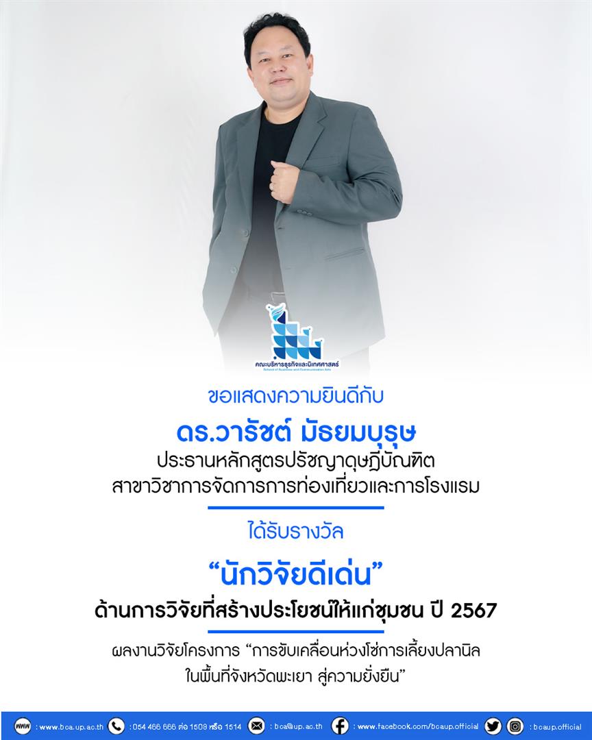 คณะบริหารธุรกิจและนิเทศศาสตร์ มหาวิทยาลัยพะเยา ขอแสดงความยินดีกับ ดร.วารัชต์ มัธยมบุรุษ ประธานหลักสูตรปรัชญาดุษฎีบัณฑิต สาขาวิชาการจัดการการท่องเที่ยวและการโรงแรม และรองผู้อำนวยการสถาบันนวัตกรรมและถ่ายทอดเทคโนโลยี ในโอกาสได้รับรางวัล “นักวิจัยดีเด่น” ด้านการวิจัยที่สร้างประโยชน์ให้แก่ชุมชน ประจำปี 2567 ทั้งนี้ นักวิจัยจะได้เข้ารับ พระราชทานโล่รางวัล ในพิธีพระราชทานปริญญาบัตร มหาวิทยาลัยพะเยา ประจำปีการศึกษา 2567