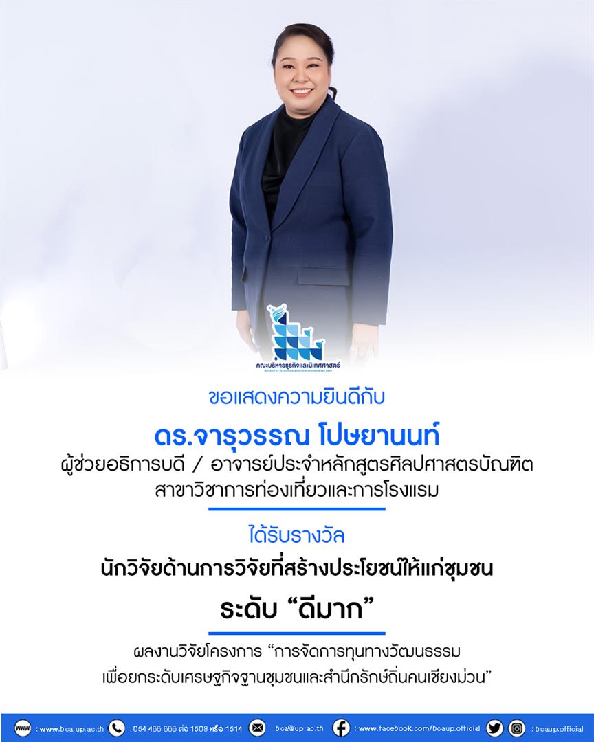 คณะบริหารธุรกิจและนิเทศศาสตร์ มหาวิทยาลัยพะเยา ขอแสดงความยินดีกับ ดร.จารุวรรณ โปษยานนท์ ผู้ช่วยอธิการบดีและอาจารย์ประจำหลักสูตรศิลปศาสตรบัณฑิต สาขาวิชาการท่องเที่ยวและการโรงแรม ในโอกาสได้รับรางวัลนักวิจัยด้านการวิจัยที่สร้างประโยชน์ให้แก่ชุมชน ระดับ “ดีมาก” ภายใต้โครงการวิจัย “การจัดการทุนทางวัฒนธรรมเพื่อยกระดับเศรษฐกิจฐานชุมชนและสำนึกรักษ์ถิ่นคนเชียงม่วน”