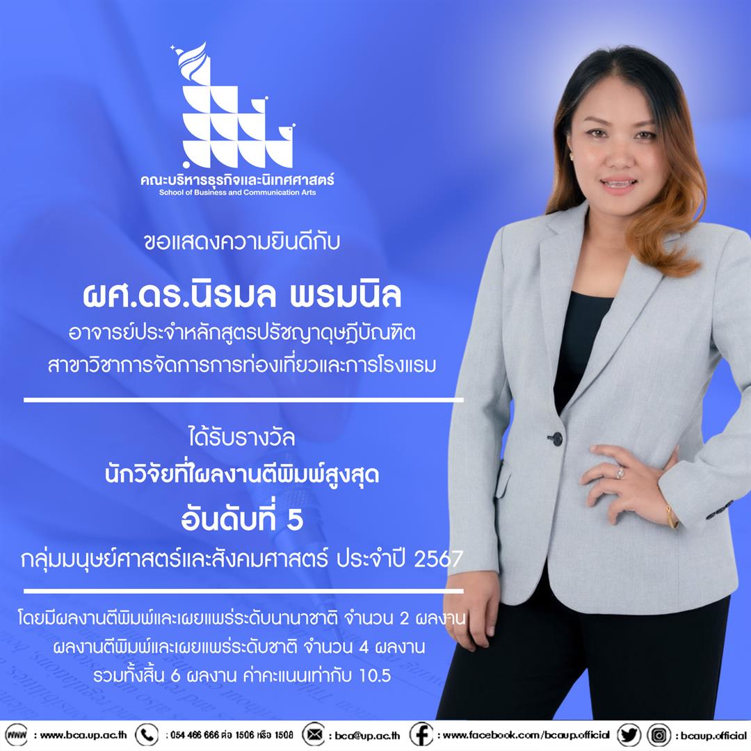 ผู้ช่วยศาสตราจารย์ ดร.นิรมล พรมนิล อาจารย์ประจำหลักสูตรปรัชญาดุษฎีบัณฑิต สาขาวิชาการท่องเที่ยวและการโรงแรม ได้รับรางวัล อันดับที่ 5 ผลงานตีพิมพ์และเผยแพร่ ระดับนานาชาติ จำนวน 2 ผลงาน ระดับชาติ จำนวน 4 ผลงาน รวมทั้งสิ้น 6 ผลงาน (ค่าคะแนน 10.5)