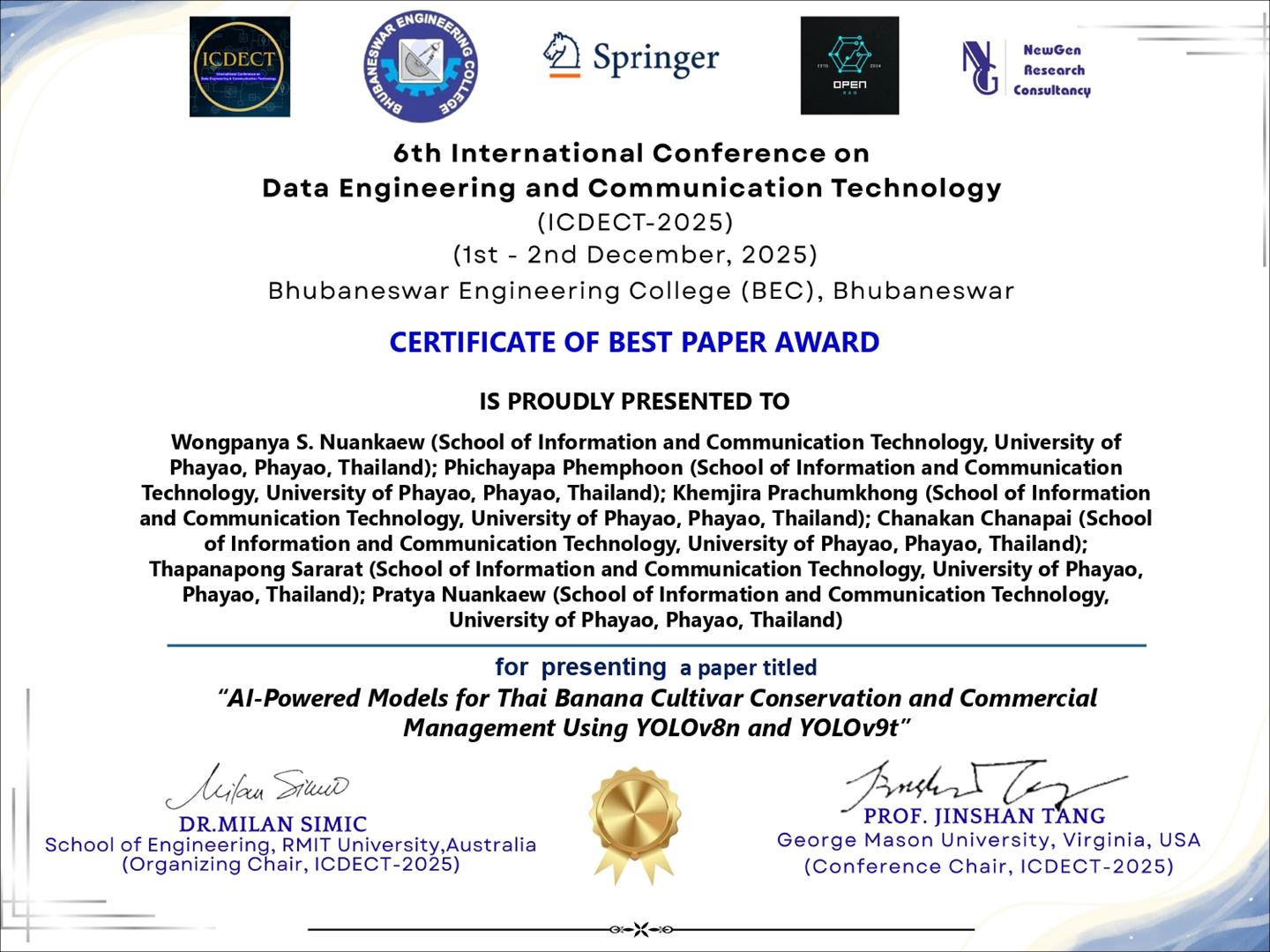 คณาจารย์และนักวิจัยจาก School of Information and Communication Technology University of Phayao ได้รับรางวัล “Best Paper Award” จากการประชุมวิชาการนานาชาติ 6th International Conference on Data Engineering and Communication Technology (ICDECT-2025) ซึ่งจัดขึ้นระหว่างวันที่ 1–2 ธันวาคม 2568 ณ เมือง Bhubaneswar รัฐ Odisha ประเทศอินเดีย