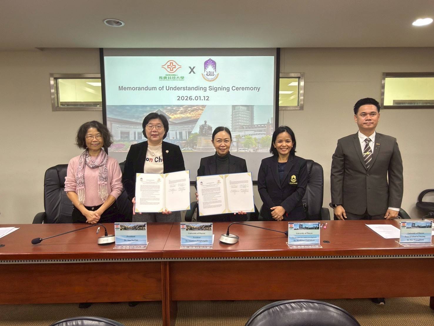 วันจันทร์ที่ 12 มกราคม 2569 รองศาสตราจารย์ ดร.สุภกร พงศบางโพธิ์ อธิการบดีมหาวิทยาลัยพะเยา พร้อมด้วยผู้บริหาร ได้แก่ ดร.วุฒิชัย ไชยรินคำ รองอธิการบดีฝ่ายกิจการนิสิต รองศาสตราจารย์ ดร.ผณินทรา ธีรานนท์ ผู้ช่วยอธิการบดี ผู้ช่วยศาสตราจารย์ ดร.ดาว เวียงคำ คณบดีคณะพยาบาลศาสตร์ รองศาสตราจารย์ ดร.สุรศักดิ์ เสาร์แก้ว คณบดีคณะเภสัชศาสตร์ และคณะผู้บริหารของทั้งสองคณะ เดินทางเยือนไต้หวันเพื่อร่วมพิธีลงนามความร่วมมือทางวิชาการ อันเป็นก้าวสำคัญในการพัฒนาการศึกษาและการวิจัยในระดับนานาชาติ