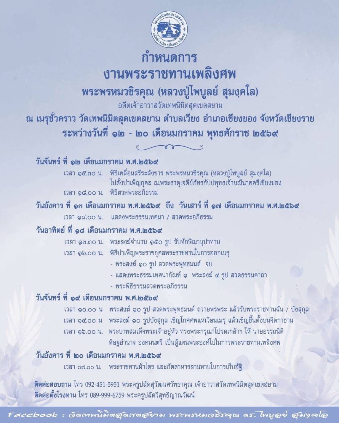 วันจันทร์ที่ ๑๙ มกราคม ๒๕๖๙ เวลา ๑๖.๐๐ น. รองศาสตราจารย์ ดร.สุภกร พงศบางโพธิ์ อธิการบดีมหาวิทยาลัยพะเยา พร้อมคณะผู้บริหาร คณาจารย์ เจ้าหน้าที่ และนิสิต ได้เข้าร่วมพิธีพระราชทานเพลิงศพ พระพรหมวชิรคุณ (หลวงปู่ไพบูลย์ สุมงฺคโล) อดีตเจ้าอาวาสวัดเทพนิมิตสุดเขตสยาม ณ เมรุชั่วคราว วัดเทพนิมิตสุดเขตสยาม ตำบลเวียง อำเภอเชียงของ จังหวัดเชียงราย
