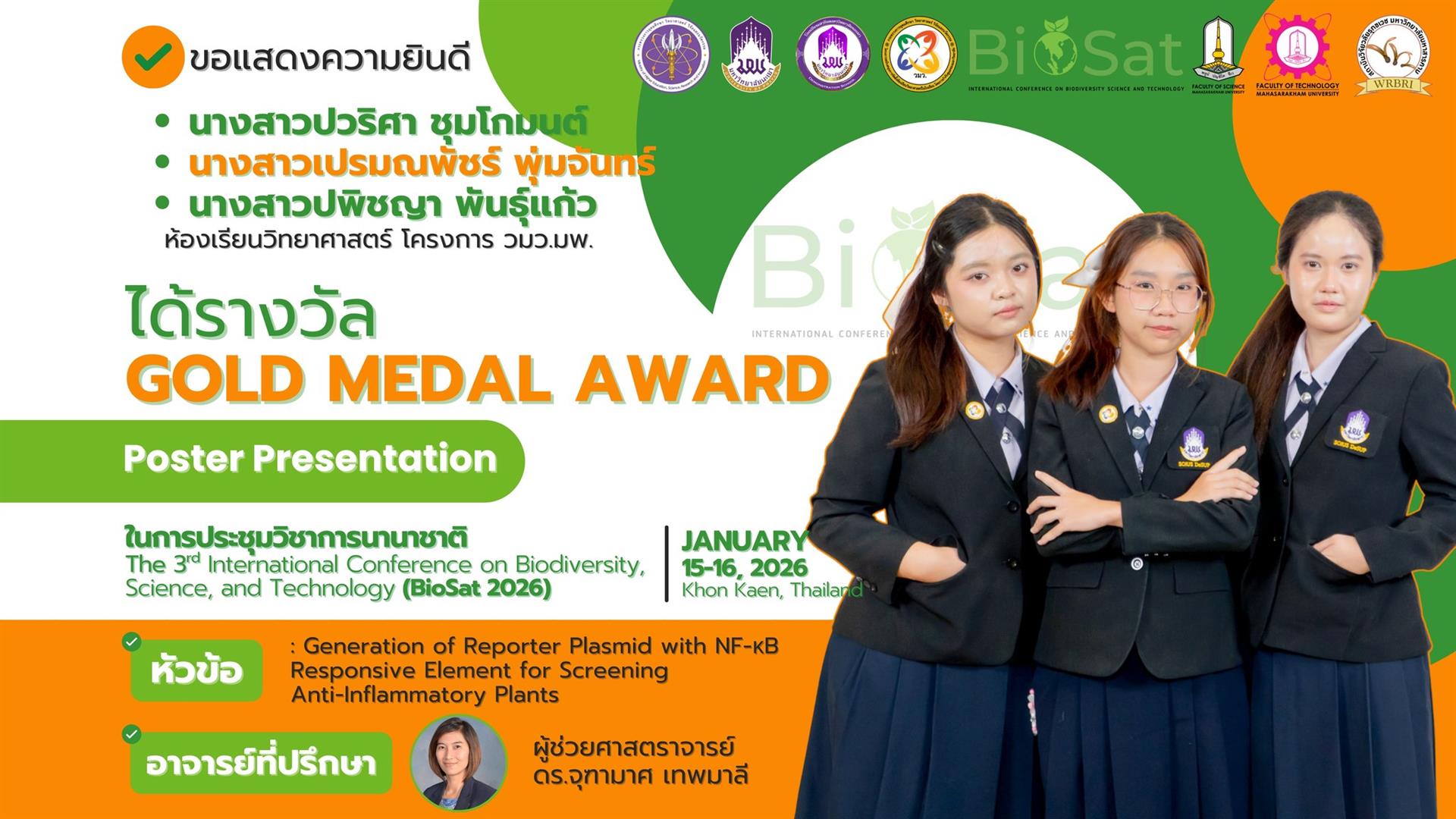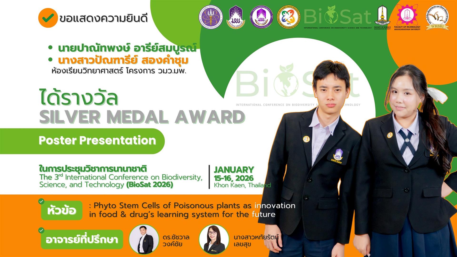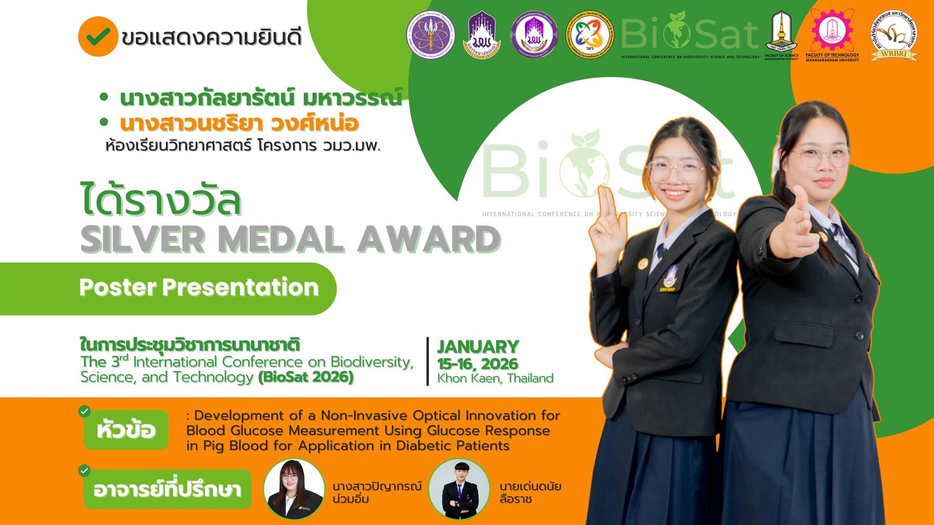 นักเรียนโรงเรียนสาธิตมหาวิทยาลัยพะเยา สร้างชื่อเสียงในเวทีระดับนานาชาติ คว้า 11 เหรียญรางวัลจากการนำเสนอผลงานในการประชุมวิชาการนานาชาติ International Conference on Biodiversity, Science, and Technology (BioSat 2026) ซึ่งจัดขึ้นระหว่างวันที่ 15 - 16 มกราคม 2569 ณ โรงแรมอวานี ขอนแก่น โฮเทล แอนด์ คอนเวนชั่น เซ็นเตอร์ จังหวัดขอนแก่น ประเทศไทย