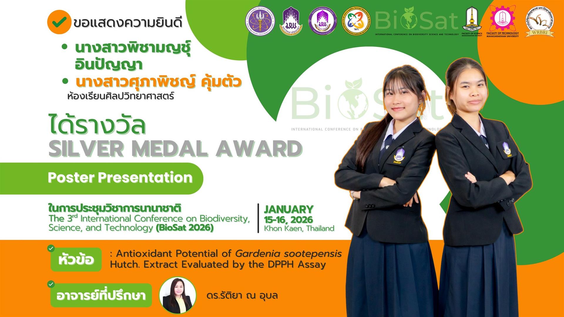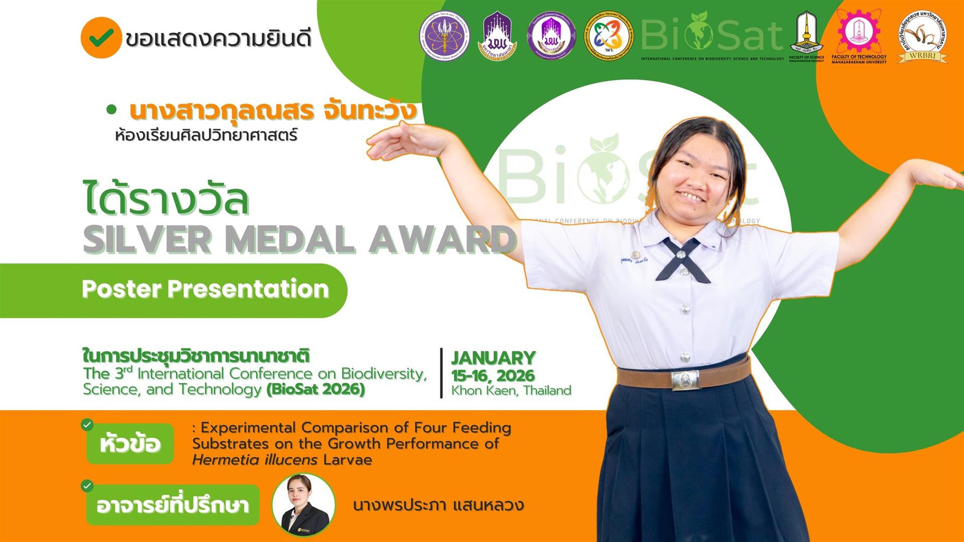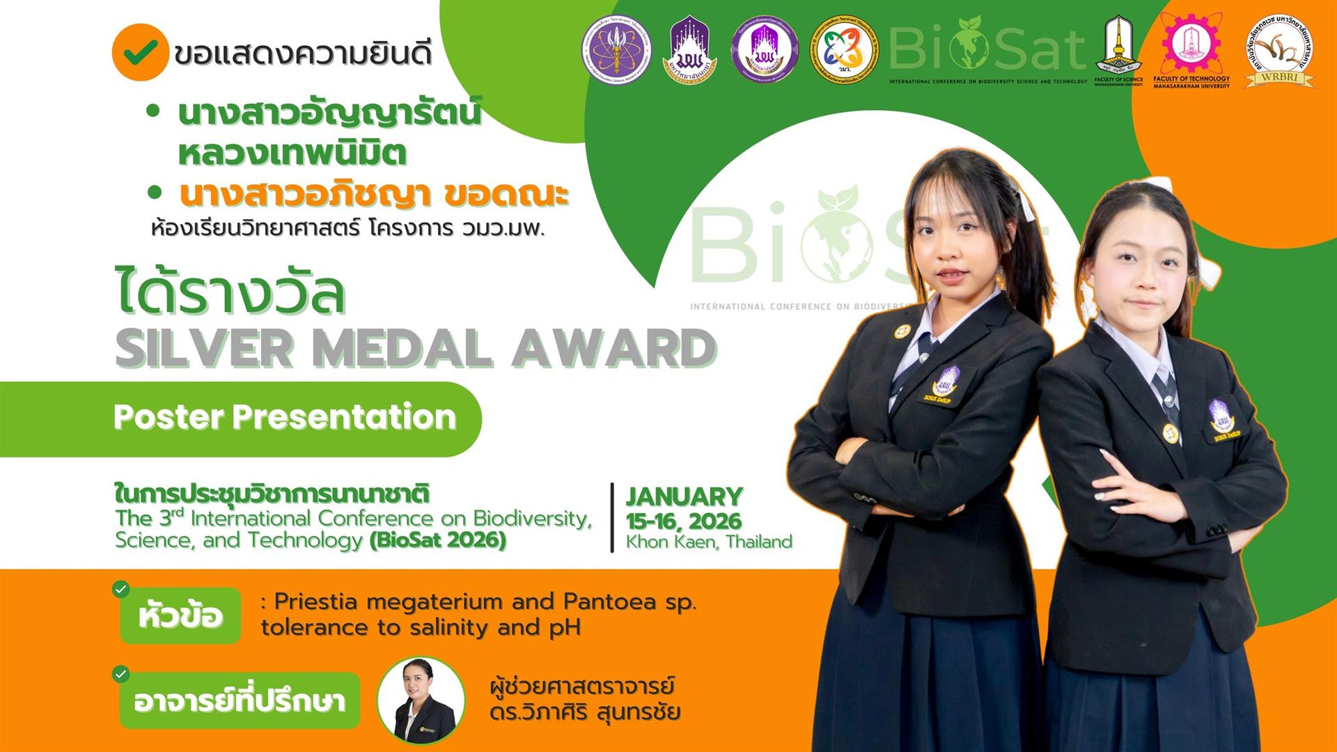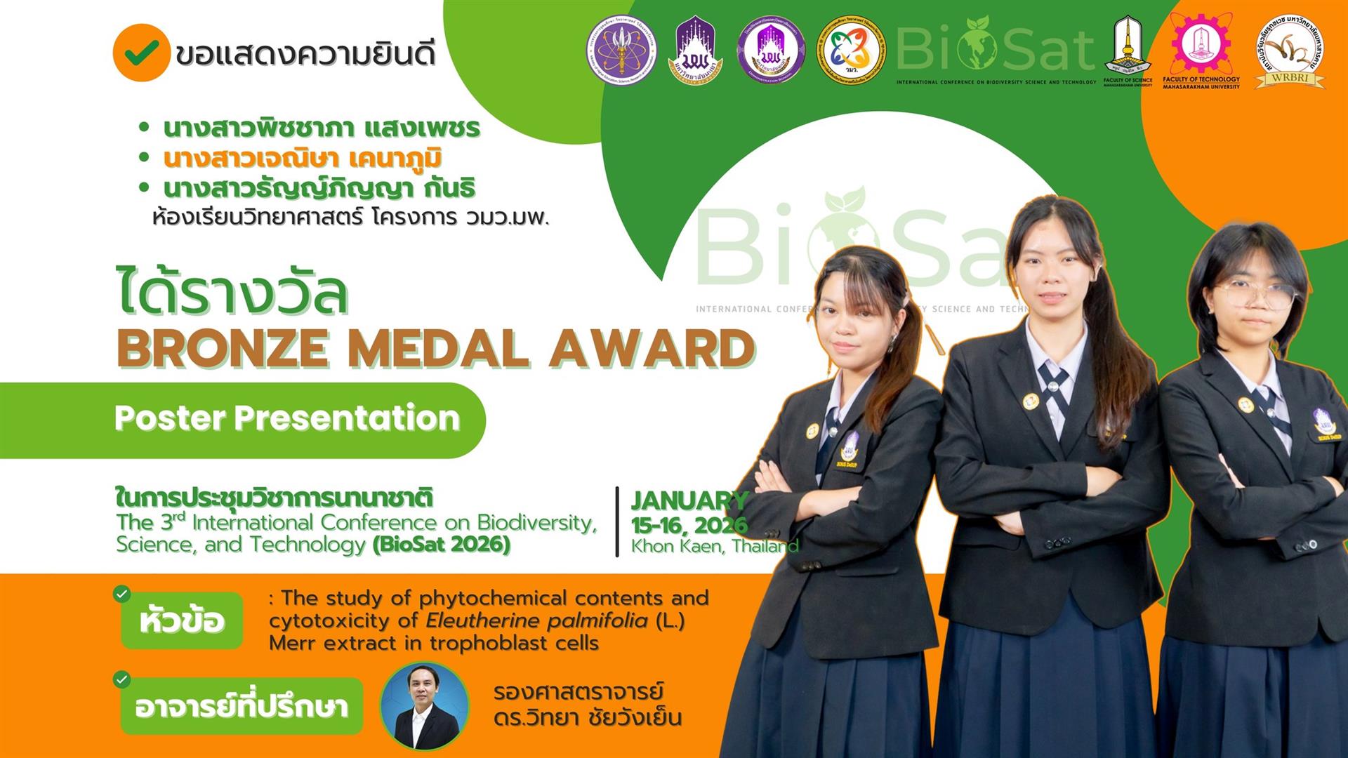 นักเรียนโรงเรียนสาธิตมหาวิทยาลัยพะเยา สร้างชื่อเสียงในเวทีระดับนานาชาติ คว้า 11 เหรียญรางวัลจากการนำเสนอผลงานในการประชุมวิชาการนานาชาติ International Conference on Biodiversity, Science, and Technology (BioSat 2026) ซึ่งจัดขึ้นระหว่างวันที่ 15 - 16 มกราคม 2569 ณ โรงแรมอวานี ขอนแก่น โฮเทล แอนด์ คอนเวนชั่น เซ็นเตอร์ จังหวัดขอนแก่น ประเทศไทย