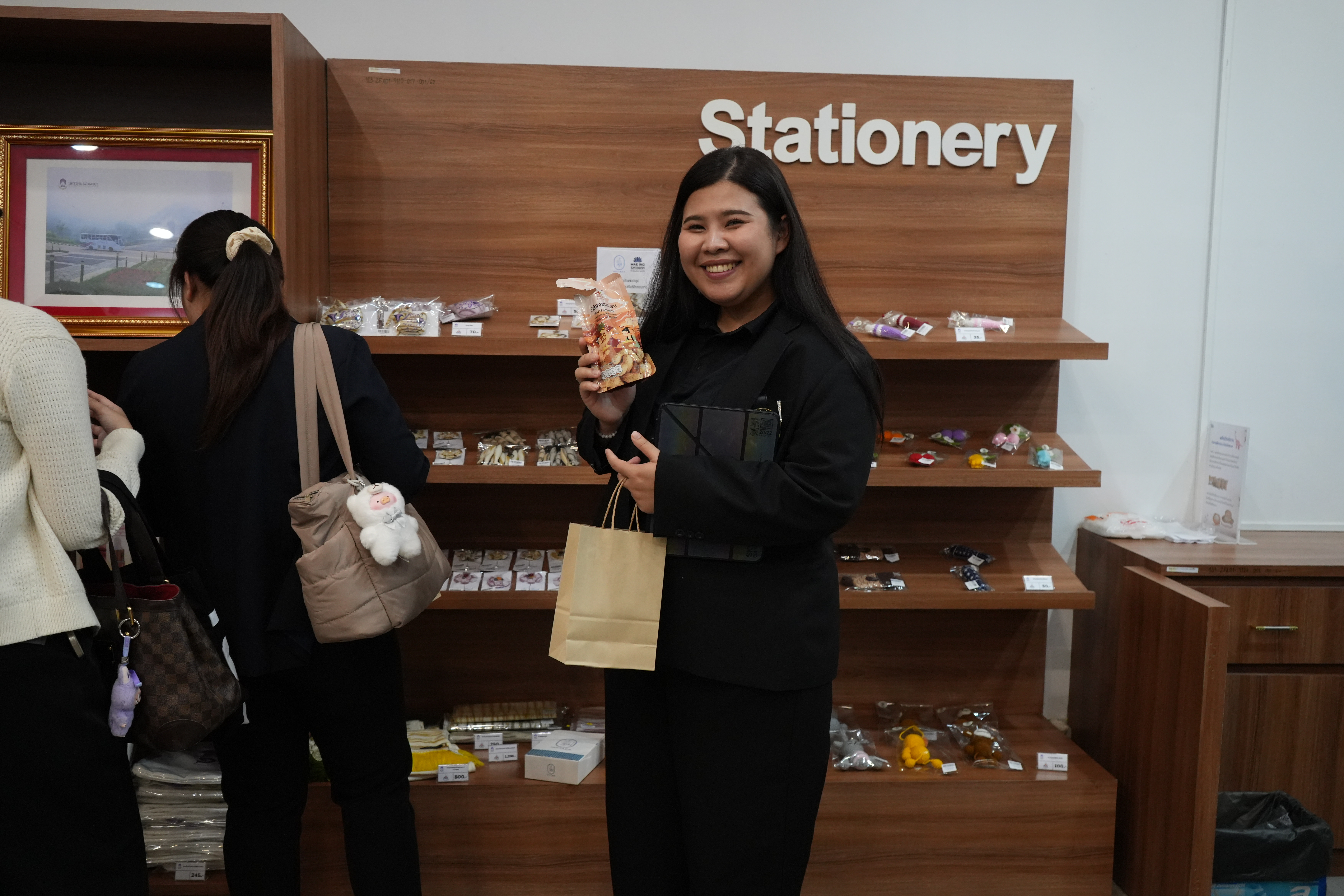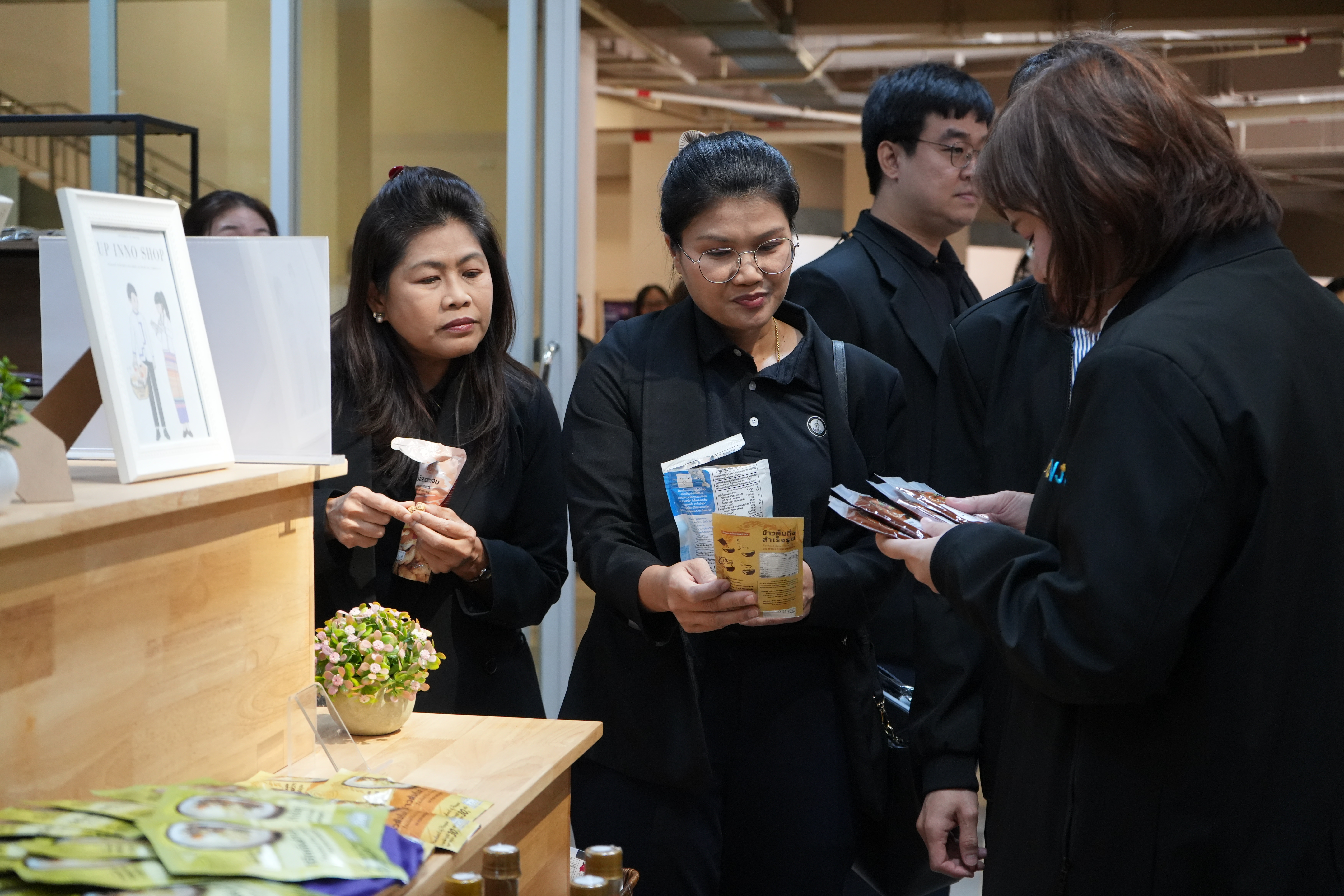จากนั้น คณะศึกษาดูงานได้เข้าเยี่ยมชมร้านค้าสวัสดิการมหาวิทยาลัยพะเยา และ UP Inno Shop ซึ่งเป็นช่องทางจำหน่ายผลิตภัณฑ์จากงานวิจัยและนวัตกรรมของมหาวิทยาลัยพะเยา ที่พัฒนาจากงานบริการวิชาการสู่เชิงพาณิชย์ ภายใต้แบรนด์ “UP Products” รวมถึงผลิตภัณฑ์ที่ได้รับการรับรองมาตรฐานคุณภาพ เช่น GI และ Organic อันเป็นกลไกสำคัญในการขยายช่องทางการตลาด เพิ่มรายได้ให้แก่ชุมชน นักวิจัย และสร้างคุณค่าจากงานวิจัยสู่การใช้ประโยชน์อย่างแท้จริง