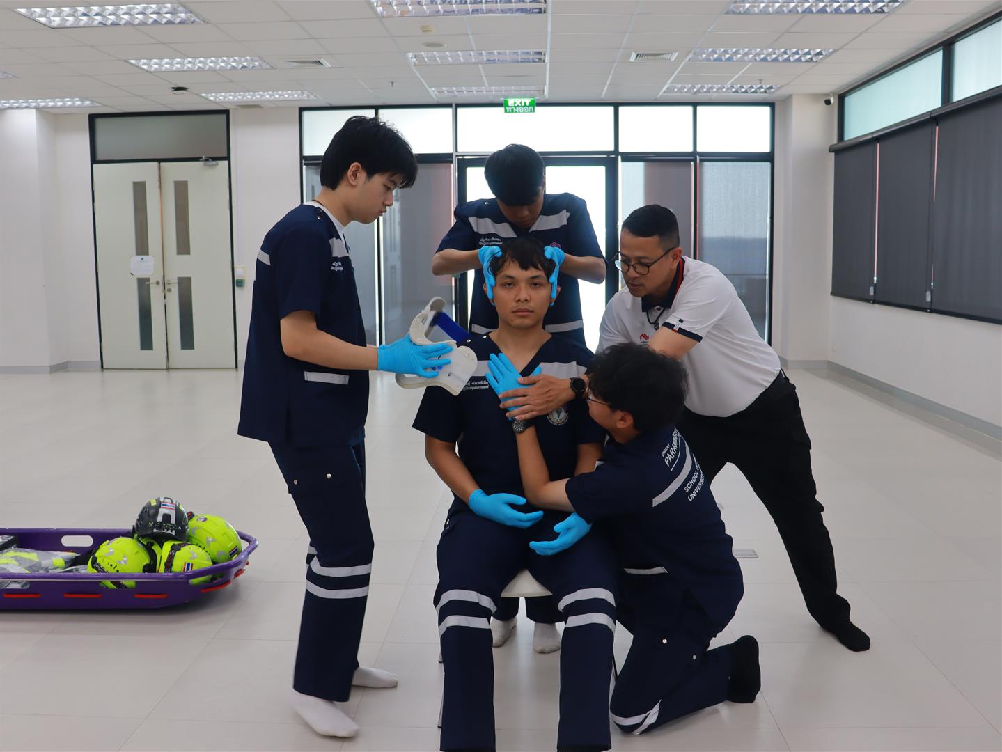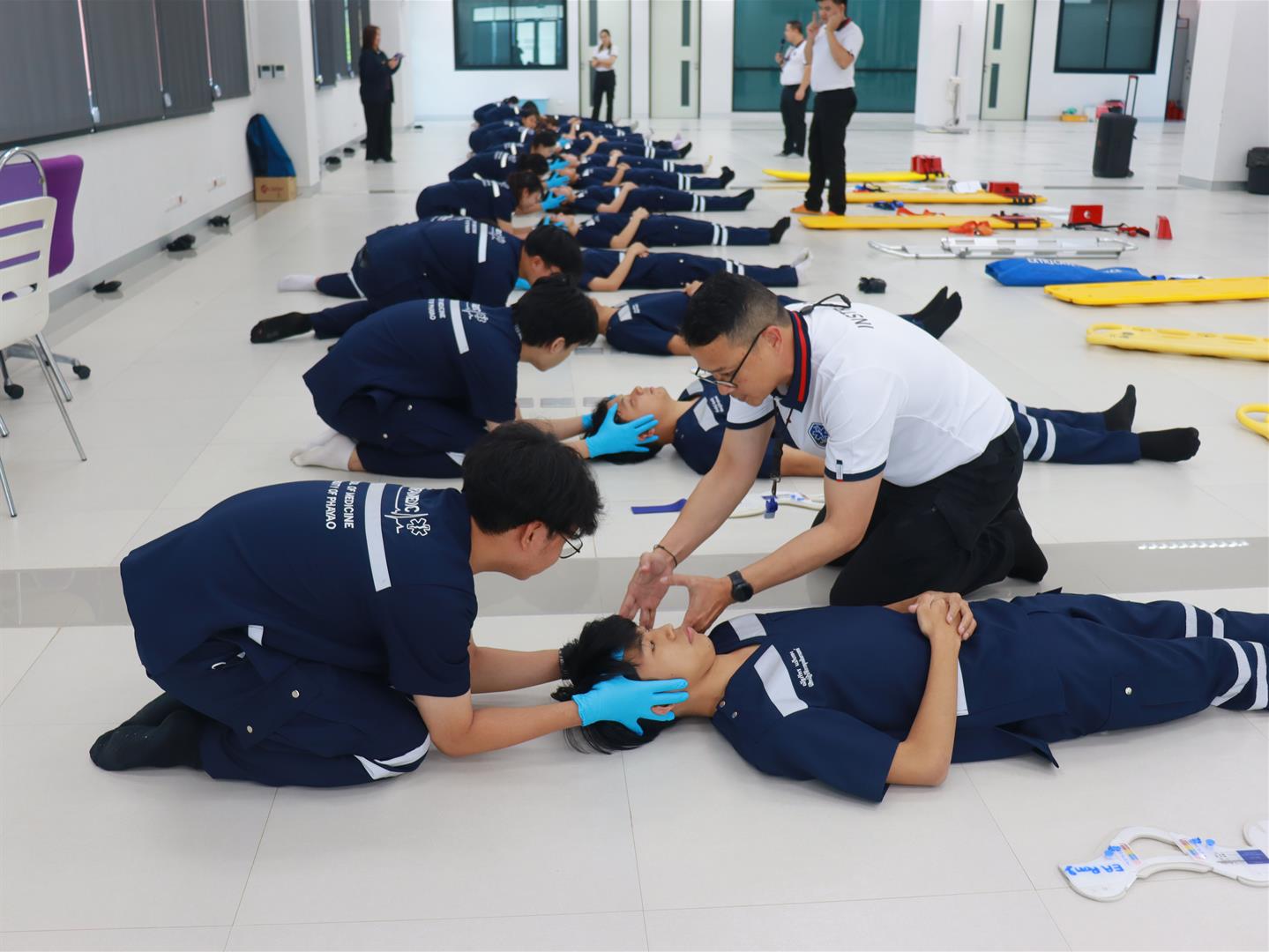 การฝึกในครั้งนี้จัดขึ้นเพื่อเสริมสร้างทักษะด้านการยกเคลื่อนย้ายผู้ป่วยในภาวะฉุกเฉิน การช่วยชีวิตทางน้ำ และการเคลื่อนย้ายผู้ประสบภัยทางน้ำ รวมถึงการสอบภาคปฏิบัติ เพื่อประเมินสมรรถนะตามมาตรฐานวิชาชีพของนักปฏิบัติการฉุกเฉินการแพทย์ ทั้งนี้ การฝึกปฏิบัติมุ่งเน้นให้ผู้เรียนได้ พัฒนาทักษะเชิงปฏิบัติที่ถูกต้อง ปลอดภัย และสอดคล้องกับหลักวิชาการ ตลอดจนเตรียมความพร้อมในการปฏิบัติงานจริงในสถานการณ์ฉุกเฉิน เพื่อก้าวสู่การเป็นนักฉุกเฉินการแพทย์ที่มีความรู้ ความรับผิดชอบ และสามารถช่วยชีวิตผู้ป่วยได้อย่างมีประสิทธิภาพ กิจกรรมจัดขึ้น ณ อาคารศูนย์การเรียนรู้วิทยาศาสตร์สุขภาพ ชั้น 5 และ สระว่ายน้ำ มหาวิทยาลัยพะเยา