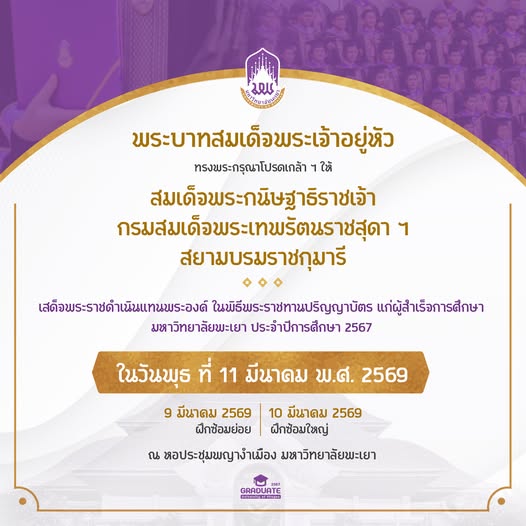 พระบาทสมเด็จพระเจ้าอยู่หัวทรงพระกรุณาโปรดเกล้าโปรดกระหม่อมให้สมเด็จพระกนิษฐาธิราชเจ้า กรมสมเด็จพระเทพรัตนราชสุดาฯ สยามบรมราชกุมารี เสด็จพระราชดำเนินแทนพระองค์ ในวันพุธที่ 11 มีนาคม 2569 ณ หอประชุมพญางำเมือง มหาวิทยาลัยพะเยา อำเภอเมืองพะเยา จังหวัดพะเยา