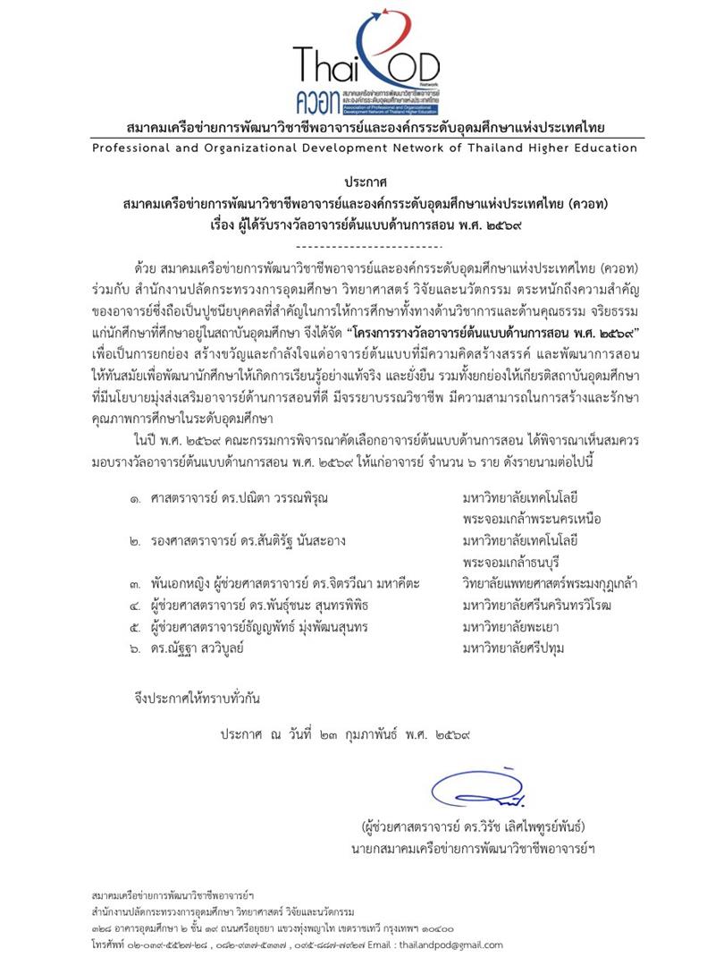 มหาวิทยาลัยพะเยา ขอแสดงความยินดีและความภาคภูมิใจอย่างยิ่งกับ ผู้ช่วยศาสตราจารย์ ธัญญพัทธ์ มุ่งพัฒนสุนทร อาจารย์ประจำคณะรัฐศาสตร์และสังคมศาสตร์ ในโอกาสได้รับรางวัล “อาจารย์ต้นแบบด้านการสอน พ.ศ. ๒๕๖๙” จาก สมาคมเครือข่ายการพัฒนาวิชาชีพอาจารย์และองค์กรระดับอุดมศึกษาแห่งประเทศไทย (ควอท)