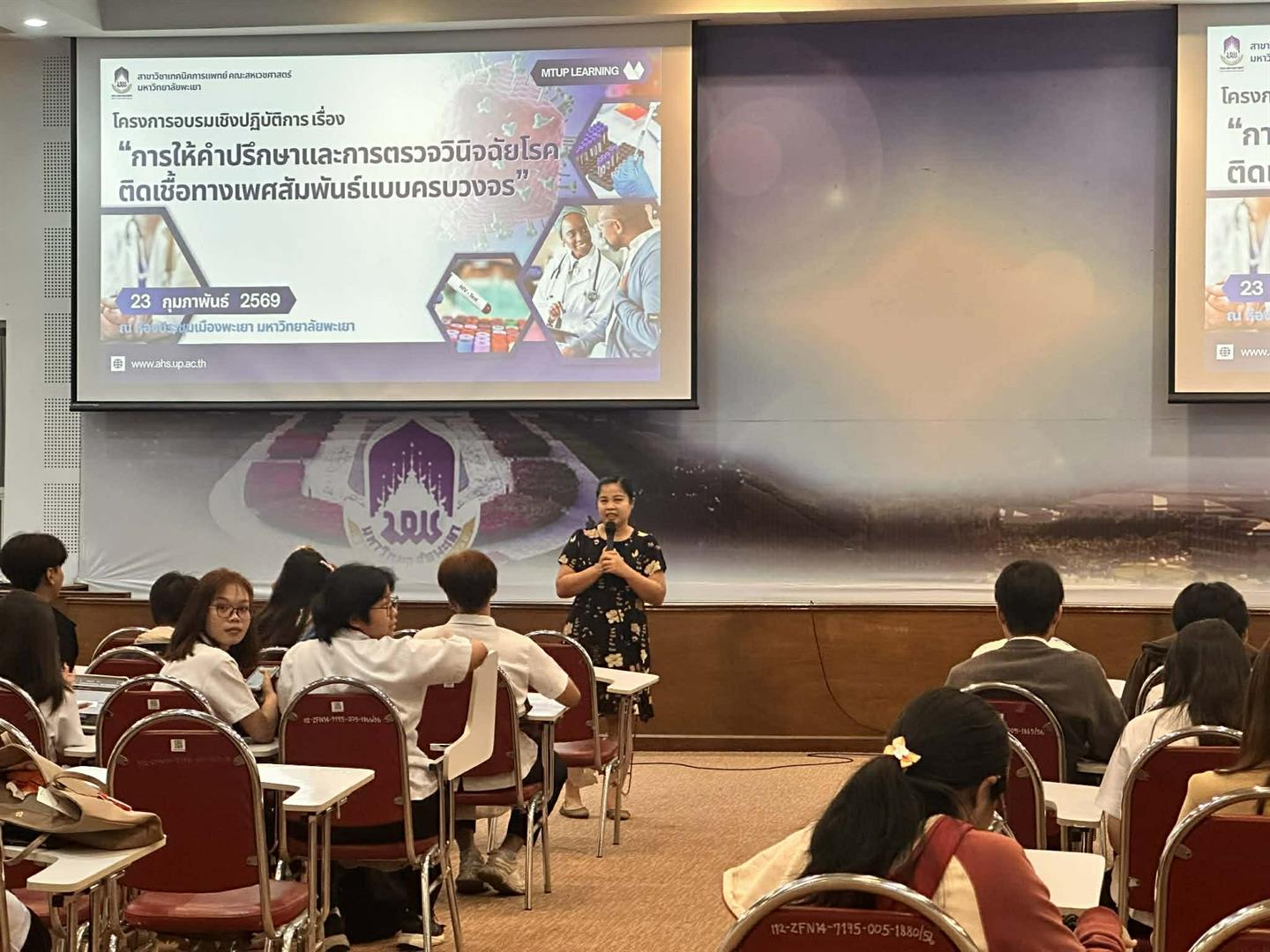 สาขาวิชาเทคนิคการแพทย์ คณะสหเวชศาสตร์ มหาวิทยาลัยพะเยา จัดโครงการอบรมเชิงปฏิบัติการเรื่อง “การให้คำปรึกษาและการตรวจวินิจฉัยโรคติดเชื้อทางเพศสัมพันธ์แบบครบวงจร” เมื่อวันจันทร์ที่ 23 กุมภาพันธ์ พ.ศ. 2569 ณ ห้องประชุมเมืองพะเยา มหาวิทยาลัยพะเยา เพื่อเสริมสร้างองค์ความรู้และพัฒนาทักษะทางวิชาชีพแก่นิสิตสาขาวิชาเทคนิคการแพทย์ ชั้นปีที่ 4