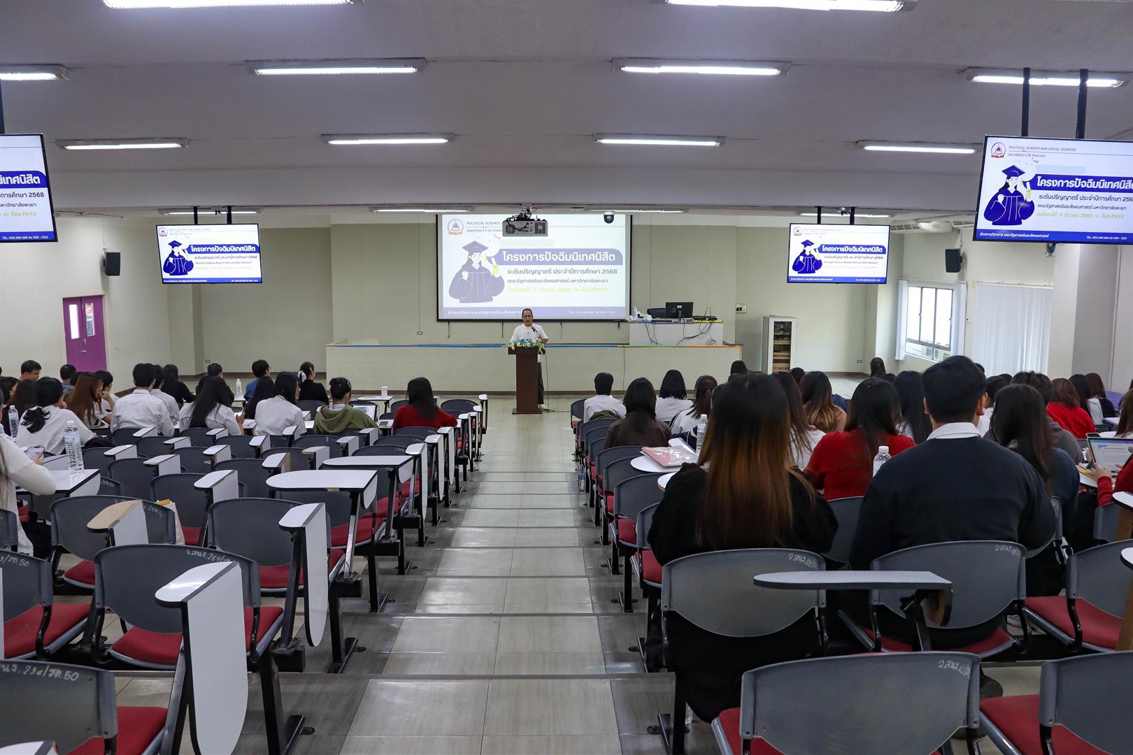 วันที่ 2 มีนาคม พ.ศ. 2569 คณะรัฐศาสตร์และสังคมศาสตร์ มหาวิทยาลัยพะเยา ได้จัดโครงการปัจฉิมนิเทศนิสิตชั้นปีที่ 4 ประจำปีการศึกษา 2568 เพื่อเตรียมความพร้อมให้นิสิตก่อนสำเร็จการศึกษาและก้าวเข้าสู่การทำงานในอนาคต ณ ห้องภูกามยาว 2 (PKY2) อาคารเรียนรวมภูกามยาว โดยมี รองศาสตราจารย์ ดร.มนตรา พงษ์นิล คณบดีคณะรัฐศาสตร์และสังคมศาสตร์ กล่าวแสดงความยินดีและเปิดโครงการ พร้อมทั้งให้โอวาทแก่นิสิตที่กำลังจะสำเร็จการศึกษา