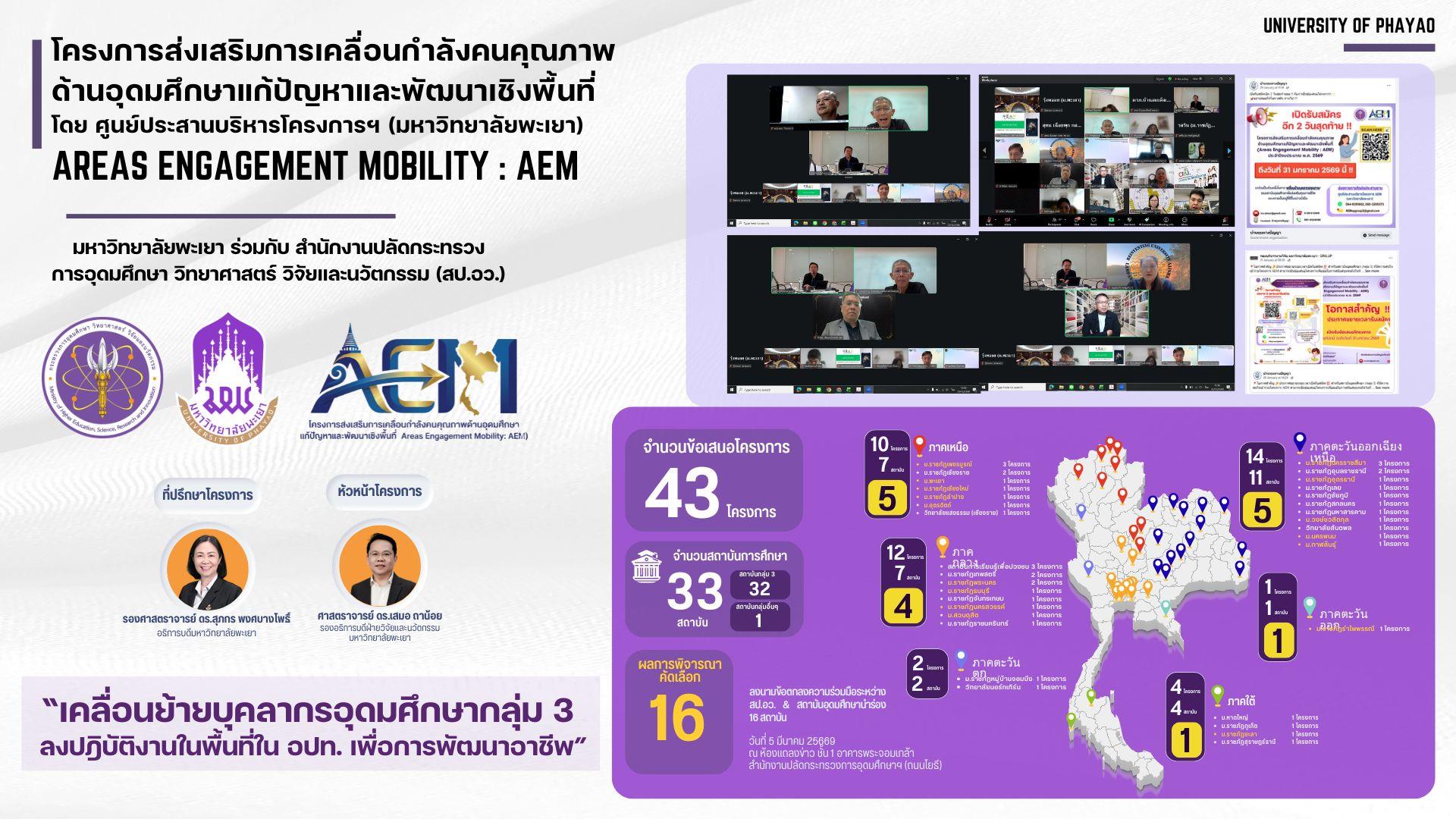 มหาวิทยาลัยพะเยาในฐานะศูนย์ประสานบริหารโครงการ AEM โดยร่วมขับเคลื่อนโครงการ AEM กับ สป.อว. ถือเป็นก้าวย่างสำคัญในการเปลี่ยนผ่านบทบาทของสถาบันอุดมศึกษาไปสู่การเป็นที่พึ่งของท้องถิ่นอย่างแท้จริง โดยมุ่งหวังว่าการผนึกกำลังร่วมกับภาคีเครือข่ายในครั้งนี้ จะช่วยส่งเสริมให้บุคลากรสายวิชาการนำองค์ความรู้และนวัตกรรมไปช่วยยกระดับคุณภาพชีวิตของประชาชน ลดความเหลื่อมล้ำ และสร้างความเข้มแข็งให้กับองค์กรปกครองส่วนท้องถิ่นได้อย่างยั่งยืน ตามเจตนารมณ์ของยุทธศาสตร์ชาติและการอุดมศึกษาเพื่อการพัฒนาประเทศ