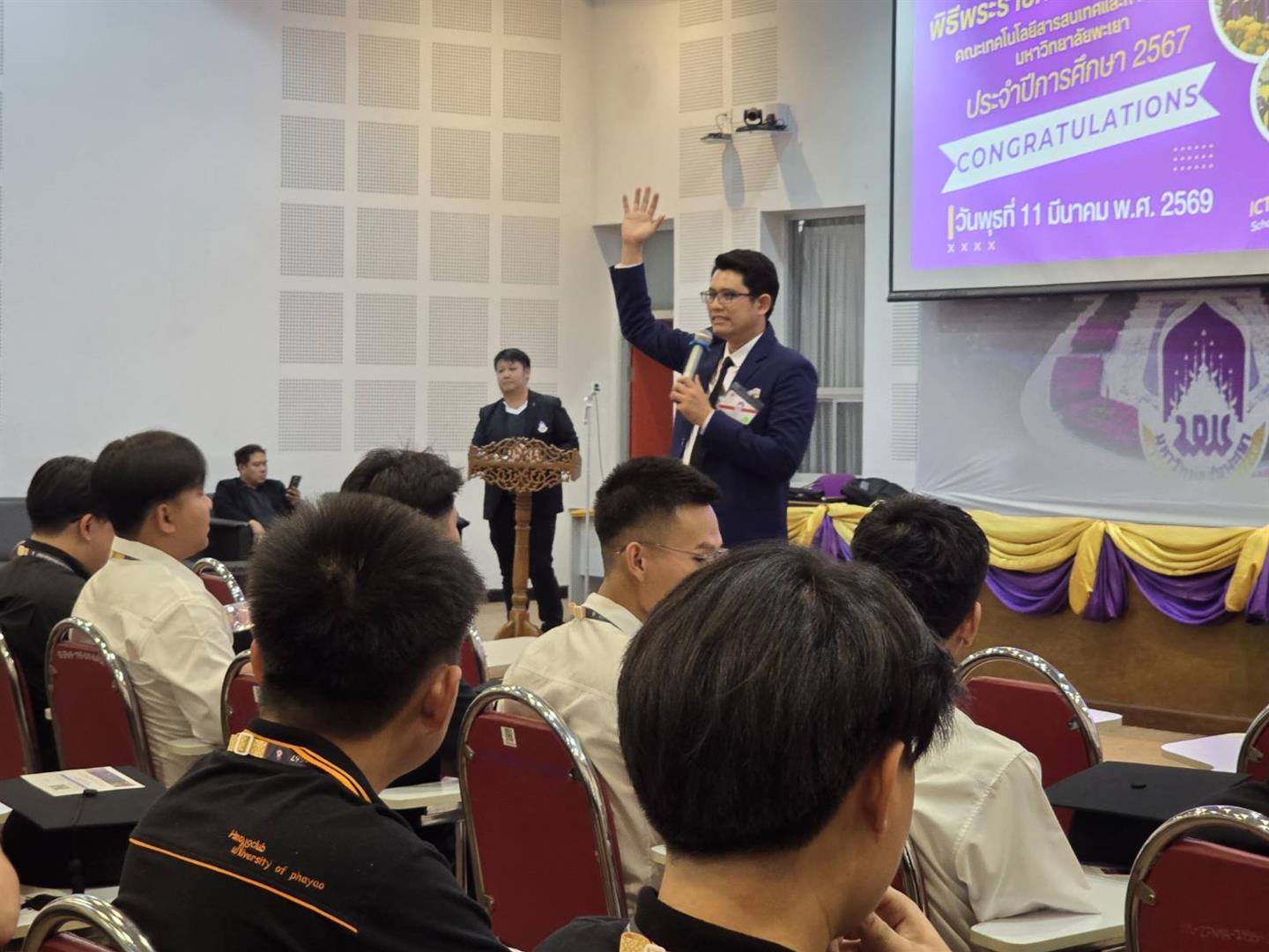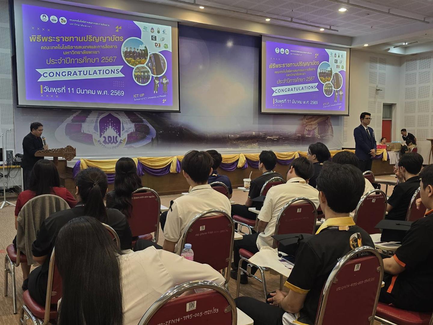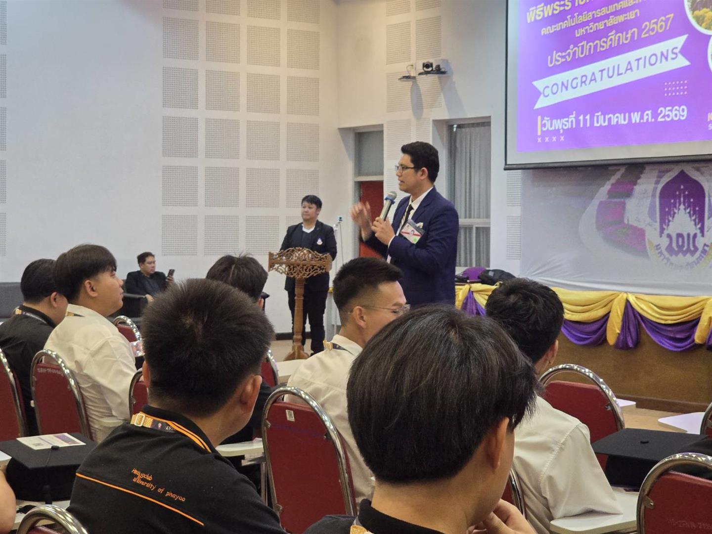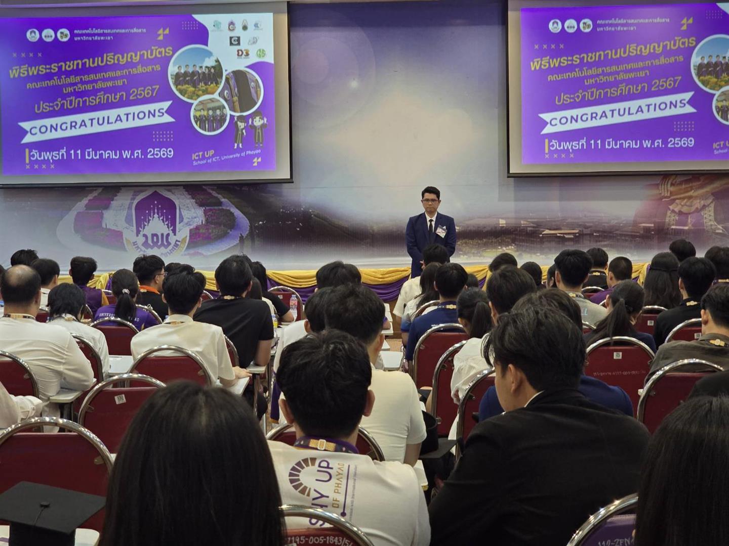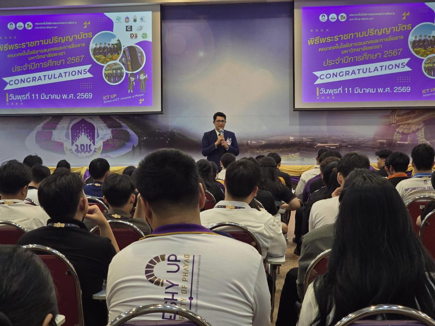 เมื่อวันที่ 9 มีนาคม 2569 ณ ห้องประชุมเมืองพะเยา ผู้ช่วยศาสตราจารย์ ดร.นครินทร์ ชัยแก้ว รองคณบดีฝ่ายคุณภาพนิสิต กล่าวรายงานวัตถุประสงค์ของการจัดกิจกรรมภายใต้ โครงการบัณฑิตสัมพันธ์ จากนั้น ผู้ช่วยศาสตราจารย์ ดร.พรเทพ โรจนวสุ คณบดีคณะเทคโนโลยีสารสนเทศและการสื่อสาร กล่าวแสดงความยินดีกับบัณฑิตและมหาบัณฑิตที่สำเร็จการศึกษา พร้อมทั้งกล่าวโอวาทและให้ข้อคิดในการดำเนินชีวิต โดยเน้นย้ำการใช้ชีวิตอย่างมีสติ การรู้จักวางแผนและออมเงินเพื่ออนาคตของตนเองและครอบครัว รวมถึงการพัฒนาตนเองอย่างต่อเนื่องเพื่อเตรียมพร้อมสู่โลกการทำงานในอนาคต