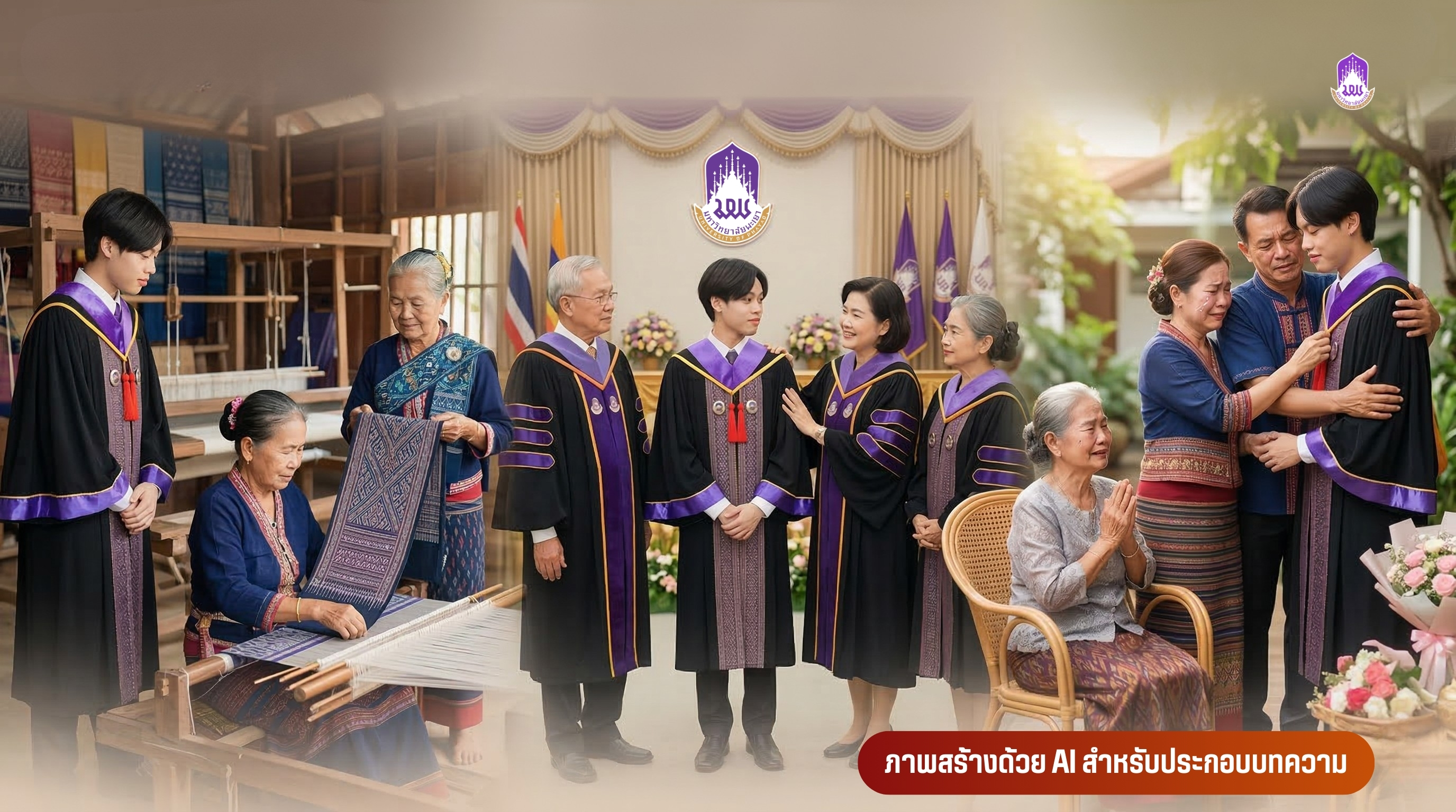 ในวันที่บัณฑิตก้าวขึ้นรับพระราชทานปริญญาบัตร ความภูมิใจในห้องนั้นไม่ได้อยู่ในใจคน ๆ เดียว แต่มันซ้อนกันอยู่หลายชั้น ชั้นแรกคือความภูมิใจของชุมชนไทลื้อในอำเภอเชียงคำ ที่ตั้งใจทอผ้าลายต่ำก้าวอย่างประณีตด้วยมือ เพื่อให้มาประดับอยู่บนแถบครุยของบัณฑิตทุกคน ชั้นต่อมาคือความภูมิใจของคณาจารย์ผู้ประสิทธิ์ประสาทวิชา ที่ส่งบัณฑิตออกไปรับใช้สังคมตามปณิธานที่ตั้งไว้ และชั้นที่ลึกที่สุด คือความภูมิใจของพ่อแม่และครอบครัว ที่มองเห็นลูกหลานของตนเอง ยืนอยู่ในชุดครุยผืนนั้น เพราะในวันนั้นเอง สิ่งที่อยู่ตรงหน้าพวกเขา ไม่ใช่แค่ครุยธรรมดา แต่คือ “ครุยแห่งภูมิปัญญาจากวัฒนธรรมของท้องถิ่น” ที่แฝงไปด้วยจิตวิญญาณแห่งวิญญูชน ผู้พร้อมด้วยปัญญา ที่จะก้าวออกไปสร้างสรรค์สังคม เกิดความเข้มแข็งให้กับแผ่นดินต่อไป