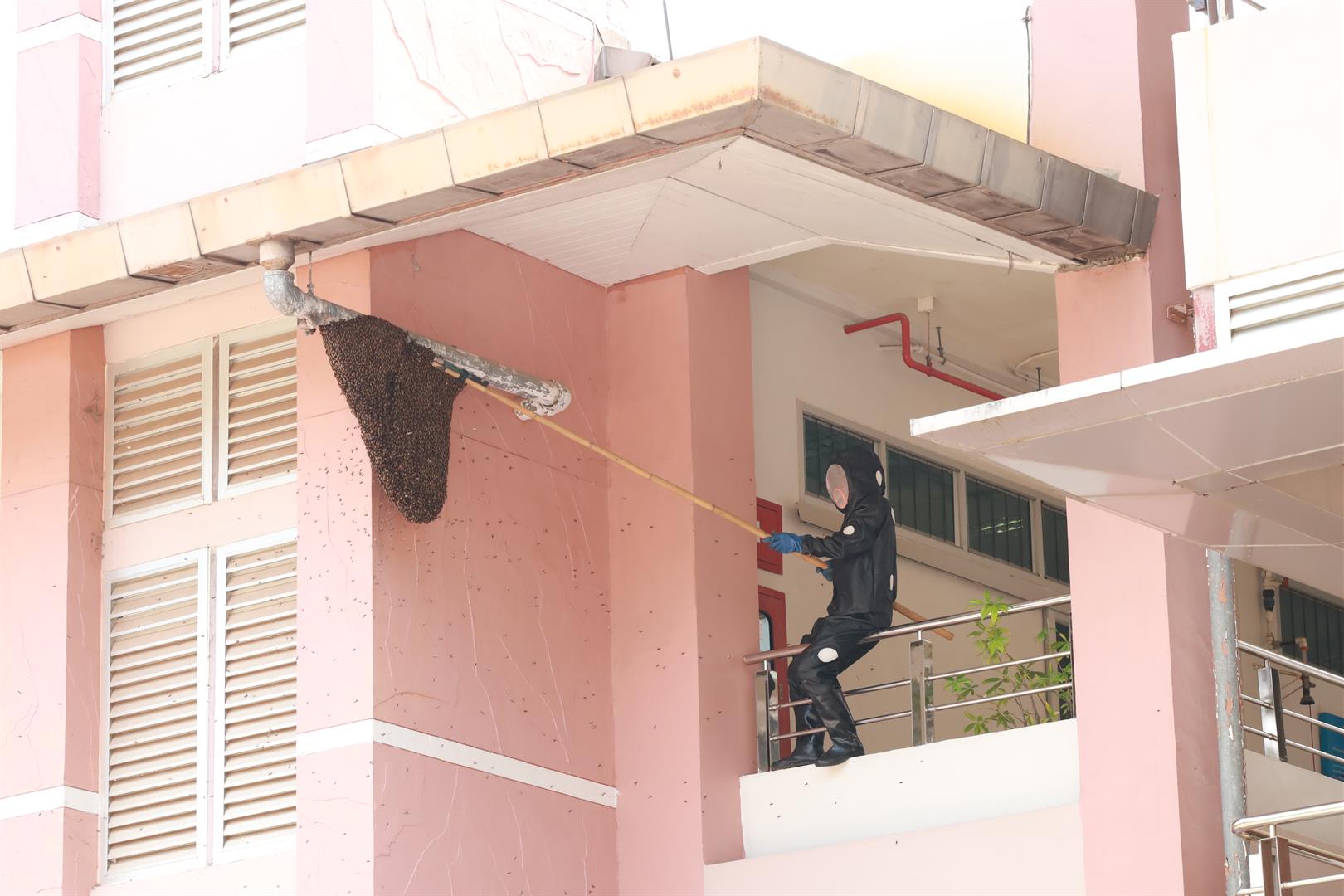 ในการปฏิบัติงาน เจ้าหน้าที่ได้สวมใส่ชุดป้องกันผึ้งอย่างเหมาะสม เพื่อป้องกันอันตรายที่อาจเกิดขึ้นระหว่างการดำเนินงาน เนื่องจากบริเวณดังกล่าวเป็นจุดที่ผึ้งทำรังอยู่บริเวณคานหลังคา ซึ่งมีความเสี่ยงสูงในการเข้าถึงและดำเนินการ