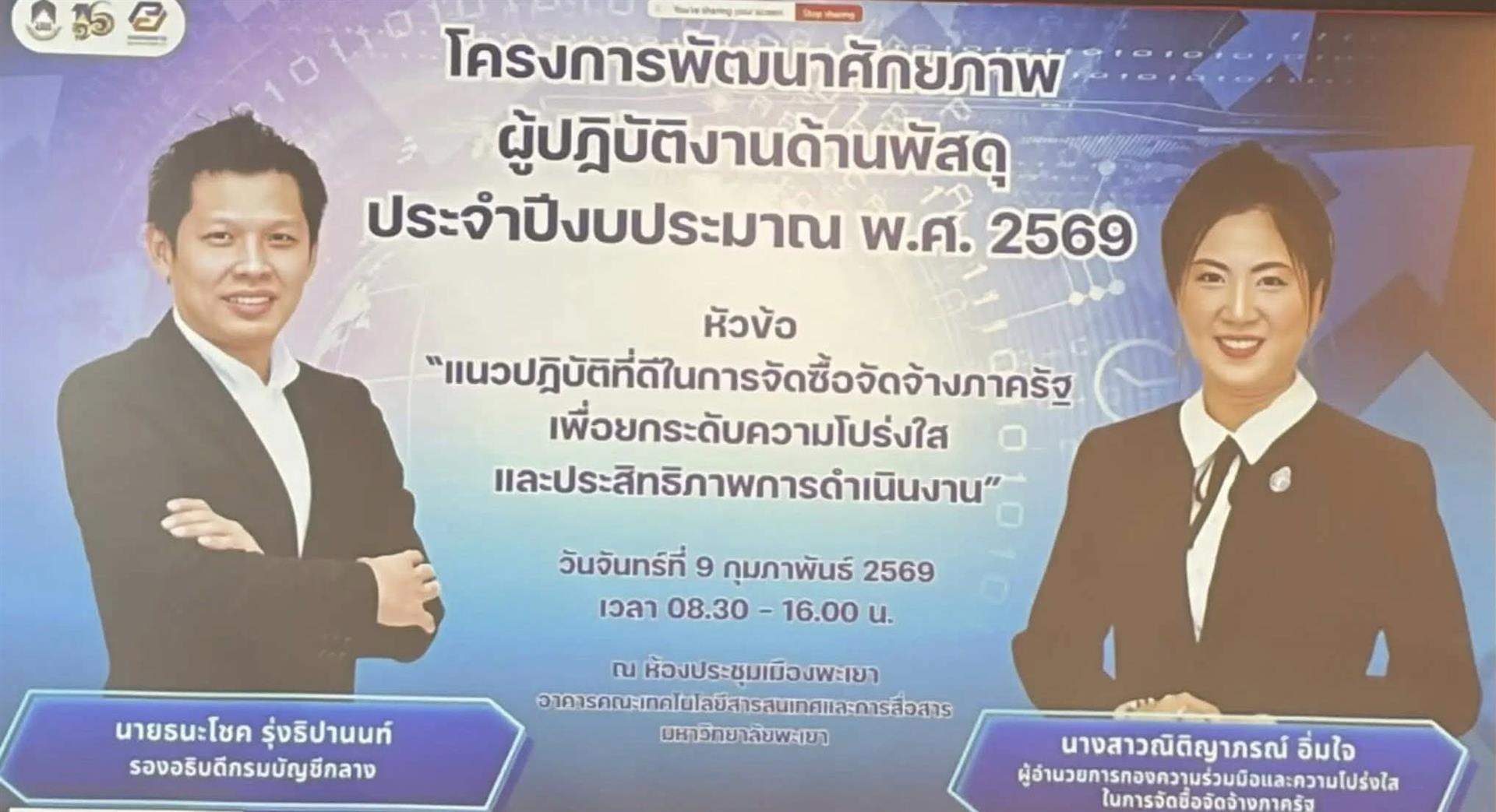 การอบรมครั้งนี้ได้รับเกียรติจาก คุณธนะโชค รุ่งธิปานนท์ รองอธิบดีกรมบัญชีกลาง และ คุณณิติญาภรณ์ อิ่มใจ ผู้อำนวยการกองความร่วมมือและความโปร่งใสในการจัดซื้อจัดจ้างภาครัฐ เป็นวิทยากรถ่ายทอดองค์ความรู้ภายในหัวข้อ “การเปลี่ยนแปลงด้านการจัดซื้อจัดจ้างภาครัฐในปีงบประมาณ 2569” และ “แนวปฏิบัติที่ดีในการจัดซื้อจัดจ้างภาครัฐ เพื่อยกระดับความโปร่งใสและประสิทธิภาพการดำเนินงาน” โดยมุ่งเน้นการเสริมสร้างความเข้าใจที่ถูกต้อง ทันต่อการเปลี่ยนแปลงของหลักเกณฑ์ในปีงบประมาณ พ.ศ. 2569 และการประยุกต์ใช้แนวปฏิบัติอย่างเป็นระบบ