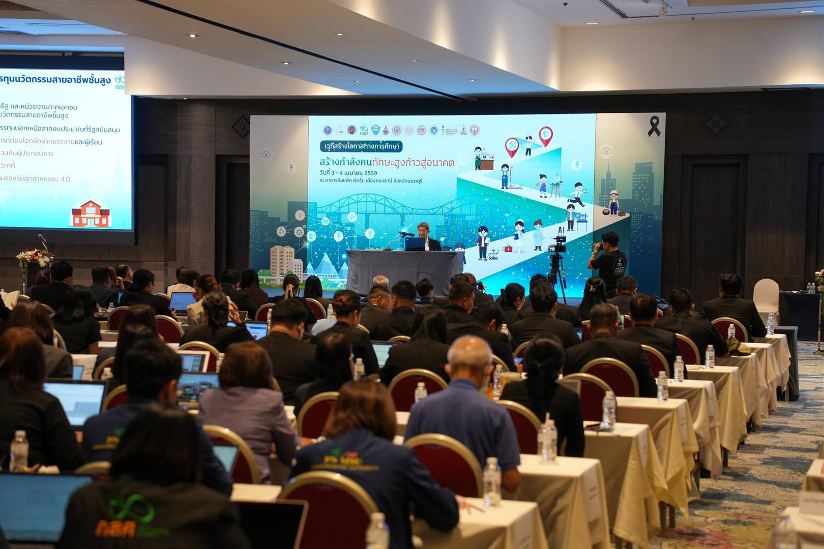 วันที่ 3-4 เมษายน 2569 ผศ.ดร.ดาว เวียงคำ คณบดีคณะพยาบาลศาสตร์ พร้อมด้วย ดร.กฤติพิชญ์ ฐิติพิชญานันท์ ประธานหลักสูตรประกาศนียบัตรผู้ช่วยพยาบาล ผศ.ดร.พยาม การดี และ นางรัตนา ทาสิทธิ์ เข้าร่วมเวทีสร้างโอกาสทางการศึกษา สร้างกำลังคนทักษะสูงก้าวสู่อนาคต ณ อิมแพ็ค ฟอรั่ม เมืองทองธานี จังหวัดนนทบุรี โครงการนี้จัดขึ้นโดย กองทุนเพื่อความเสมอภาคทางการศึกษา (กสศ.) เพื่อสร้างการมีส่วนร่วมในการสร้างโอกาสทางการศึกษาสายอาชีพให้แก่เยาวชนที่ขาดแคลนทุนทรัพย์ และด้วยโอกาสผ่านความร่วมมือภาครัฐ ภาคเอกน และภาคประชาสังคม เพื่อชี้แจงแนวทางการดำเนินงานโครงการทุนนวัตกรรมสายอาชีพชั้นสูง ให้แก่สถานศึกษาจากทุกสังกัด สำนักงานคณะกรรมการอาชีวศึกษา กระทรวงการอุดมศึกษา วิทยาศาสตร์ วิจัยและนวัตกรรม และอื่นๆ ตลอดจนการแลกเปลี่ยนเรียนรู้การพัฒนาระบบดูแลความเป็นอยู่และสวัสดิภาพของผู้รับทุนให้สามารถเรียนจบตามกำหนดเวลา การพัฒนาหลักสูตรและกระบวนการเรียนการสอนให้มีคุณภาพสูง และการส่งเสริมโอกาสการมีงานทำของผู้ที่จะจบการศึกษา และเพื่อการพัฒนาปรับปรุงข้อเสนอโครงการในการพัฒนาผู้เรียนและสถานศึกษาตามกรอบคุณภาพได้อย่างมีประสิทธิภาพและการดำเนินการได้ตามกรอบเวลาของโครงการ โดยมีกลุ่มเป้าหมาย คือ ผู้บริหารและคณะครูจากสถานศึกษาทั้งภาครัฐและเอกชนที่จัดการเรียนการสอนสาขาวิชาชีพ ระดับประกาศนียบัตรระดับวิชาชีพชั้นสูง (ปวส.) หรือระดับอนุปริญญา และหลักสูตรประกาศนียบัตร (1 ปี) ผู้ช่วยพยาบาล/ผู้ช่วยทันตแพทย์ และหลักสูตรประกาศนียบัตรพนักงานให้การดูแล (6 เดือน) จำนวน 83 แห่ง ใน 44 จังหวัด ผู้ทรงคุณวุฒิ คณะทำงานหนุนเสริม ภาคีภาคเอกชน และภาคีที่เกี่ยวข้อง รวมผู้เข้าร่วมประชุม จำนวนประมาณ 420 คน