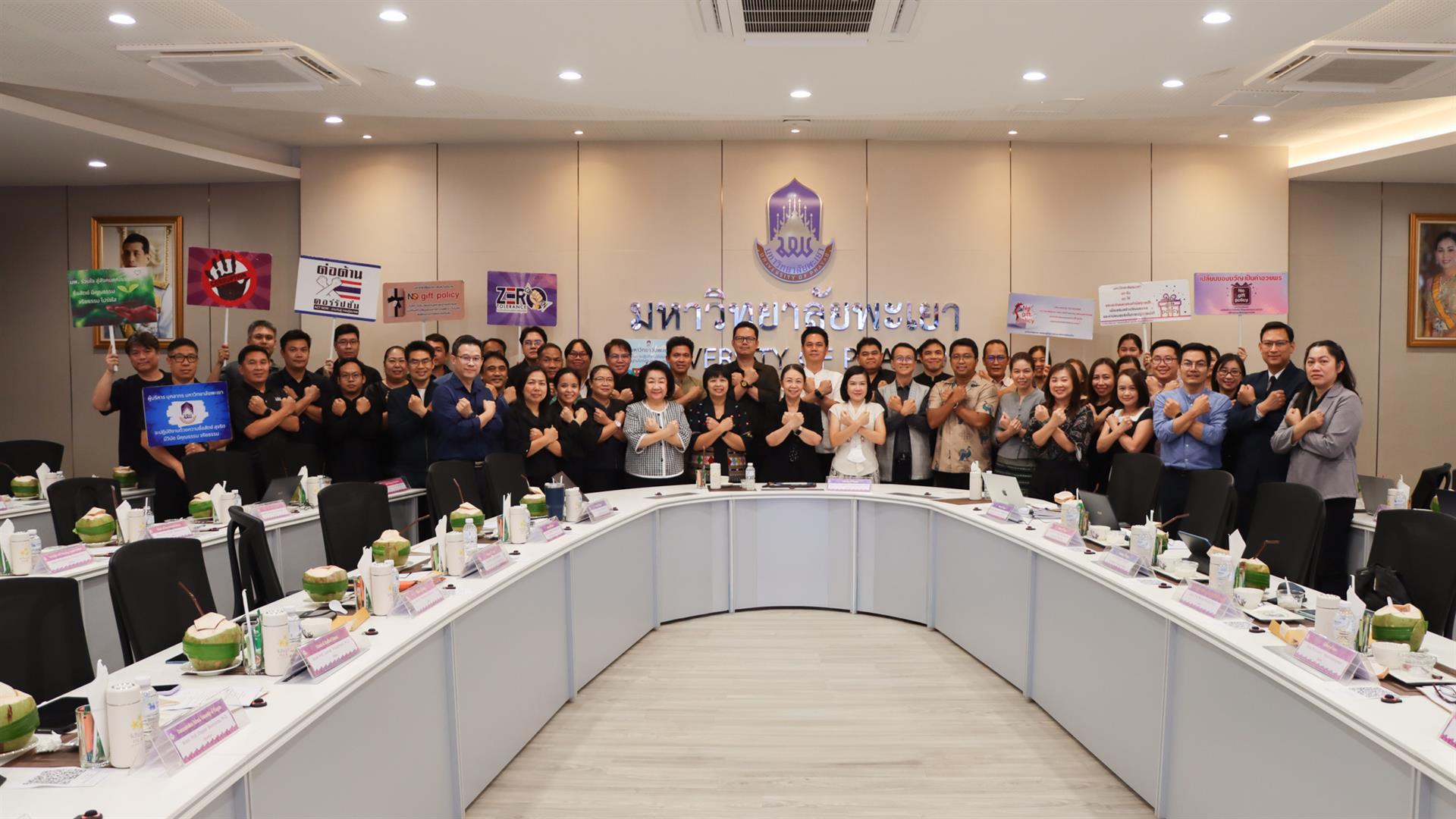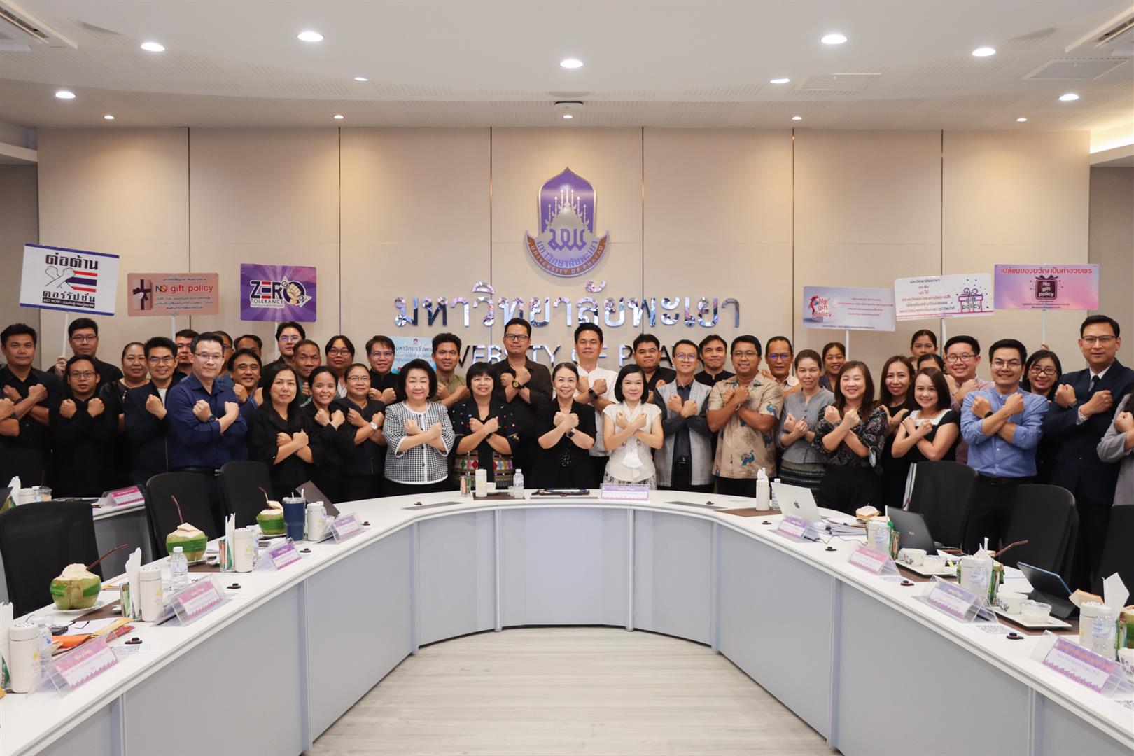 ที่ประชุมได้ร่วมกันถ่ายภาพเชิงสัญลักษณ์แสดงเจตจำนงยืดหยัดต่อต้านการทุจริตคอร์รัปชัน เพื่อสนับสนุนต่อแผนงานด้านการป้องกันการทุจริตและการยกระดับคุณธรรม จริยธรรม และความโปร่งใสในการดำเนินงานของหน่วยงานภายในมหาวิทยาลัยพะเยาภายใต้หลักธรรมาภิบาล