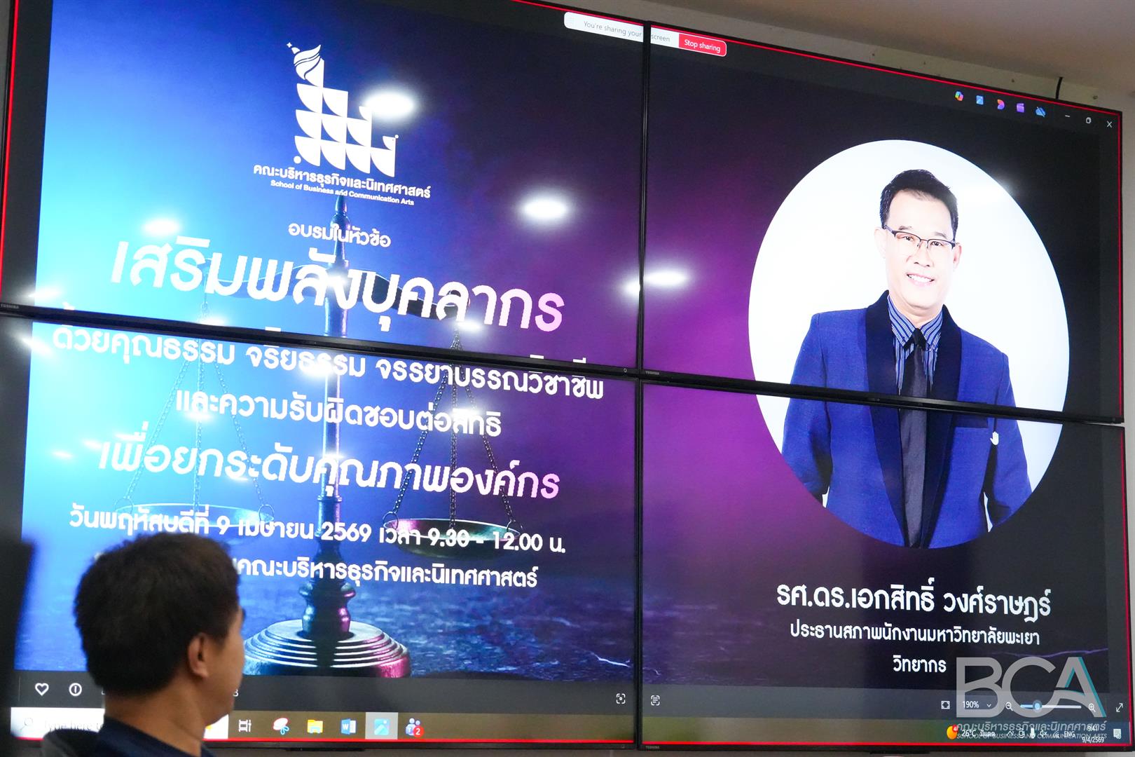 เมื่อวันที่ 7 เมษายน 2569 คณะบริหารธุรกิจและนิเทศศาสตร์ ได้ดำเนินโครงการ ส่งเสริมคุณธรรม จริยธรรม และจรรยาบรรณในการปฏิบัติงานของบุคลากรทางการศึกษา โดยได้รับเกียรติจาก รองศาสตราจารย์ ดร.เอกสิทธิ์ วงศ์ราษฎร์ ประธานสภาพนักงานมหาวิทยาลัยพะเยา ซึ่งเป็นผู้มีความรู้ ความเชี่ยวชาญ และประสบการณ์อย่างลึกซึ้งในด้านการกำกับดูแลตามหลักคุณธรรม ตลอดจนการคุ้มครองสิทธิของบุคลากรในมหาวิทยาลัยพะเยา เป็นวิทยากรบรรยายในหัวข้อ “เสริมพลังบุคลากรด้วยคุณธรรม จริยธรรม จรรยาบรรณวิชาชีพ และความรับผิดชอบต่อสิทธิ เพื่อยกระดับคุณภาพองค์กร” ในการดำเนินโครงการดังกล่าวมีวัตถุประสงค์เพื่อถ่ายทอดองค์ความรู้ด้านคุณธรรม จริยธรรม และจรรยาบรรณวิชาชีพ สร้างความตระหนักรู้เชิงลึกแก่บุคลากรของคณะฯ ให้สามารถพิจารณา วิเคราะห์ และตระหนักถึงพฤติกรรม หรือการปฏิบัติใด ๆ ที่อาจส่งผลกระทบต่อสิทธิของผู้อื่น ทั้งในมิติของการเรียนการสอน การบริหารงาน และการปฏิบัติงานประจำ อันจะนำไปสู่การป้องกันปัญหาเชิงระบบ และการเสริมสร้างวัฒนธรรมองค์กรที่เข้มแข็ง และได้รับความเชื่อมั่นจากสังคม ต่อไป
