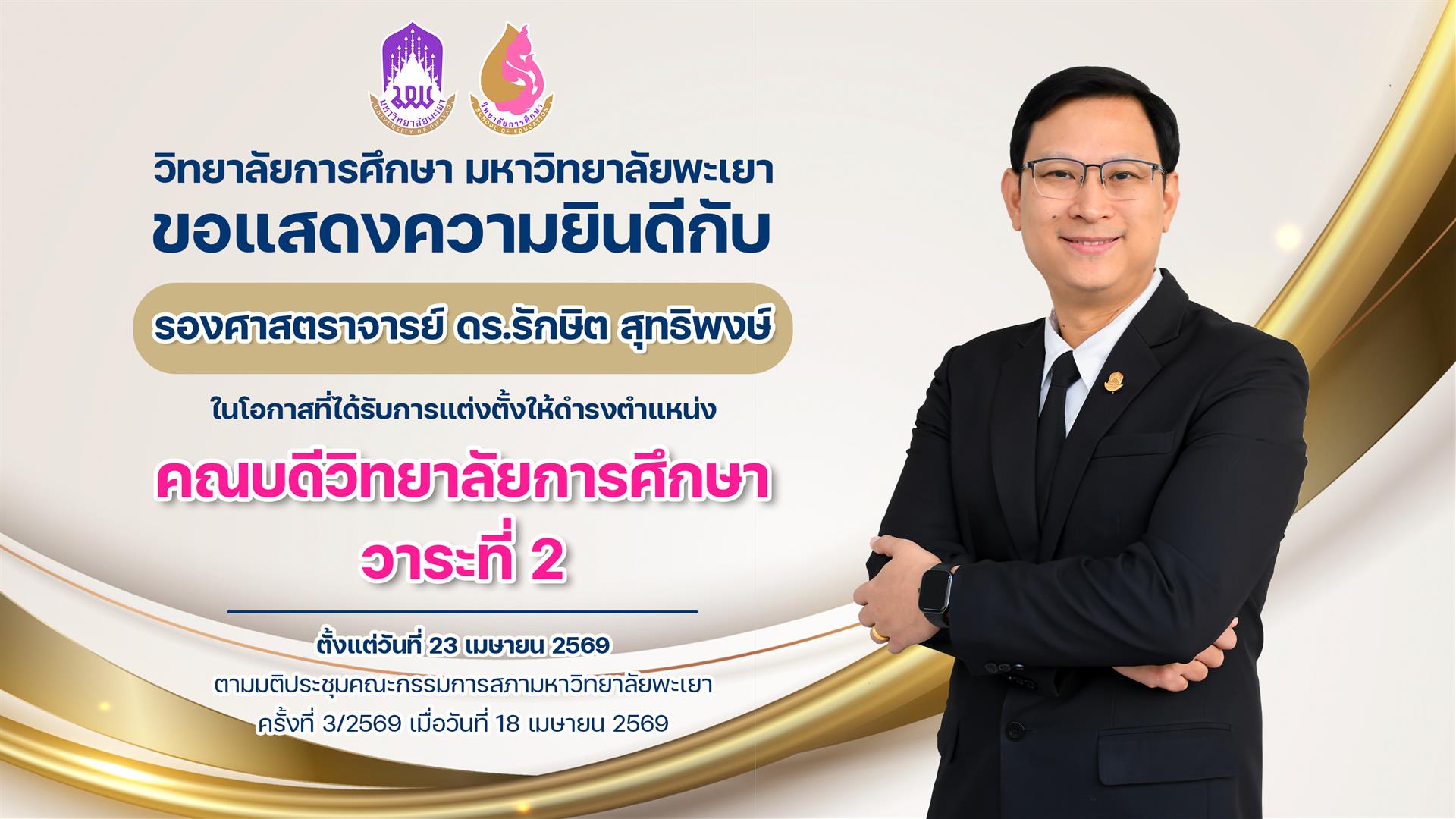 วิทยาลัยการศึกษา มหาวิทยาลัยพะเยา ขอแสดงความยินดีกับ รองศาสตราจารย์ ดร.รักษิต สุทธิพงษ์ ในโอกาสที่ได้รับการแต่งตั้งให้ดำรงตำแหน่ง คณบดีวิทยาลัยการศึกษา วาระที่ 2 ตั้งแต่วันที่ 23 เมษายน 2569