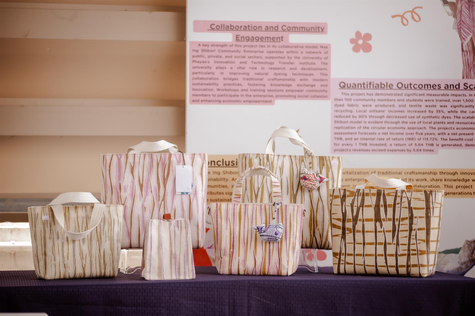 Highlighted projects included natural-dye Shibori textiles in Mae Ing, community development initiatives at Kad Kong Noi, culturally inspired fabric doll innovation in Chiang Muan, and bio-industry products in Phrae province. These initiatives demonstrate the successful translation of research into real-world benefits for local communities.