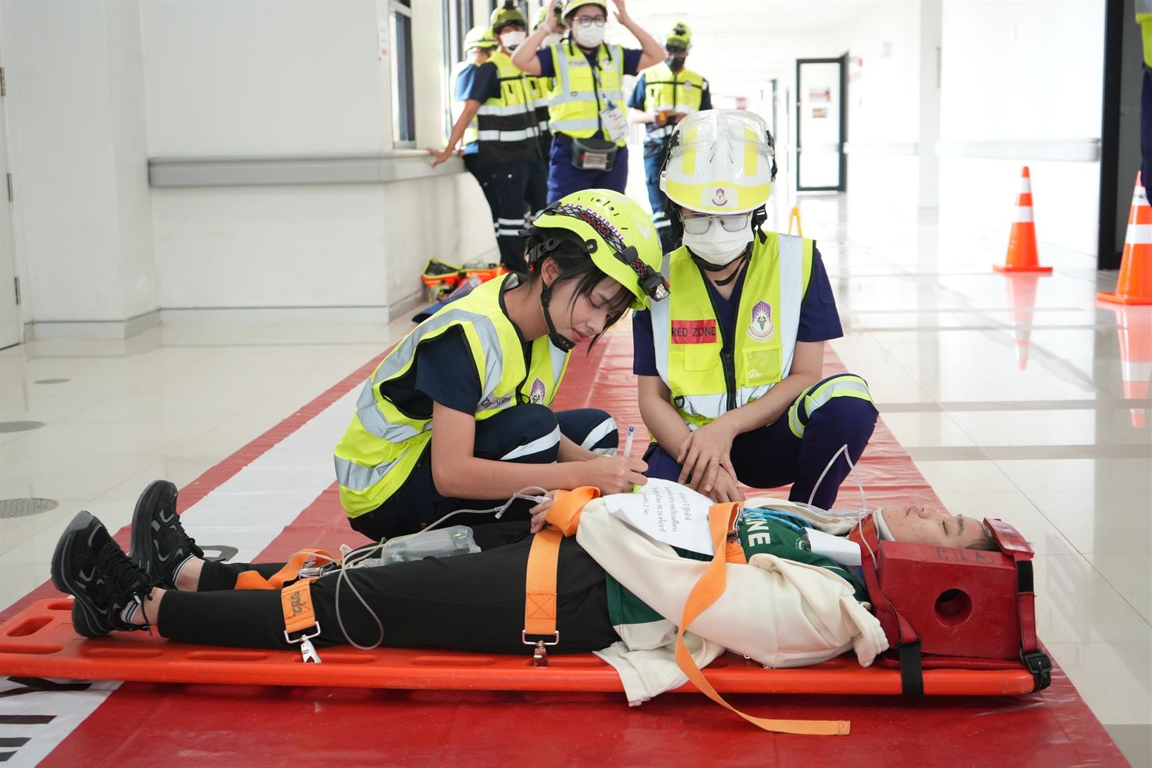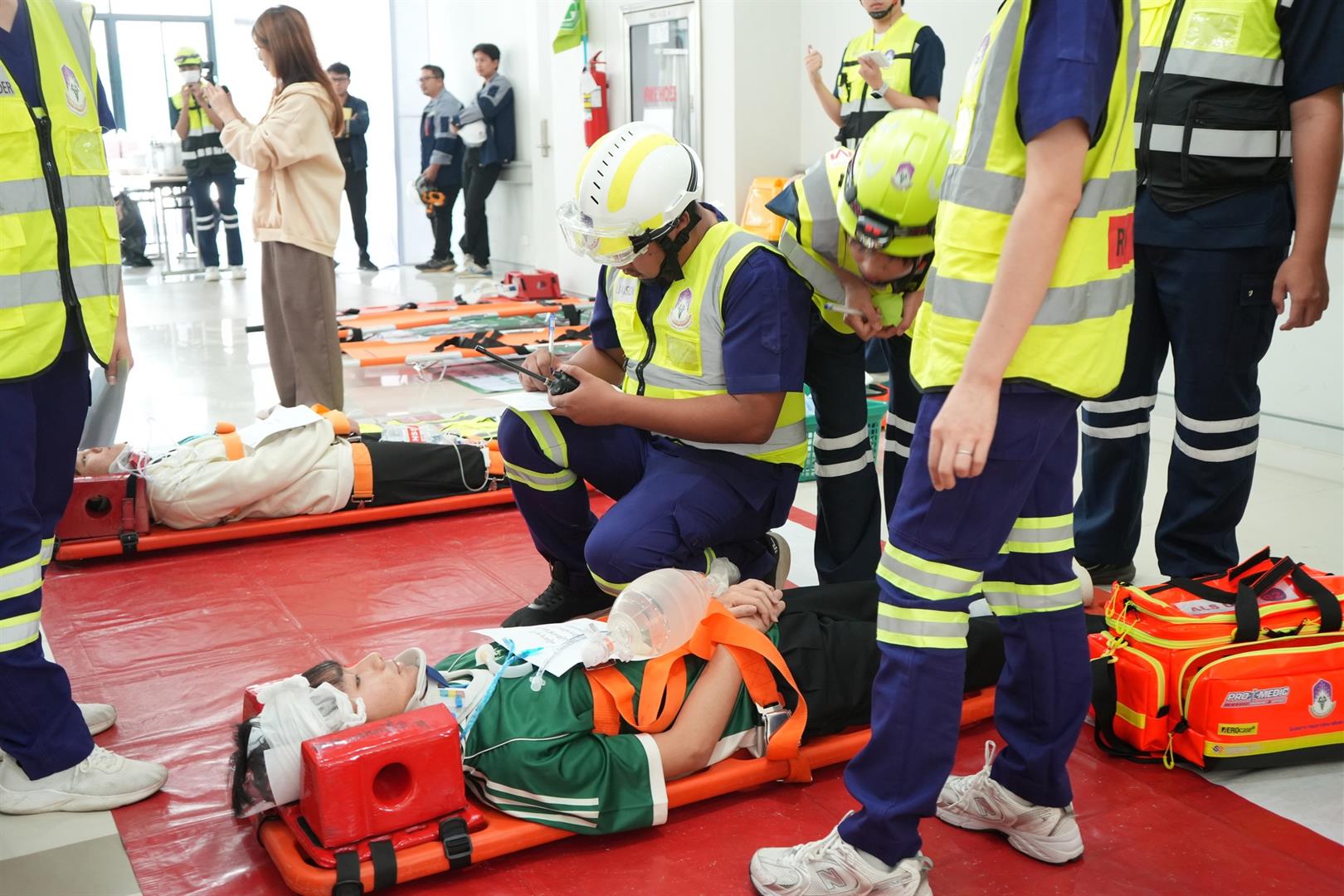 Participants engaged in realistic simulation exercises designed to replicate emergency situations. The drill received strong collaboration from partner organizations, including Luecha Phayao Foundation, the Disaster Prevention and Mitigation Unit of Mae Na Ruea Subdistrict Administrative Organization, and Champawai Emergency Rescue Unit.
