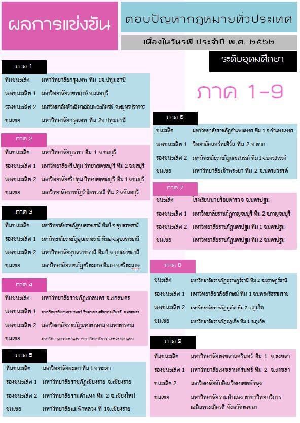 นิสิตคณะนิติศาสตร์ นายณัฐพล ทองใบ นางสาวสิริญญา พรมตัน นางสาวนิรชา ธรรมสิทธิ์ ได้รับรางวัลชนะเลิศ และ นายอดุลวิทย์ บุญธิมา นายพงษ์สิทธิ์ ร้องเก็ต นายวิริยะ จันทร์ศิริ ได้อันดับ 5 การแข่งขันตอบปัญหากฎหมายของภาค 5 ในระดับอุดมศึกษา นำทีมโดยผู้ช่วยศาสตราจารย์สุวิทย์ ปัญญาวงศ์ อาจารย์วัชรพงษ์ เขื่อนพันธ์ อาจารย์ประจำคณะนิติศาสตร์ จัดโดยสำนักงานศาลยุติธรรม เนื่องในวันรพีประจำปี พ.ศ. 2562 วันที่ 16 สิงหาคม 2562 ณ โรงแรมวินทรี ซิตี้ รีสอร์ท จังหวัดเชียงใหม่ ทั้งนี้ทีมชนะเลิศจะได้รับคัดเลือกให้ไปแข่งขันระดับประเทศในวันที่ 14 กันยายน 2562 ชิงรางวัลรวมกว่า 500,000 บาท ณ สถาบันพัฒนาข้าราชการฝ่ายตุลาการศาลยุติธรรม กรุงเทพมหานครต่อไป