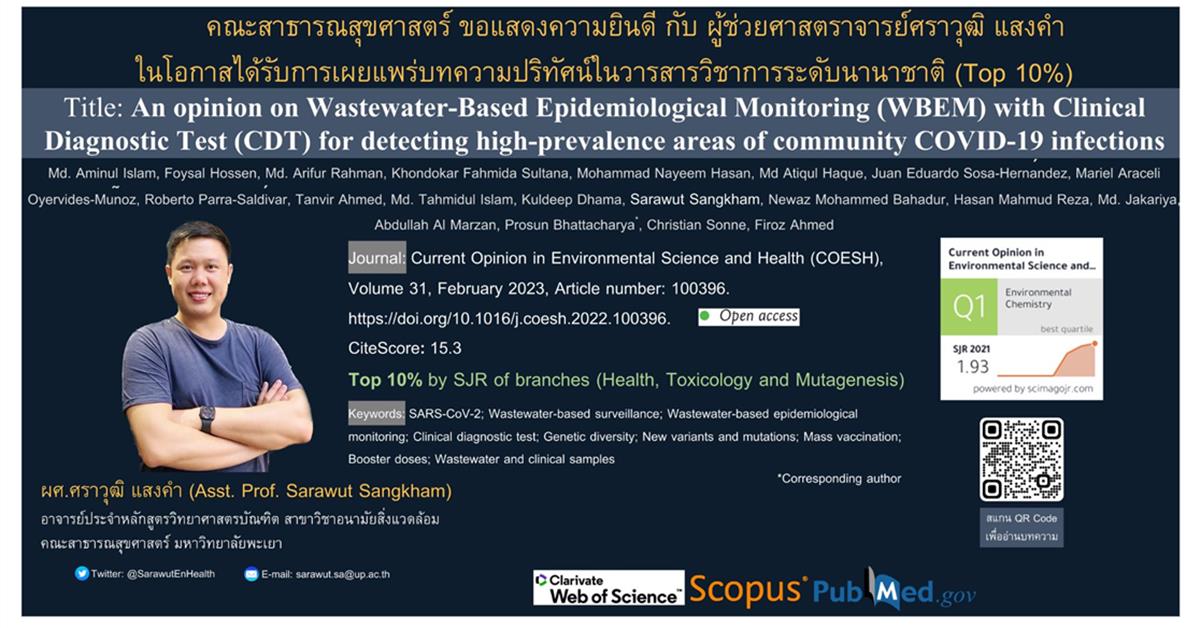 ขอแสดงความยินดี กับผู้ช่วยศาสตราจารย์ศราวุฒิ แสงคำ ที่ได้รับการตีพิมพ์ผลงานในระดับนานาชาติ เรื่อง An opinion on Wastewater-Based Epidemiological Monitoring (WBEM) with Clinical Diagnostic Test (CDT) for detecting high-prevalence areas of community COVID-19 Infections