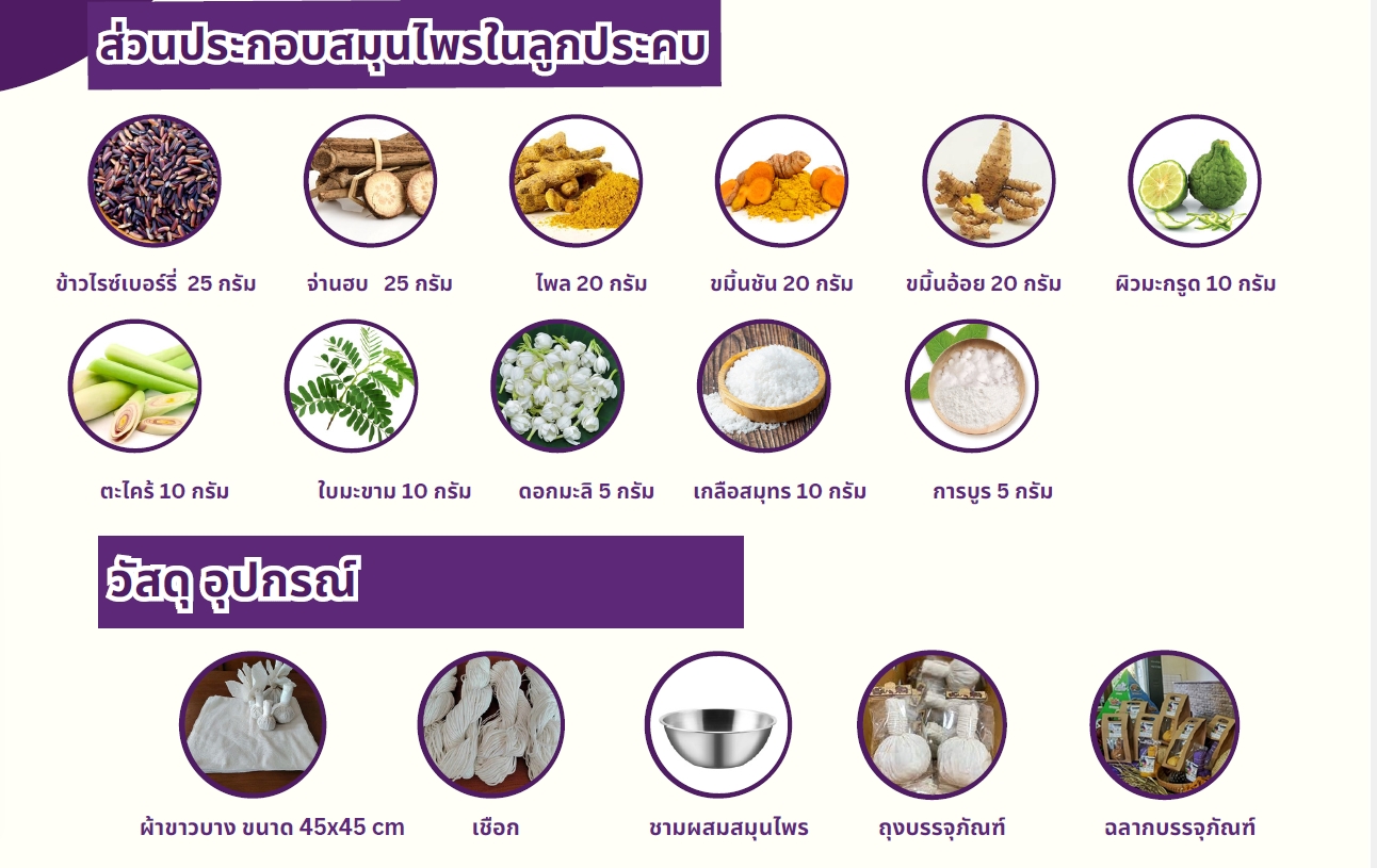 ส่วนประกอบหลักของลูกประคบสมุนไพรเมี่ยนผสมข้าวไรซ์เบอร์รี ประกอบด้วยสมุนไพรที่หาได้ในท้องถิ่น อาทิ จ่านฮบ ไพล ขมิ้นชัน ขมิ้นอ้อย ผิวมะกรูด ตะไคร้ ใบมะขาม ดอกมะลิ เกลือสมุทร การบูร และข้าวไรซ์เบอร์รี สมุนไพรเหล่านี้ไม่เพียงช่วยบรรเทาอาการปวดเมื่อย แต่ยังเสริมคุณค่าเชิงเศรษฐกิจและการตลาด เนื่องจากสามารถพัฒนาเป็นผลิตภัณฑ์สุขภาพที่มีเอกลักษณ์ของท้องถิ่น