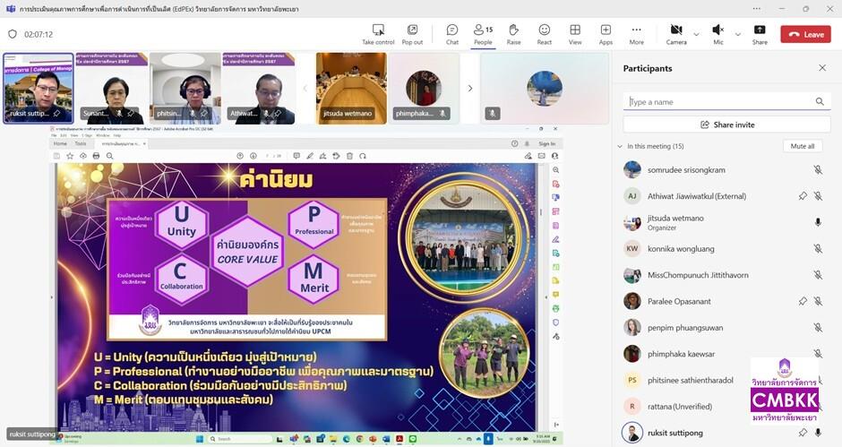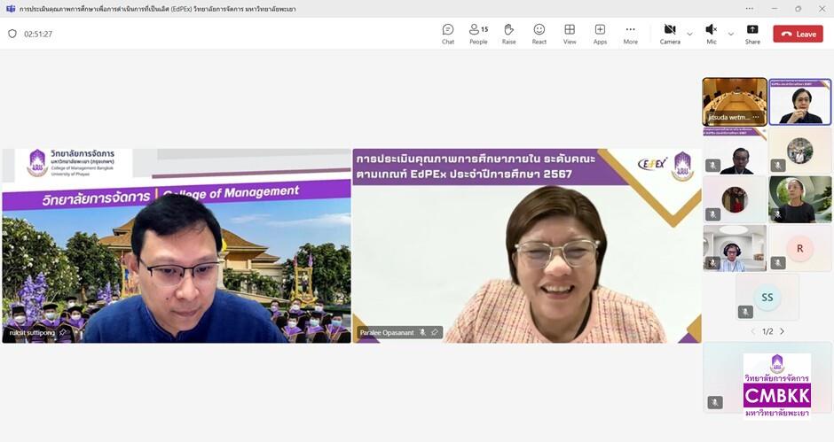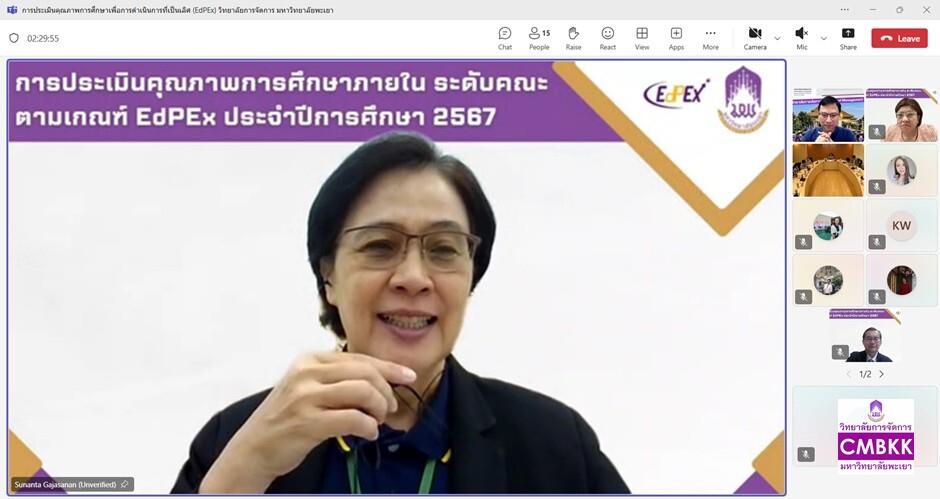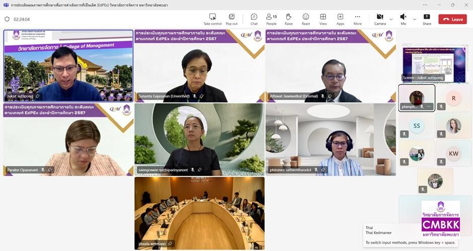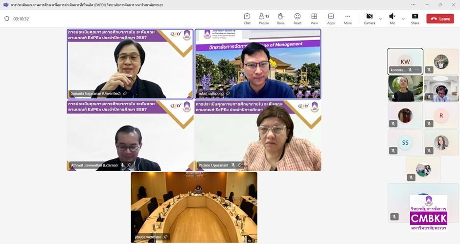 วันศุกร์ที่ 26 กันยายน 2568 วิทยาลัยการจัดการ มหาวิทยาลัยพะเยา รับการตรวจประเมินคุณภาพการศึกษาภายใน ระดับคณะ ตามเกณฑ์ EdPEx ประจำปีการศึกษา 2567 ในรูปแบบ Hybrid โดย Onsite ณ ห้องประชุม L806 และ Online ผ่านสื่ออิเล็กทรอนิกส์ จากระบบ Microsoft Teams ได้รับเกียรติจาก อาจารย์สุนันทา คเชศะนันทน์ ที่ปรึกษา วิทยาลัยบัณฑิตศึกษาจีน PIM สถาบันการจัดการปัญญาภิวัฒน์ เป็นประธานกรรมการประเมินฯ พร้อมด้วย รองศาสตราจารย์ ดร.อธิวัฒน์ เจี่ยวิวรรธน์กุล รองผู้อำนวยการฝ่ายบริหาร สถาบันแห่งชาติเพื่อการพัฒนาเด็ก และครอบครัวมหาวิทยาลัยมหิดล และ ผู้ช่วยศาสตราจารย์ ดร.ปะราลี โอภาสนันท์ อาจารย์ประจำคณะพยาบาลศาสตร์ มหาวิทยาลัยพะเยา เป็นผู้ประเมินคุณภาพภายใน โดยมี ผู้ช่วยศาสตราจารย์ ดร.พิชญ์สินี เสถียรธราดล รองคณบดีฝ่ายบริหาร คณะศิลปศาสตร์ มหาวิทยาลัยพะเยา และ ผู้ช่วยศาสตราจารย์ ดร.แสงระวี สุทธิปริญญานนท์ คณะเภสัชศาสตร์ มหาวิทยาลัยพะเยา ร่วมเป็นผู้สังเกตการณ์ประเมินฯ