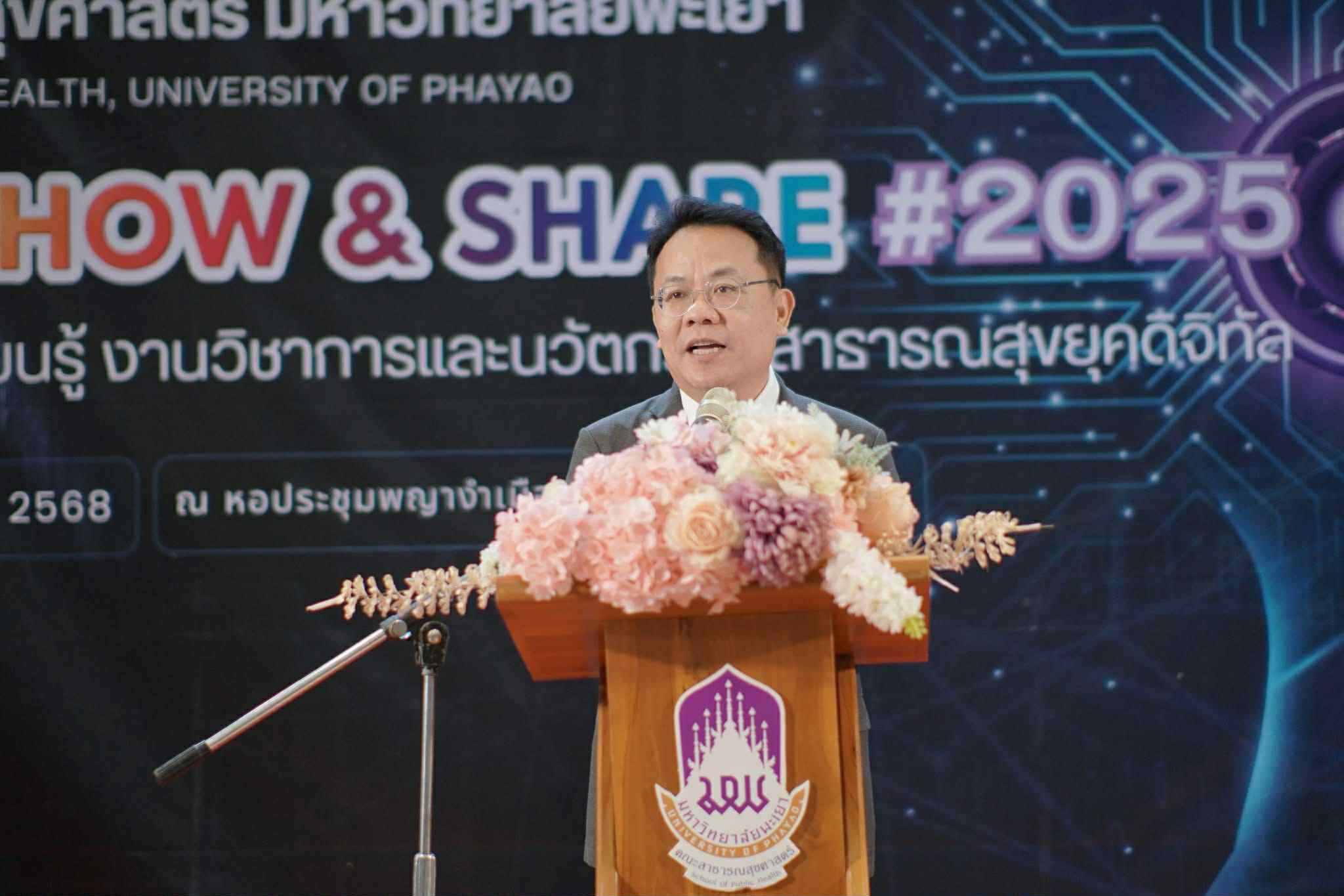 วันที่ 22 กันยายน 2568 รองศาสตราจารย์ ดร.สุภกร พงศ์บางโพธิ์ อธิการบดีมหาวิทยาลัยพะเยา มอบหมายให้ ศาสตราจารย์ ดร.เสมอ ถาน้อย รองอธิการบดีฝ่ายวิจัยและนวัตกรรม เป็นประธานเปิดงาน “PHUP Show & Share #2025: เวทีแลกเปลี่ยนเรียนรู้ งานวิชาการและนวัตกรรมสาธารณสุขยุคดิจิทัล” จัดโดยคณะสาธารณสุขศาสตร์ มหาวิทยาลัยพะเยา โดยมีผู้ช่วยศาสตราจารย์ ดร.สมคิด จูหว้า คณบดีคณะสาธารณสุขศาสตร์ กล่าวรายงานวัตถุประสงค์การจัดโครงการ ณ หอประชุมพญางำเมือง