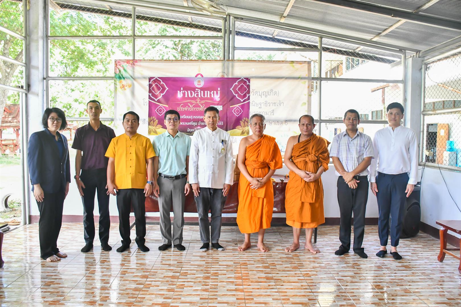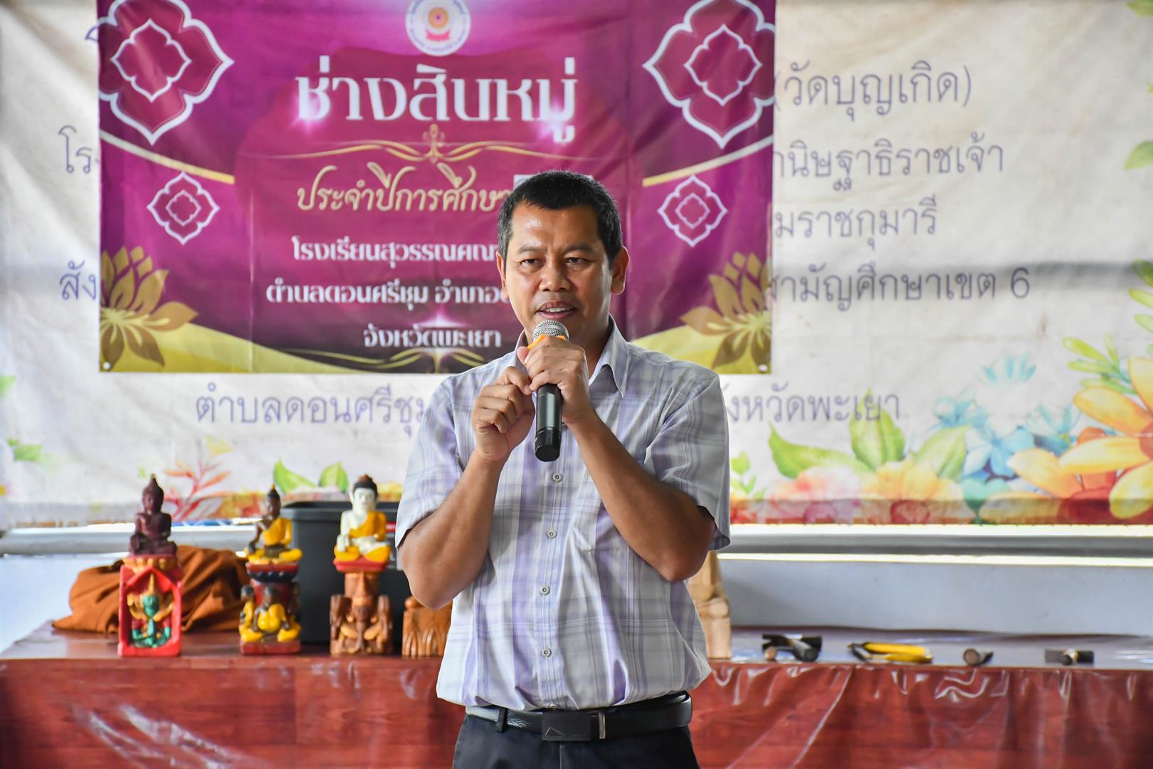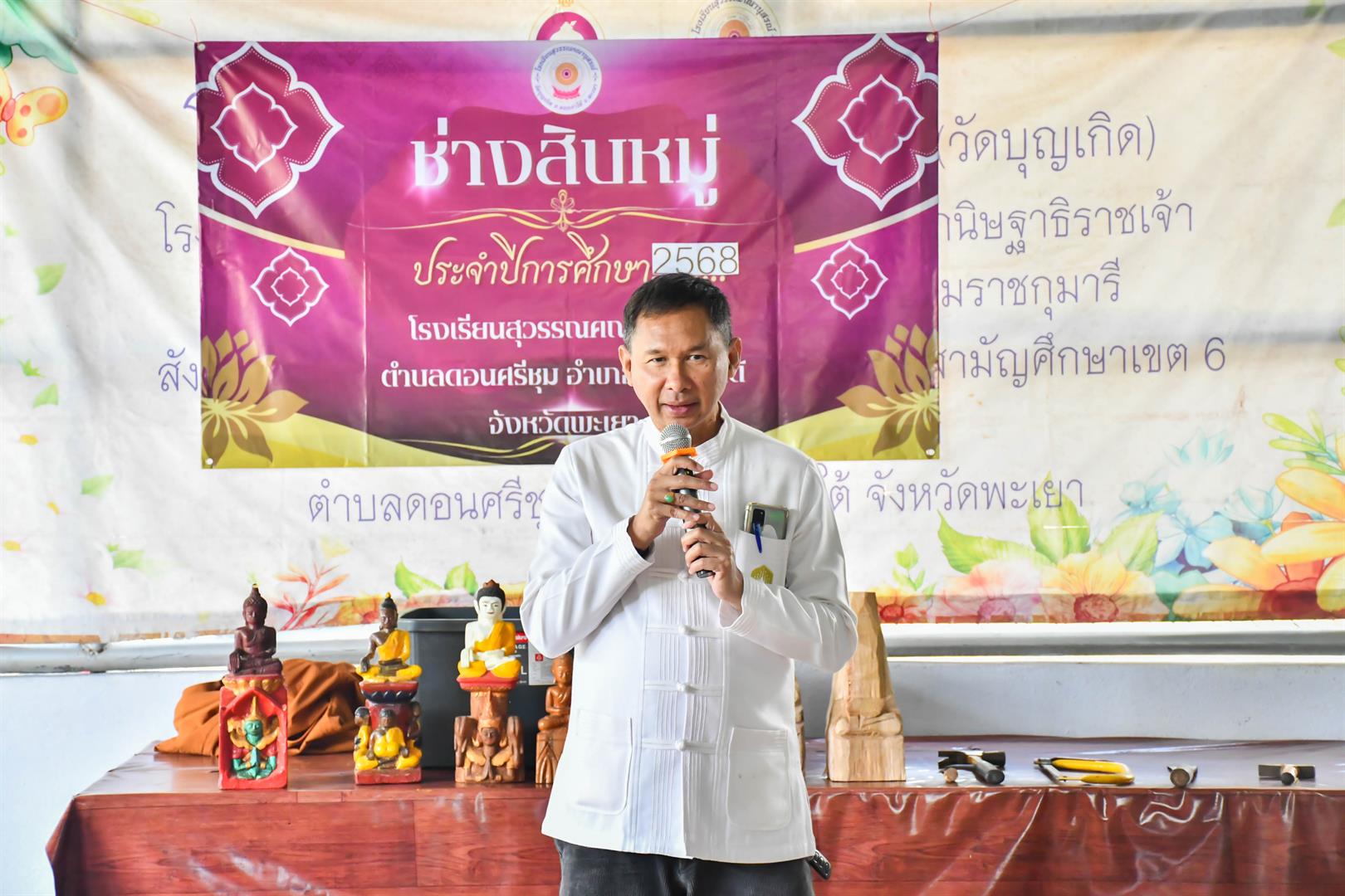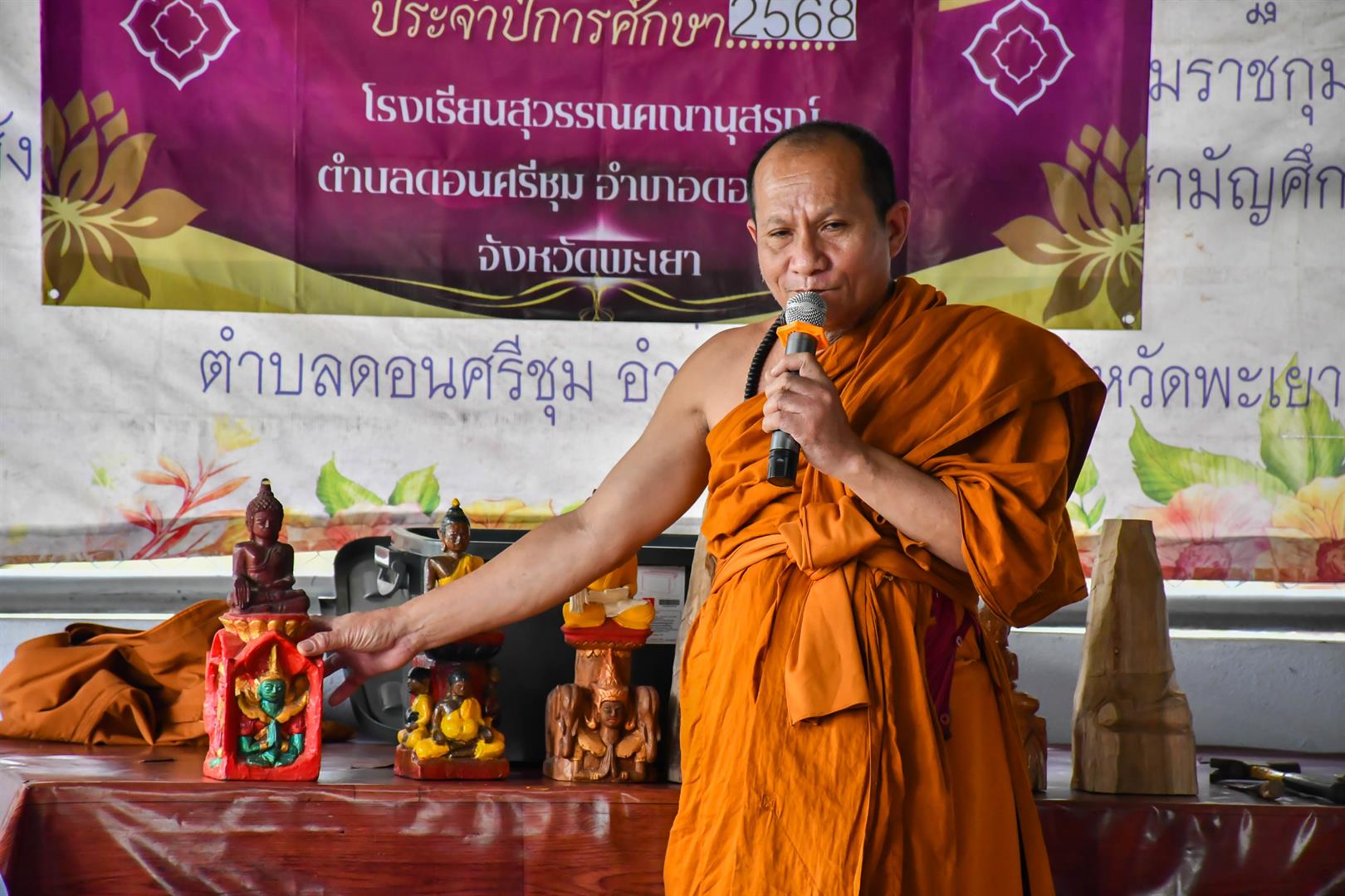 On September 3, 2025, Assistant Professor Dr. Sunthon Khlai-Um, the Associate Dean for Administration and Student Quality Development, along with Assistant Professor Dr. Watchara Jatuporn, the Associate Dean of Research and Academic Services in Area-based, Assistant Professor Dr. Natthawut Subphaso, Assistant Dean, Mr. Wittavas Thiwai, the Head of Planning, and Mrs. Chutimadee Chaibao, the Educator, conducted the project to conserve and preserve local wisdom for community development, at Dok Kham Tai Subdistrict for sustainable development, based on the Baworn principle, Dissemination of Lanna wisdom on ‘Sacred Wooden Buddha Carving’ Wat Bun Hom, at Suwankhana Nusorn School, Don Si Chum Subdistrict, Dok Khamtai District, Phayao Province. It was welcomed by the director of Suwankhana Nusorn School, Phrakhu Wisit Kittanuyut, and the group. It was also honored by Phra Manit Pasanno, a community scholar in sacred wooden Buddha carving, who served as a workshop lecturer on the topic ‘Lanna Wisdom: The Conservation of Sacred Wooden Buddha Images.’ The objective of this project is to conserve the Sacred Wooden Buddha Image of Wat Bun Hom for sustainability, to develop and promote cultural tourism in Dok Khamtai Subdistrict, Dok Khamtai District, Phayao Province, and to strengthen the community economy based on culture and local wisdom. The project also aims to establish community learning centers as a foundation for participatory learning among educational institutions, local administrative organizations, and community members, in alignment with the University of Phayao’s mission of ‘Wisdom for Community Empowerment. It corresponded with the Sustainable Development Goals (SDGs): SDG 4: Promote learning opportunities and ensure inclusive and equitable quality education (Quality Education), SDG 8: Promote decent employment and foster economic growth (Decent Work and Economic Growth), SDG 11: Build safe, resilient, and sustainable cities and communities (Sustainable Cities and Communities), and SDG 17: Strengthen partnerships for sustainable development (Partnerships for the Goals).