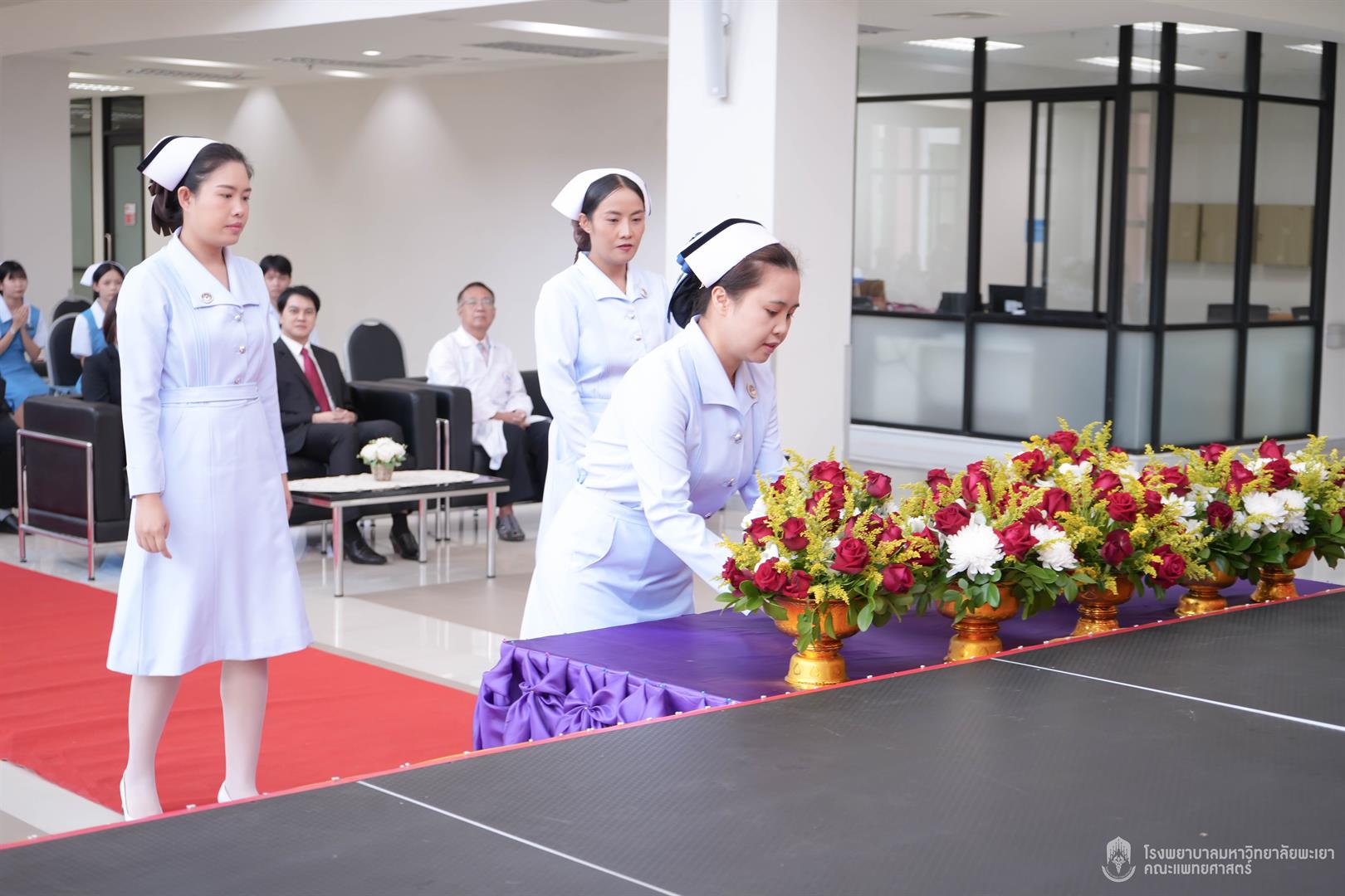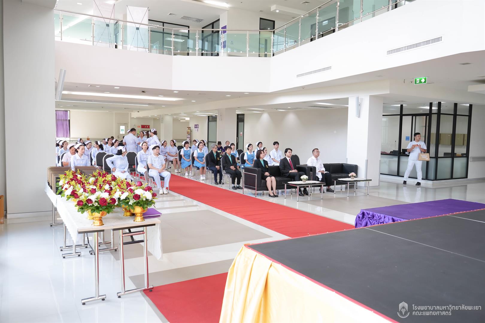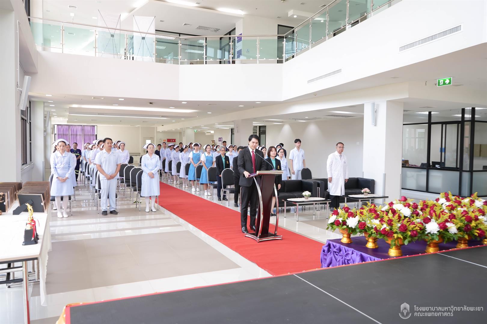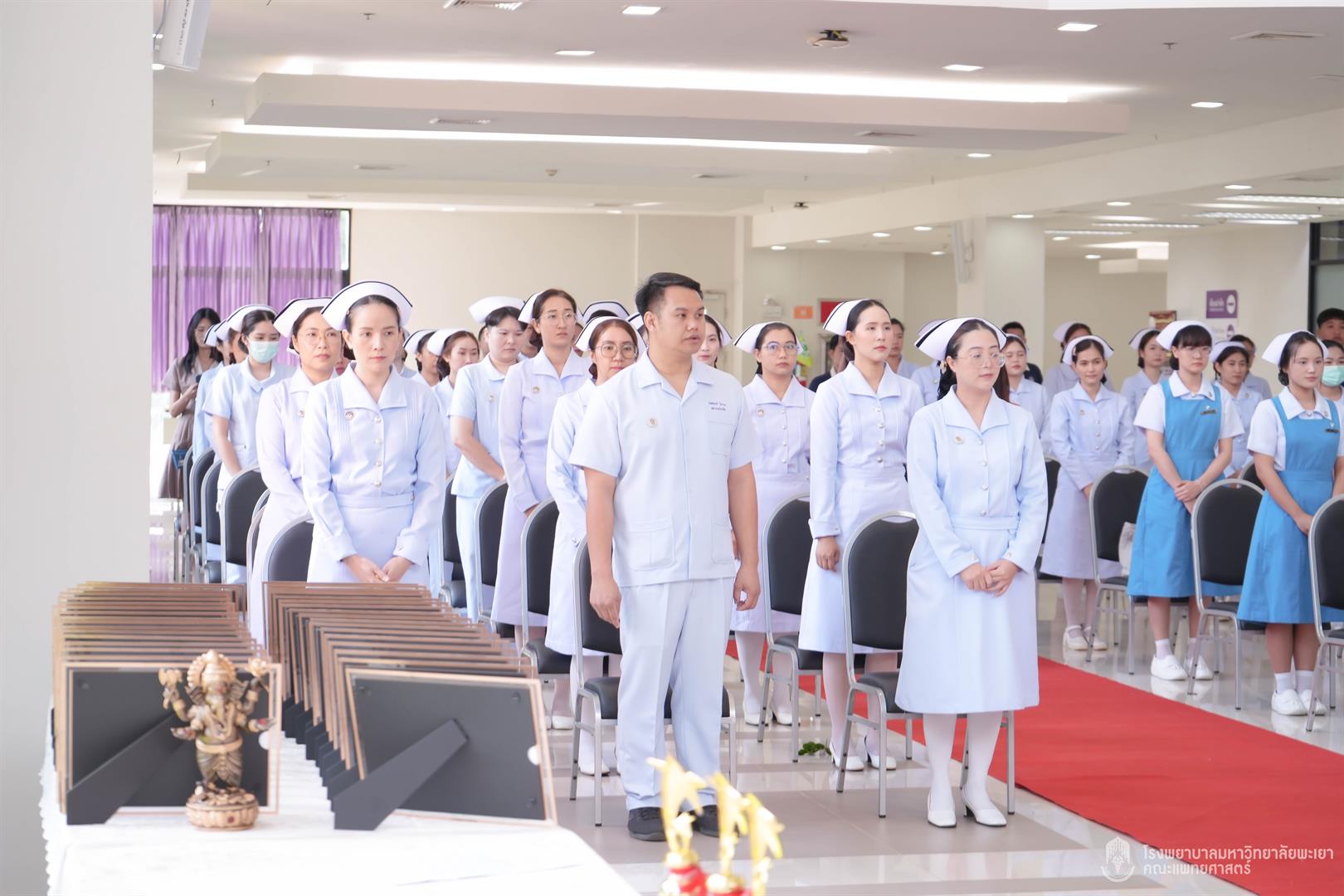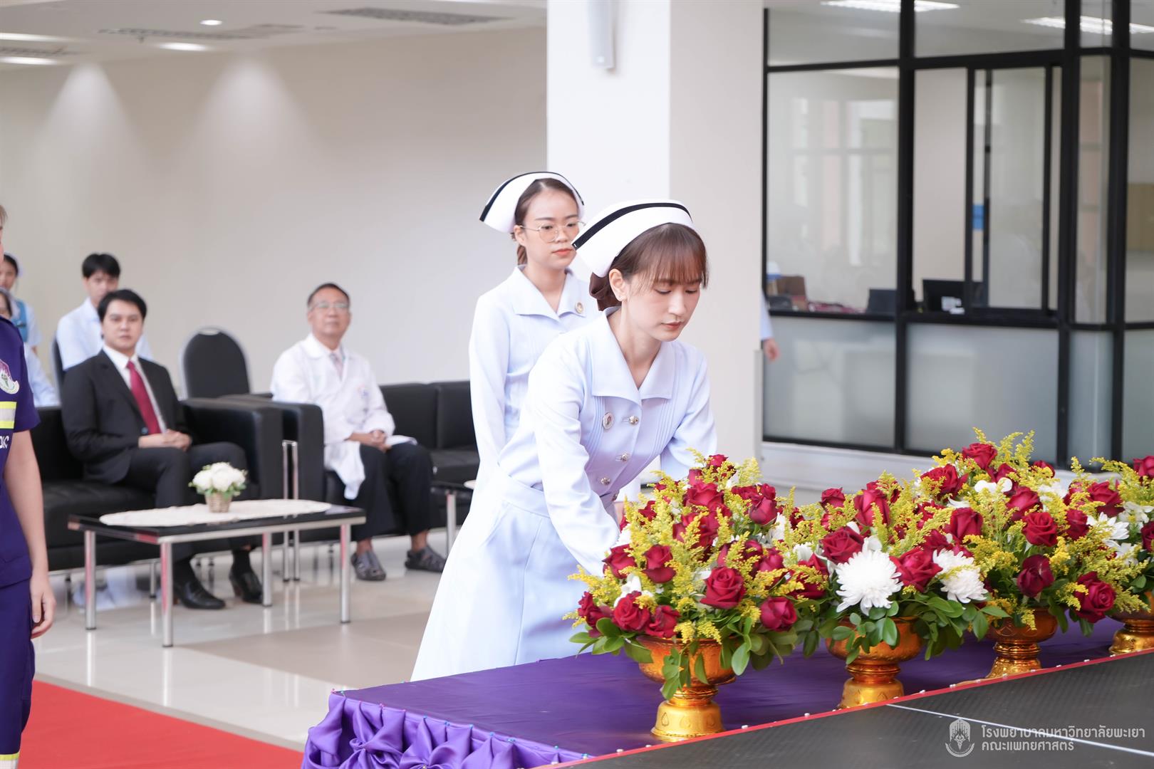 ทั้งนี้มี ดร.นภาพร เอี่ยมละออ รองคณบดีคณะพยาบาลศาสตร์ มหาวิทยาลัยพะเยา พร้อมด้วยบัคลากร นิสิต ที่เกี่ยวข้อง เข้าร่วมพิธีพร้อมเพรียงกัน