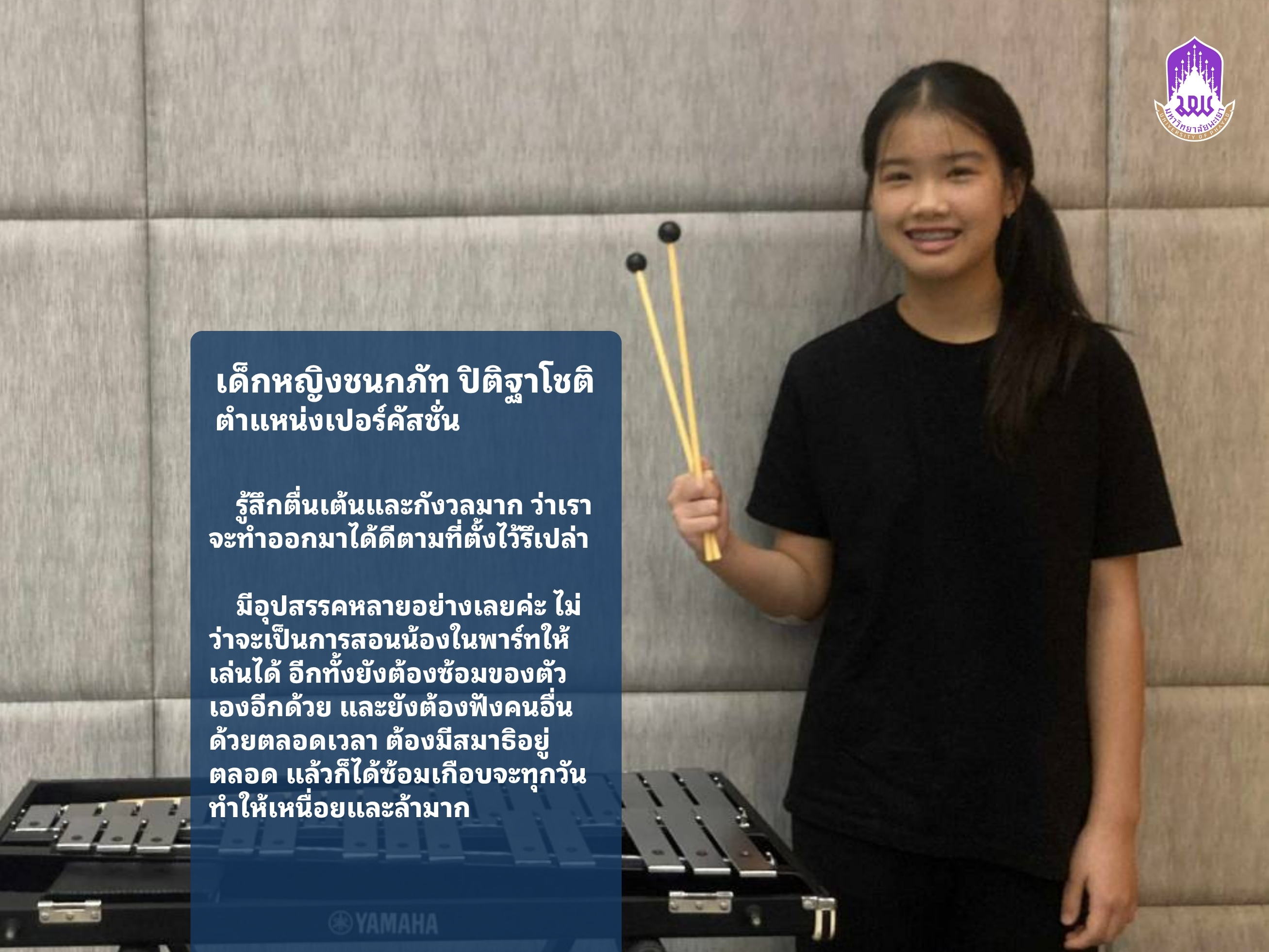 ข้อมูล/บทสัมภาษณ์: อาจารย์ชลวิทย์ บุญจันทร์ อาจารย์ประจำโรงเรียนสาธิตมหาวิทยาลัยพะเยา (วาทยกรและผู้ฝึกสอน) / เด็กหญิงชนกภัท ปิติฐาโชติ นักเรียนโรงเรียนรสาธิตมหาวิทยาลัยพะเยา (เปอร์คัสชั่น)