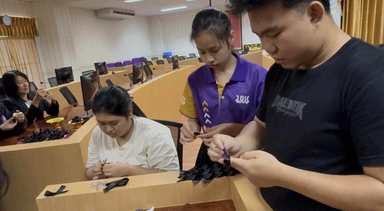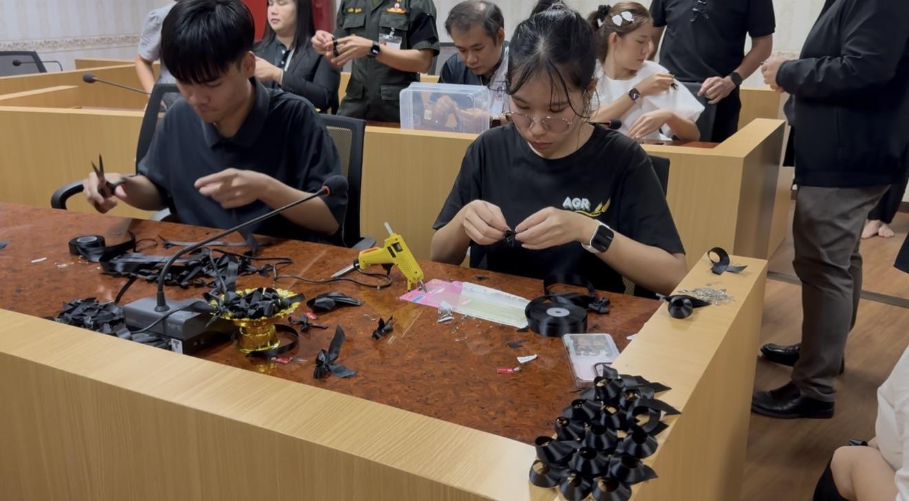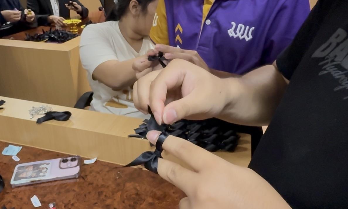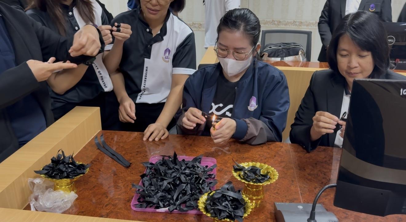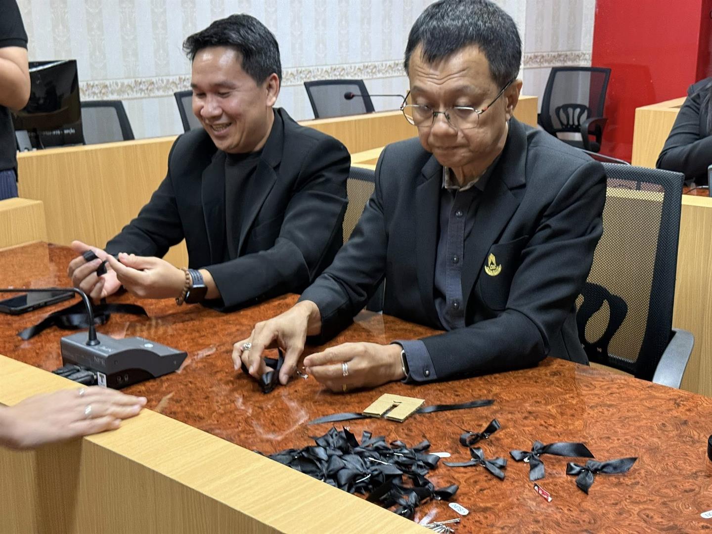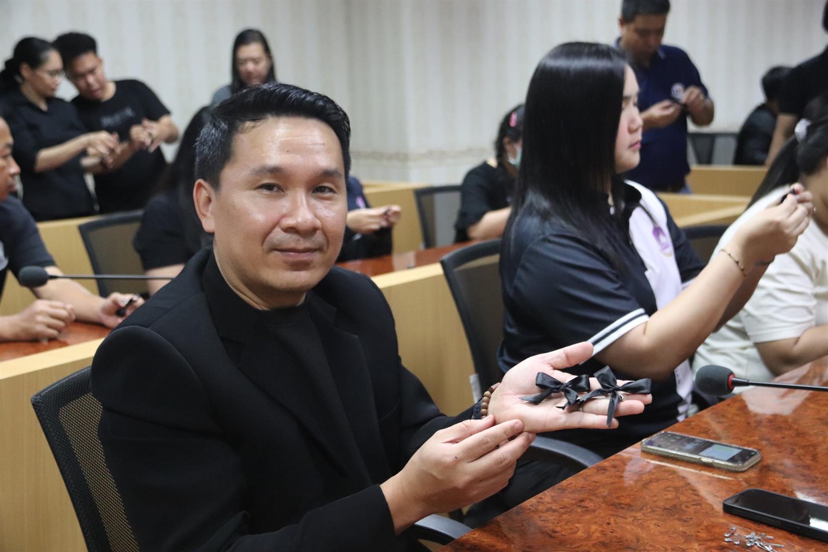 วันที่ 28 ตุลาคม 2568 รองศาสตราจารย์ ดร.ดิเรก ธีระภูธร รองอธิการบดีฝ่ายสื่อสารองค์กร พร้อมด้วยนายพิเชษฐ ถูกจิตร ผู้อำนวยการกองกิจการนิสิต ร่วมกับบุคลากรและนิสิตจิตอาสา จัดกิจกรรม “ทำโบว์สีดำ ไว้อาลัย” เพื่อแจกจ่ายให้แก่นิสิตและประชาชนทั่วไป สำหรับผู้ที่ไม่สามารถแต่งกายชุดดำหรือชุดสุภาพ เพื่อร่วมแสดงความอาลัยแด่ สมเด็จพระนางเจ้าสิริกิติ์ พระบรมราชินีนาถ พระบรมราชชนนีพันปีหลวง