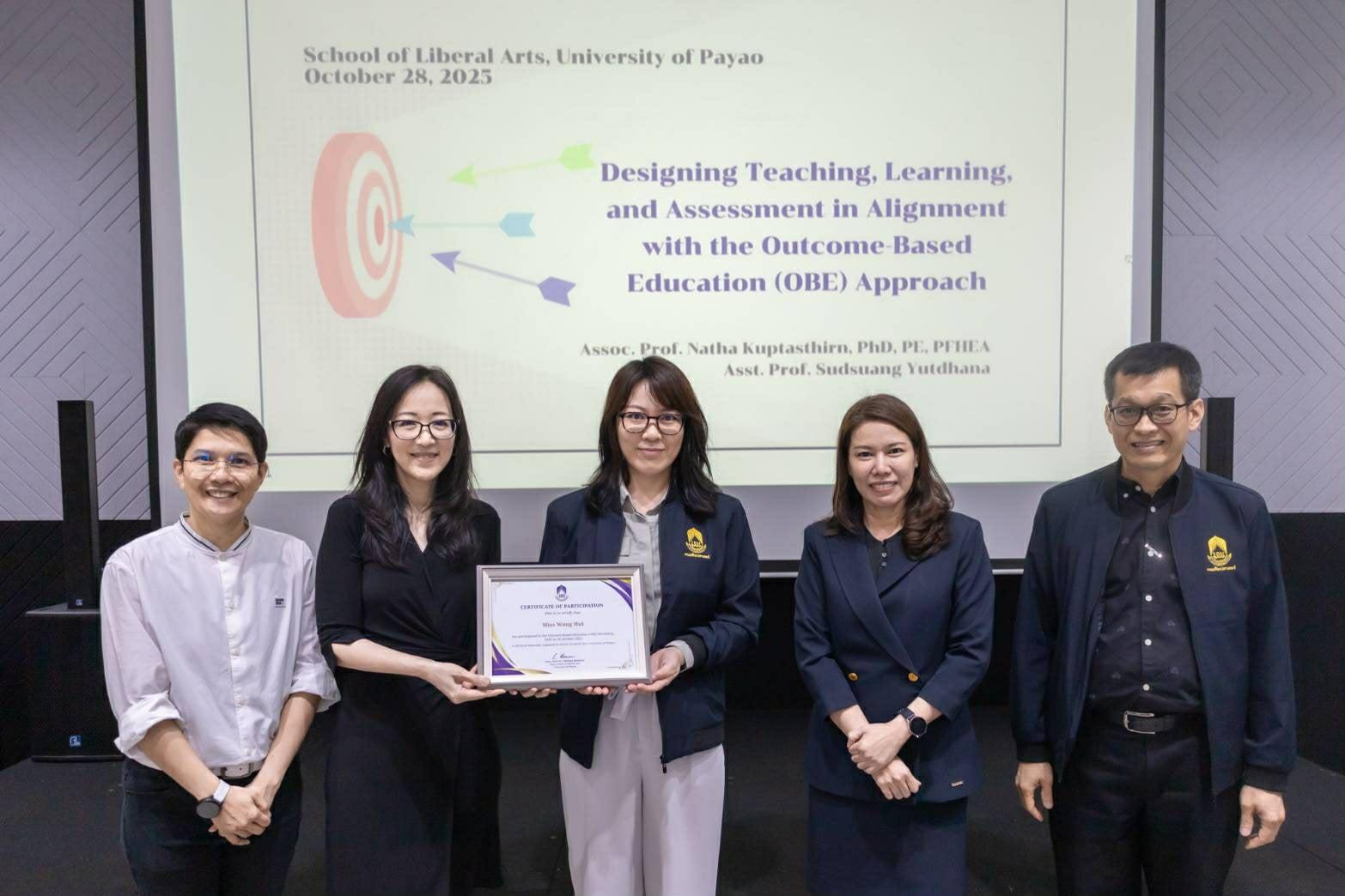 On October 27, 2025, the School of Liberal Arts, University of Phayao, organized a workshop on “Outcome-Based Education (OBE)” beginning with a moment of silence to pay tribute to Her Majesty Queen Sirikit The Queen Mother, in remembrance of her boundless grace and contributions to the nation. Asst. Prof. Dr. Chittima Kaweera, Dean of the School of Liberal Arts, delivered the opening remarks and explained that the workshop aimed to enhance the teaching and learning capacity of international lecturers in applying Outcome-Based Education principles for effective classroom management and assessment, particularly in developing students’ foreign language communication skills in French, Chinese, Japanese, and English.