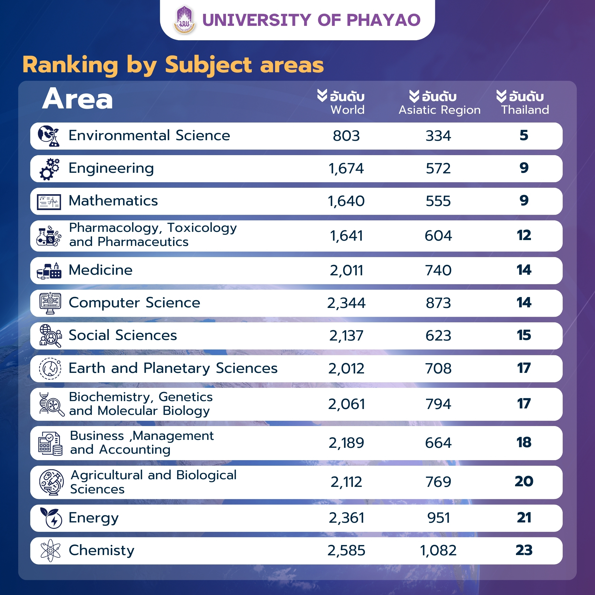 ทั้งนี้ ในปี 2025 (SJR) ยังได้มีการจัดอันดับสาขาของมหาวิทยาลัย โดยมหาวิทยาลัยพะเยา มี 13 สาขา ที่ถูกจัดอันดับโลก แสดงให้เห็นถึงพัฒนาการด้านคุณภาพวิชาการที่เติบโตอย่างยั่งยืน มหาวิทยาลัยพะเยายังคงมุ่งมั่นพัฒนาศักยภาพด้านการศึกษา วิจัย และนวัตกรรม เพื่อก้าวสู่เป้าหมายการเป็นมหาวิทยาลัยชั้นนำในอนาคต